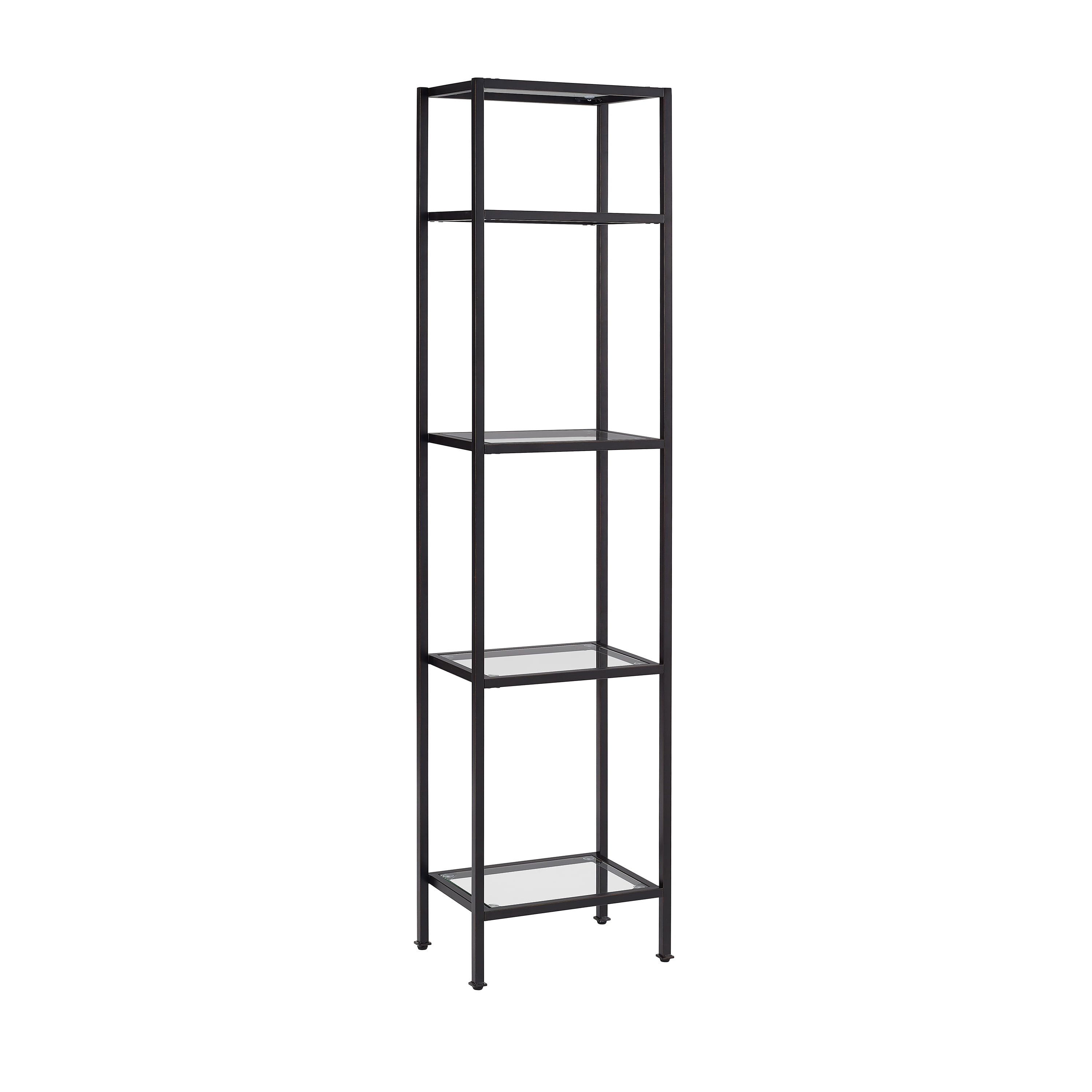 Stylish and modern, the Aimee Narrow Etagere Bookcase is an eye-catching addition to any home. With a sturdy yet sleek steel frame, the bookcase can be paired with a variety of décor. The open, tempered glass shelves of the modern bookshelf are perfect for display and organization without overwhelming the room.