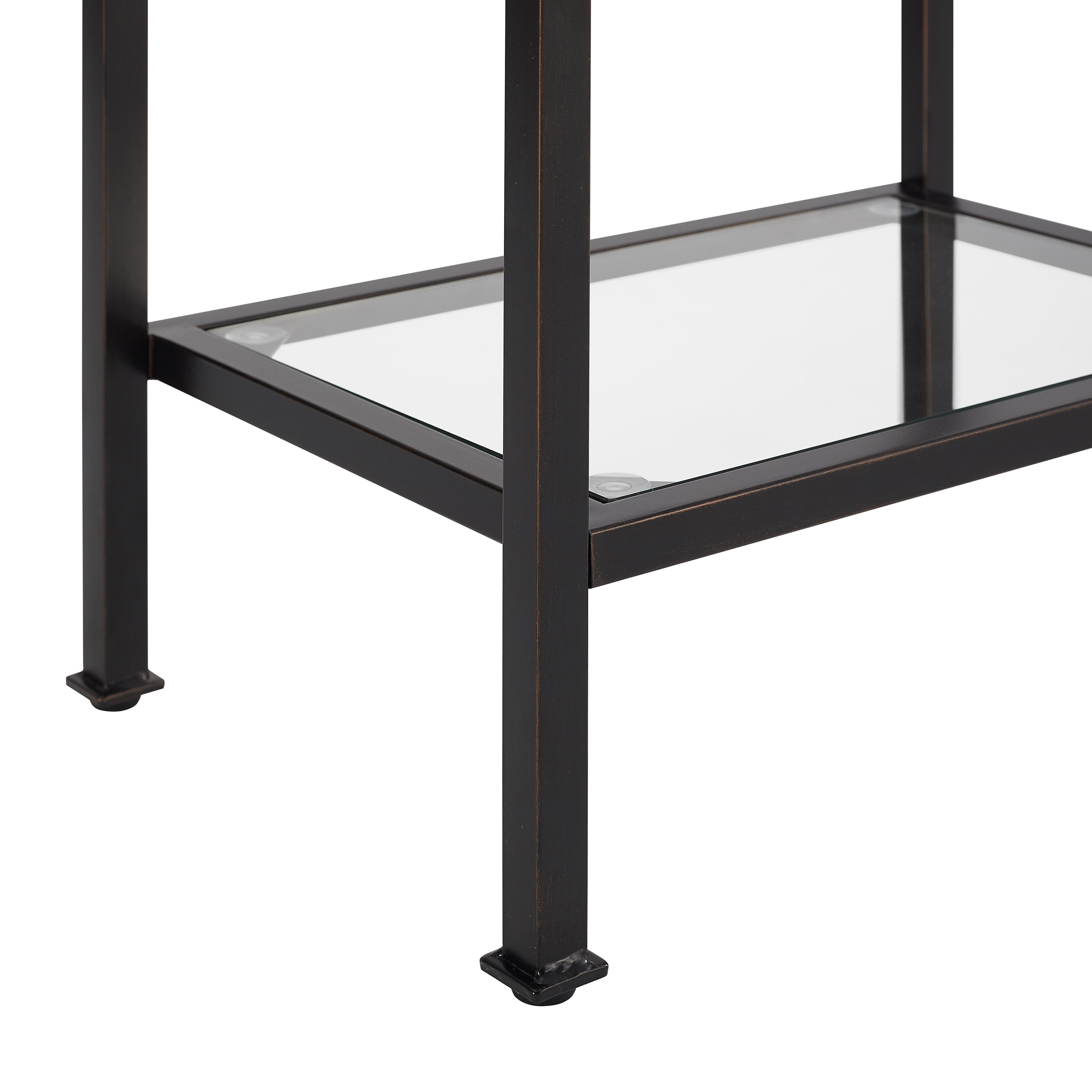 Art Deco inspired design Oil-rubbed bronze finish Frame is constructed of sturdy steel Four tempered glass shelves Upscale display and storage for any room Modular design allows multiple units to be paired together Pairs well with industrial, rustic, traditional and modern farmhouse decor