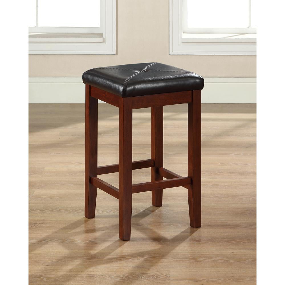 Comfort and style combined. The upholstered square seat stool features solid hardwood construction. The cushioned seat is upholstered in simulated leather, that is stain and spill-proof. The 24″ height makes this stool perfect for a 36″ height dining table or counter seating. Features: Set includes: 2 stools Material: Solid rubberwood 90%, PVC 10% Finish: Mahogany, black Bar stool seats upholstered in black vegan leather Wood stools have a backless upholstered seat Bar stools can be used with counter height tables and kitchen islands Four solid hardwood leg stretchers for durability Pairs well with traditional and farmhouse decor Anti-tip hardware: No Indoor furniture Solid hardwood legs and stretchers Generous seating area for comfort Perfect height for 36″ height dining/ pub tables or counter seating Durable stain-proof simulated leather seat Hand-rubbed, multi-step finish ISTA 3A certified Specifications: Product Dimensions: 24.25″H x 14.75″W x 14.75″D Product Weight: 5.76 lbs Seat Dimensions: (Foam Cushioned Thickness) 2.75″ Product Dimensions: (Floor Clearance) 5.62″
