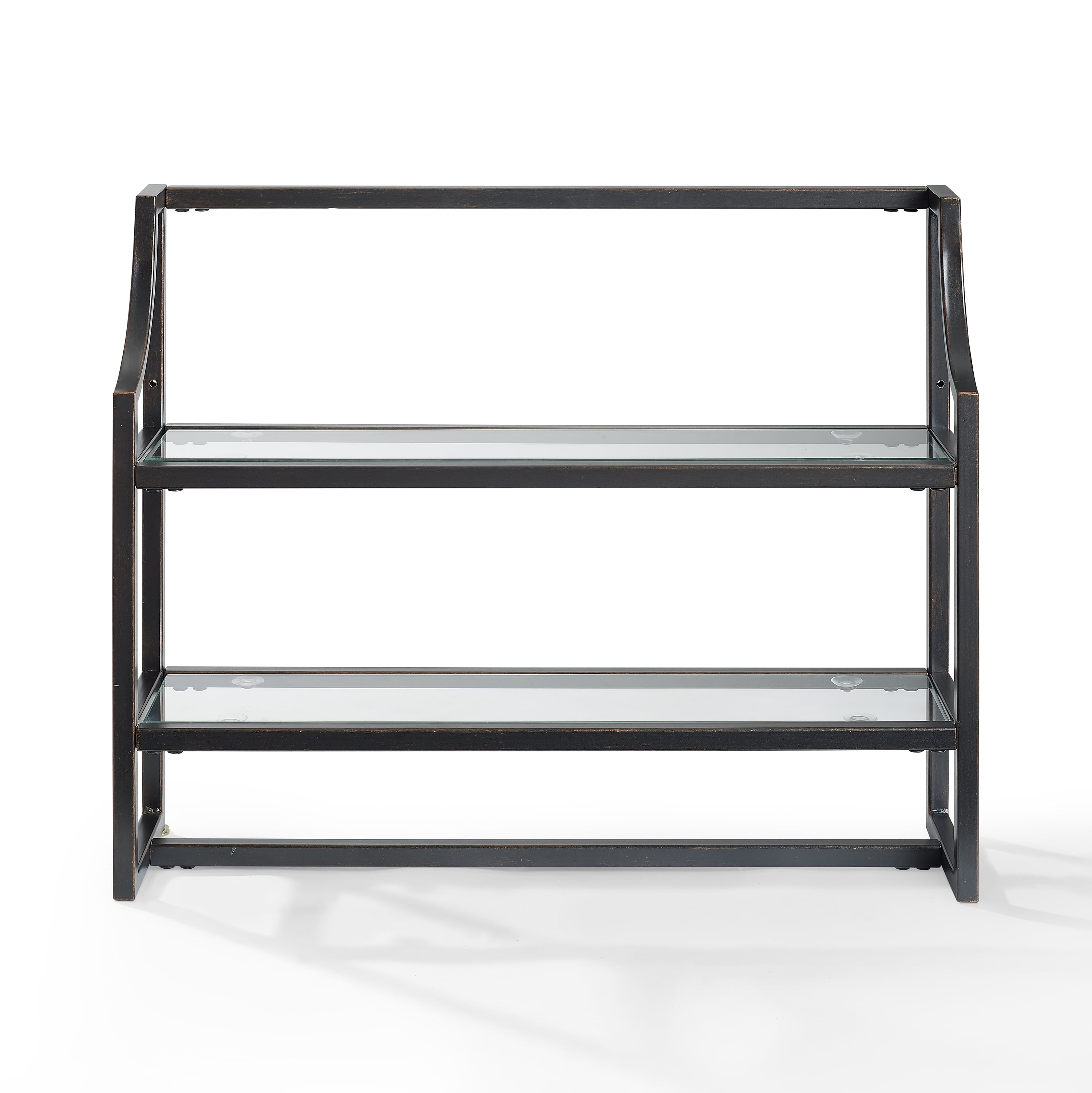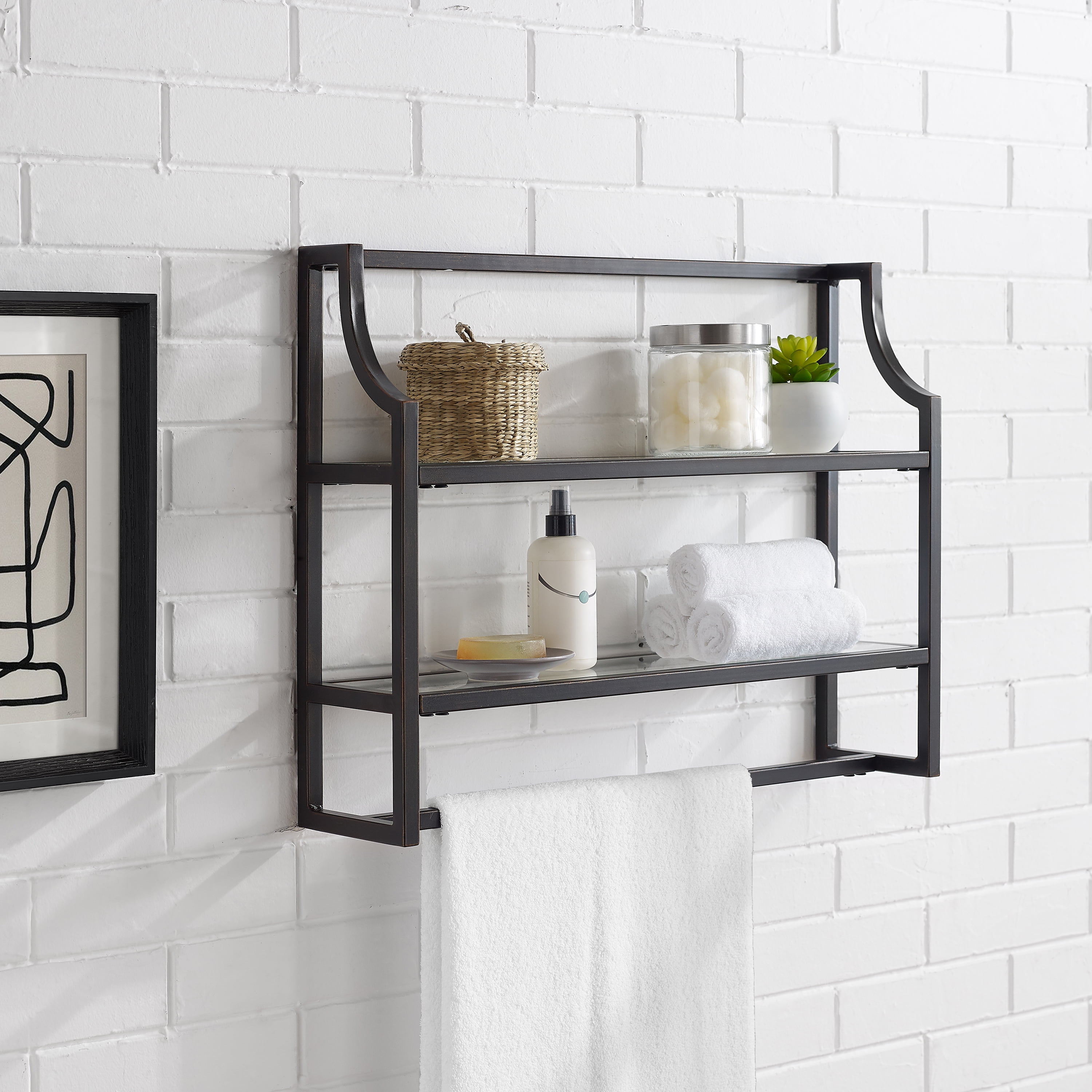 Stylish and modern, the Aimee wall shelf is an eye-catching and practical storage solution. Featuring two tempered glass shelves and a towel bar, this wall shelf is perfect for storing bathroom essentials without overwhelming the space. The sculptured steel frame adds visual interest, making this a great addition to any bathroom. Features: Material: Steel metal 80%, glass 20% Finish: Oil rubbed bronze Art deco inspired bathroom storage Frame is constructed of sturdy steel Includes a bar for hanging towel storage Pairs well with industrial, rustic, traditional and modern farmhouse decor Anti-tip hardware: No Indoor furniture Two tempered glass shelves for storage or display Includes a towel bar Specifications: Product Dimensions: 19″H x 24″W x 6″D Product Weight: 10.12 lbs Number of Shelves: 2 Shelf Weight Capacity: (Total) 50 lbs, (per sheft) 20 lbs
