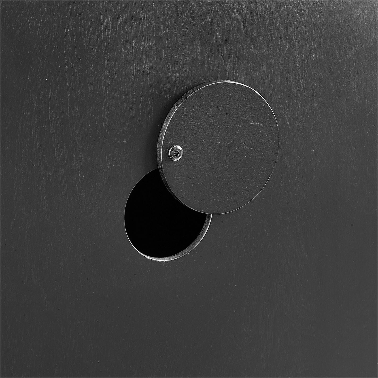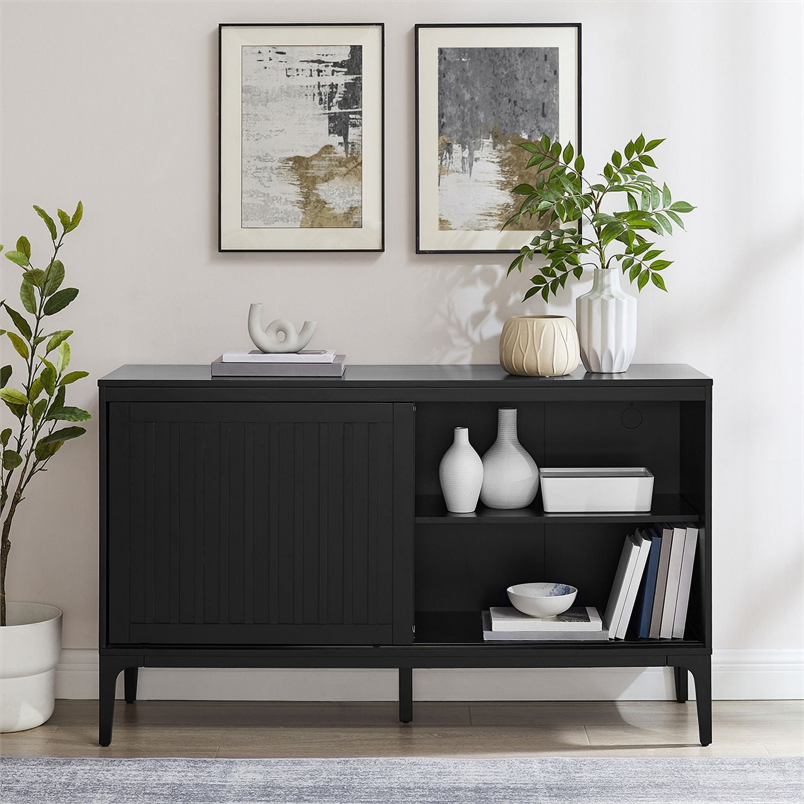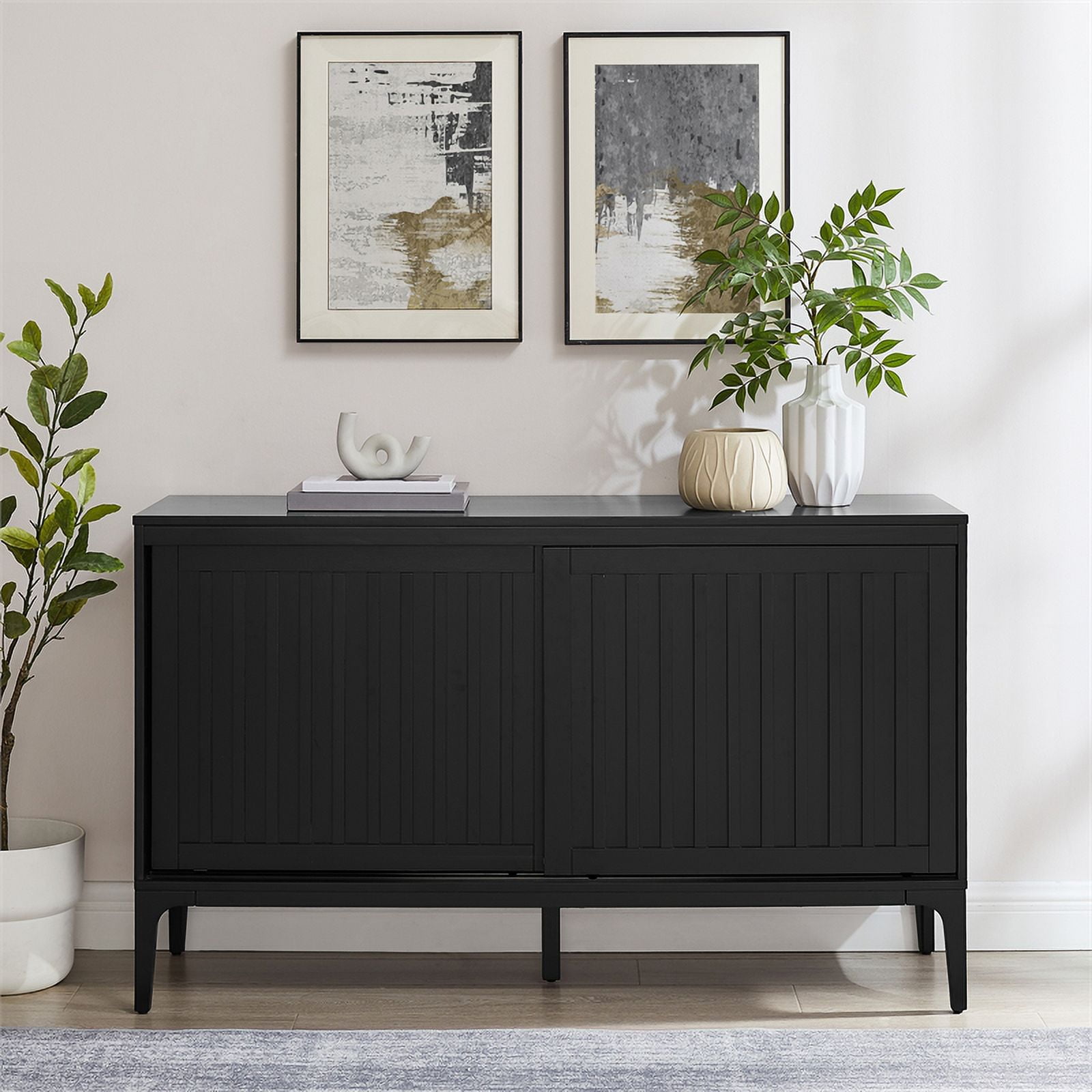 Combining style and functionality in one stunning piece, the Asher Sideboard is the perfect multipurpose buffet cabinet. With its sleek mid-century modern design, this dining room staple adds a touch of retro elegance to any room. The sideboard features sliding doors and adjustable shelves, making it an ideal kitchen storage cabinet or a coffee bar. Say goodbye to tangled wires with the built-in cable management holes. Whether you’re looking for a credenza or a media console, this sideboard with storage is the answer. Features: Material: Particle board 65%, MDF 20%, birch veneer 10%, poplar wood 3%, plywood 2% Finish: Matte black Two sliding cabinet doors with a slatted look One adjustable and removable shelf in each storage cabinet Tapered legs with adjustable levelers Two pre-cut cable management holes with swivel covers Pairs well with modern and farmhouse decor Anti-tip hardware: Yes Indoor furniture Specifications: Product Dimensions: 32.25″H x 54.13″W x 15.88″D Product Weight: 88 lbs Product Dimensions: (Floor Clearance) 7″ Weight Capacity: (Per Shelf) 15 lbs Weight Capacity: (Console Top) 100 lbs Certifications and Listings: ISTA 3A