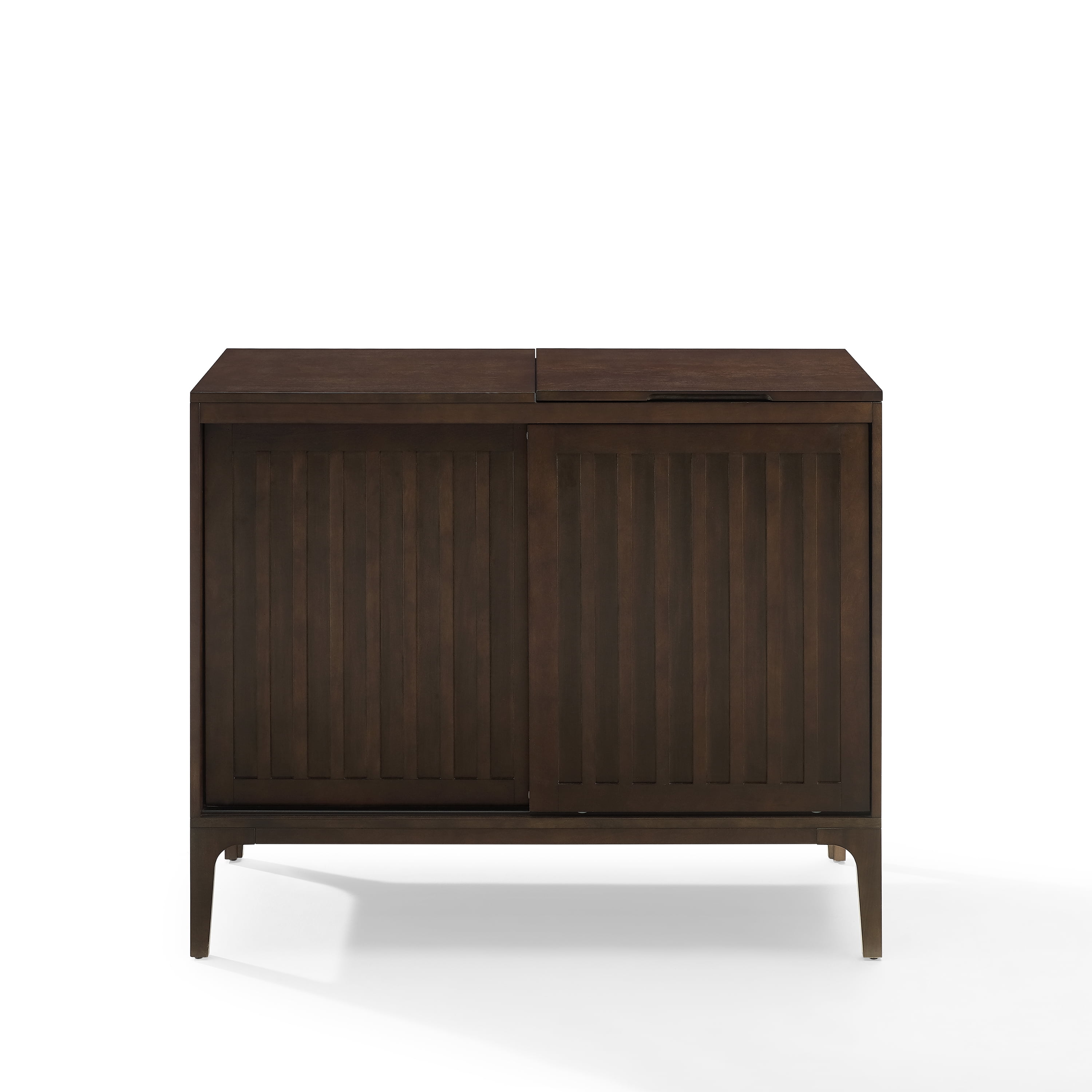 Get in the groove with the Asher Record Storage Media Console. This modern media console features a sleek profile and sliding doors with a slatted look. Whether you need a record player stand with storage or a stylish accent cabinet, this turntable stand fits the bill. With sliding cabinet doors that open to adjustable shelving on one side, and vinyl storage on the other, this media cabinet is a perfect addition to your home. Features: Material: Particle board 40%, MDF 40%, birch veneer 15%, poplar wood 5% Finish: Dark brown Hinged top compartment reveals space for a component turntable Adjustable and removable shelf Wire slots for vinyl record storage Holds approximately 75 albums with a maximum weight limit of 25lbs Tapered legs Adjustable levelers on legs Two pre-cut holes in back for cable management Pairs well with modern and farmhouse decor Two sliding cabinet doors with a slatted look Mid-century modern media furniture Record player stand with hinged top compartment reveals space for a component turntable Anti-tip hardware: Yes Indoor furniture Specifications: Product Dimensions: 34.63″H x 42.13″W x 18″D Product Weight: 85.36 lbs Product Dimensions: (Floor Clearance) 7″ Weight Capacity: (Console top) 100 lbs Shelf Weight Capacity: 15 lbs