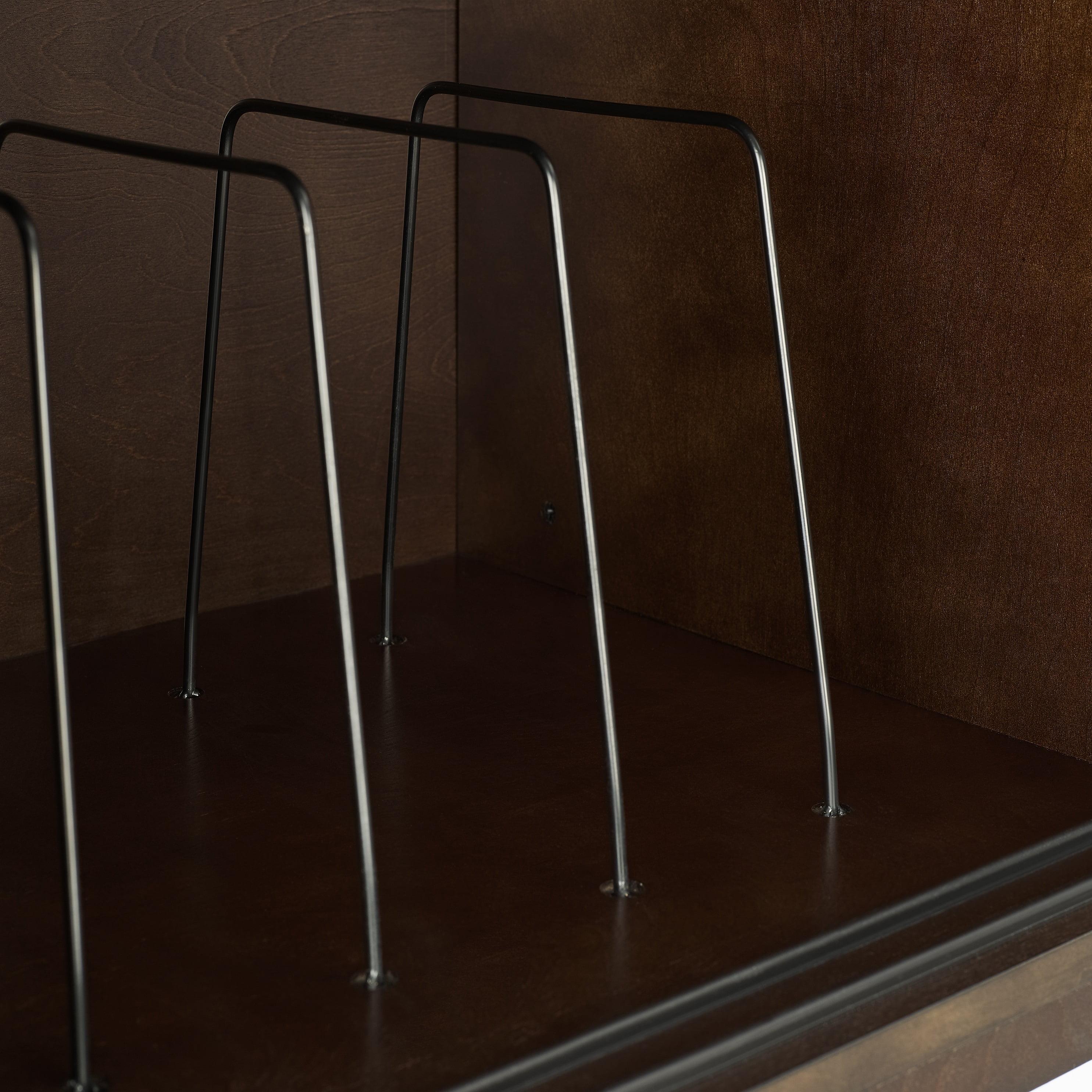 Material: Particle board 40%, MDF 40%, birch veneer 15%, poplar wood 5% Finish: Dark brown Hinged top compartment reveals space for a component turntable Adjustable and removable shelf Wire slots for vinyl record storage Holds approximately 75 albums with a maximum weight limit of 25lbs Tapered legs Adjustable levelers on legs Two pre-cut holes in back for cable management Pairs well with modern and farmhouse decor Two sliding cabinet doors with a slatted look Mid-century modern media furniture Record player stand with hinged top compartment reveals space for a component turntable Anti-tip hardware: Yes Indoor furniture