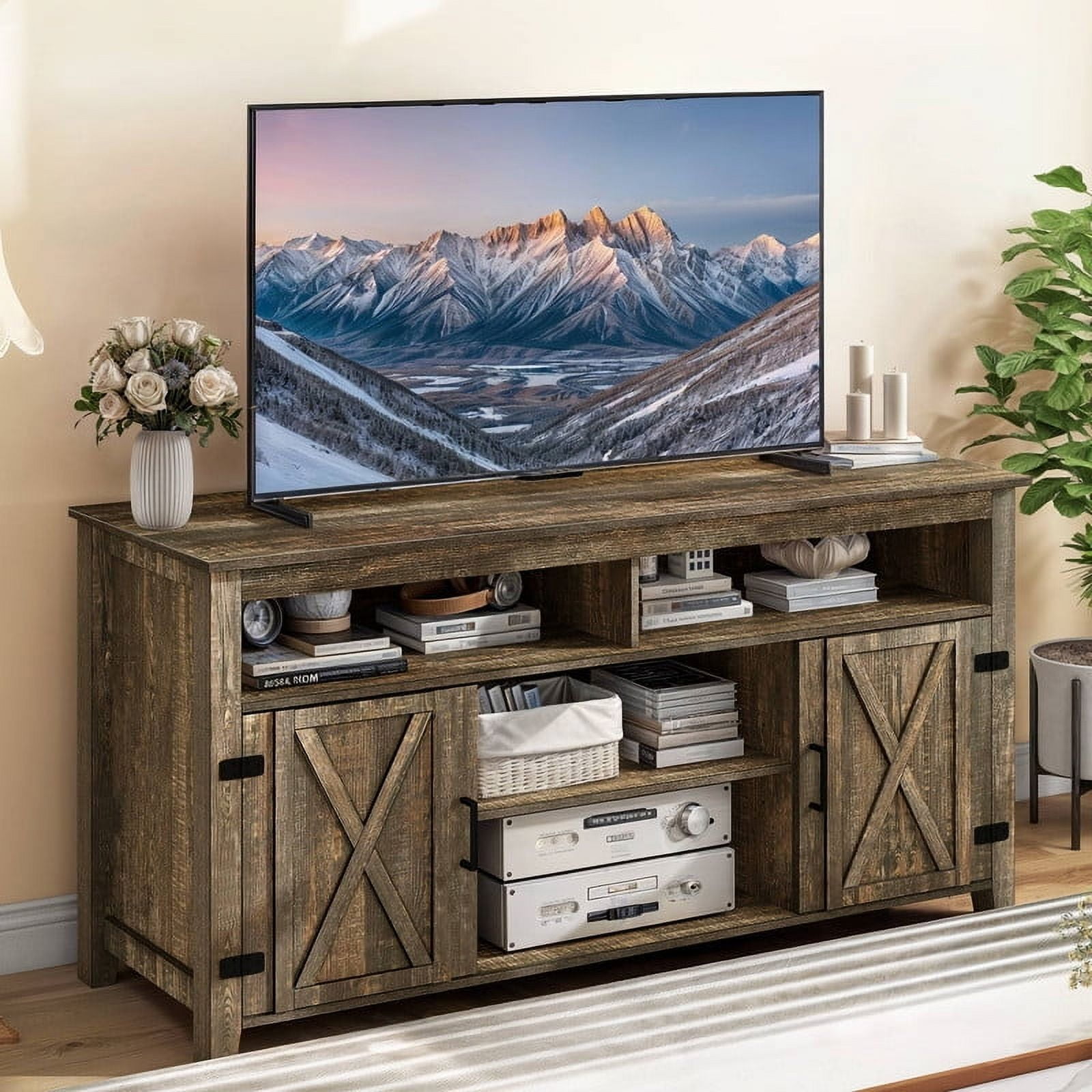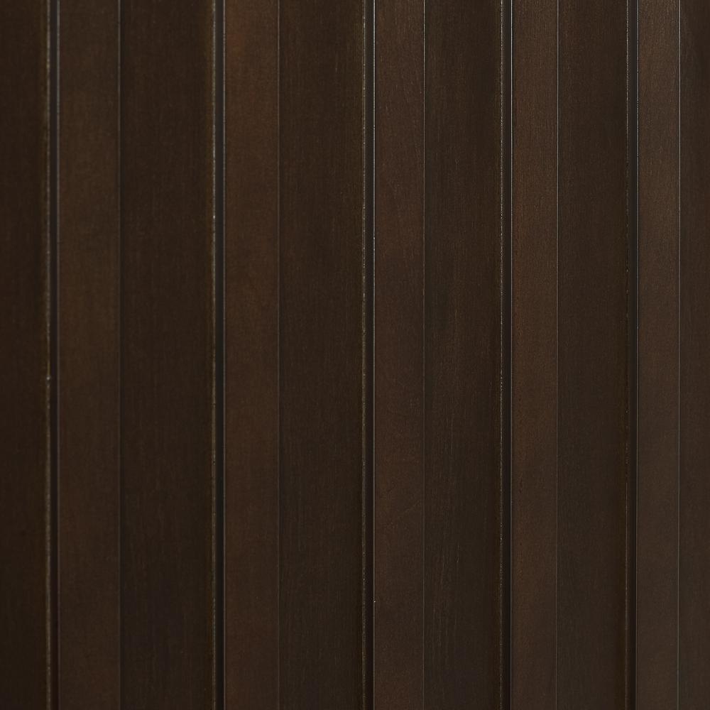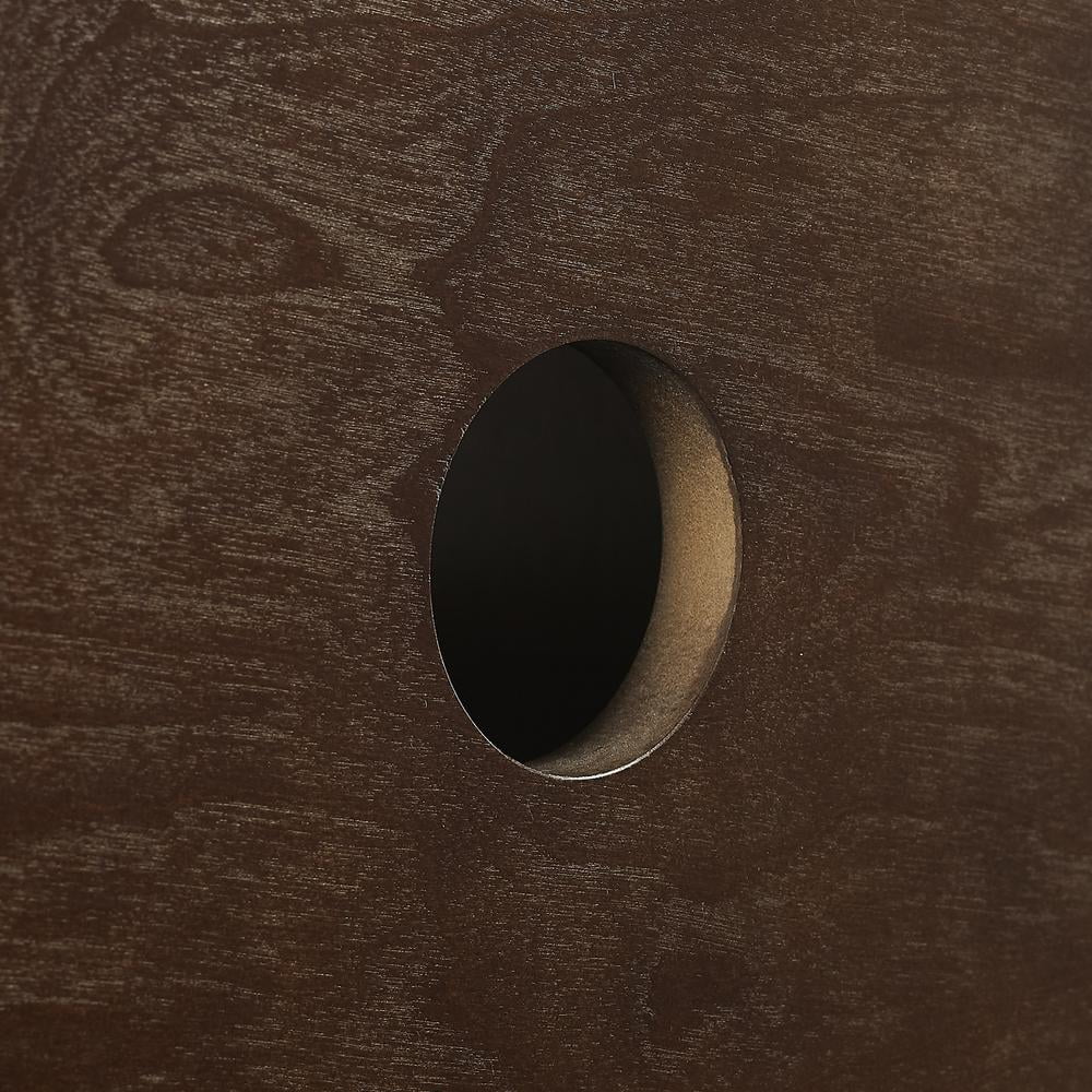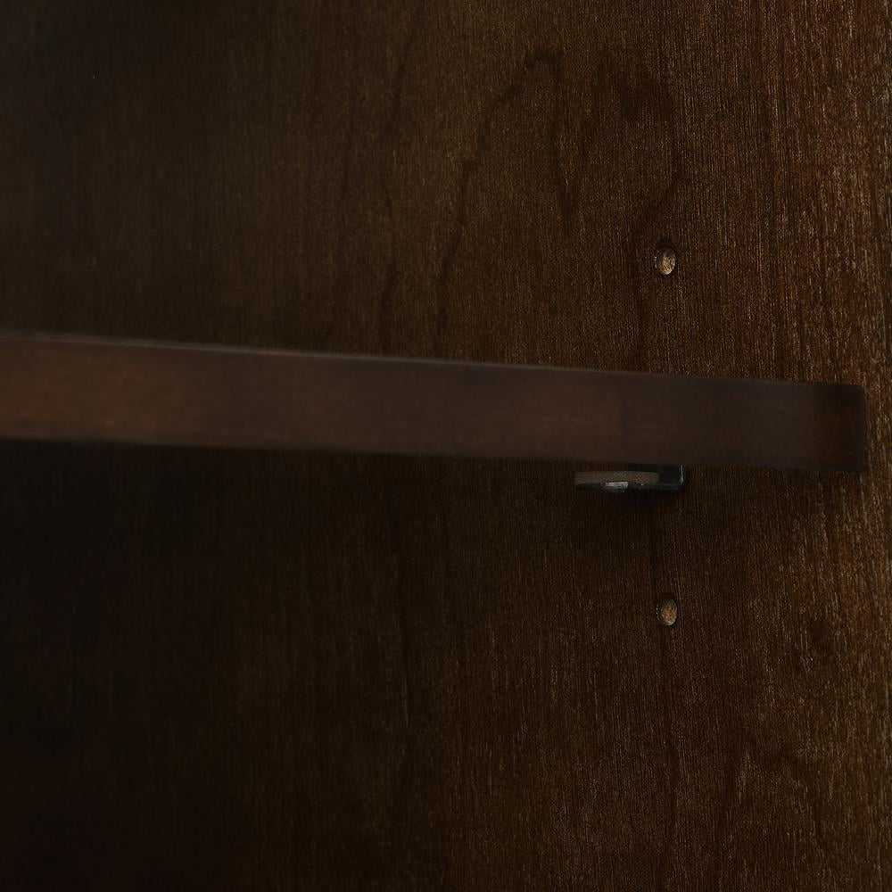 Material: Particle board 75%, MDF 20%, poplar wood 5% Finish: Dark brown Slatted look on cabinet door Wire slots for vinyl record storage Holds approximately 75 albums with a maximum weight limit of 25lbs Tapered legs Adjustable levelers on legs Pre-cut hole in back for cable management Pairs well with modern and farmhouse decor Mid-century modern media furniture The media console has a slatted look on the cabinet door Anti-tip hardware: Yes Indoor furniture