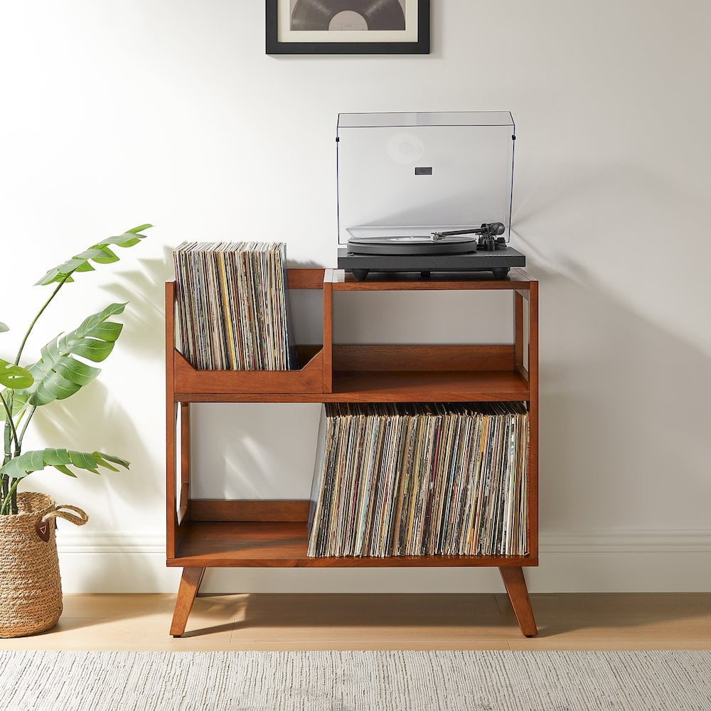 MID-CENTURY MODERN DESIGN: This media console features a rich walnut wood veneer with a touch of mid-century style. Its sleek design pairs well with modern farmhouse, rustic, and boho decor styles, making it a versatile addition to any home. This console has a crate-style record storage shelf that holds up to 65 records with a 35-lb weight limit. The lower storage shelf can hold up to 150 vinyl records with a 75-lb weight limit, providing ample space for all your albums. The top of the console provides space for your turntable and an audio component shelf with a 20-lb weight limit ensures your equipment is neatly organized. Tapered legs with adjustable levelers provide stability on any surface. RELIABLE MEDIA STORAGE: With a console top weight limit of 50 lbs, this media stand offers robust support for your electronics or decorative items. AMERICAN LEGACY: Inspired by over 100 years of the Crosley legacy, Crosley Furniture offers style for every space, from retro to modern. Crosley products are proudly designed in the USA and come with USA-based customer support. Rich walnut wood veneer The top of the console can be used as a record player stand Crate-style record storage on top shelf holds up to 65 records with a weight limit of 35lbs Lower shelf vinyl storage holds up to 150 records with a weight limit of 75lbs Tapered legs with adjustable levelers Pairs well with modern farmhouse, rustic, and boho decor Console top weight limit is 50lbs