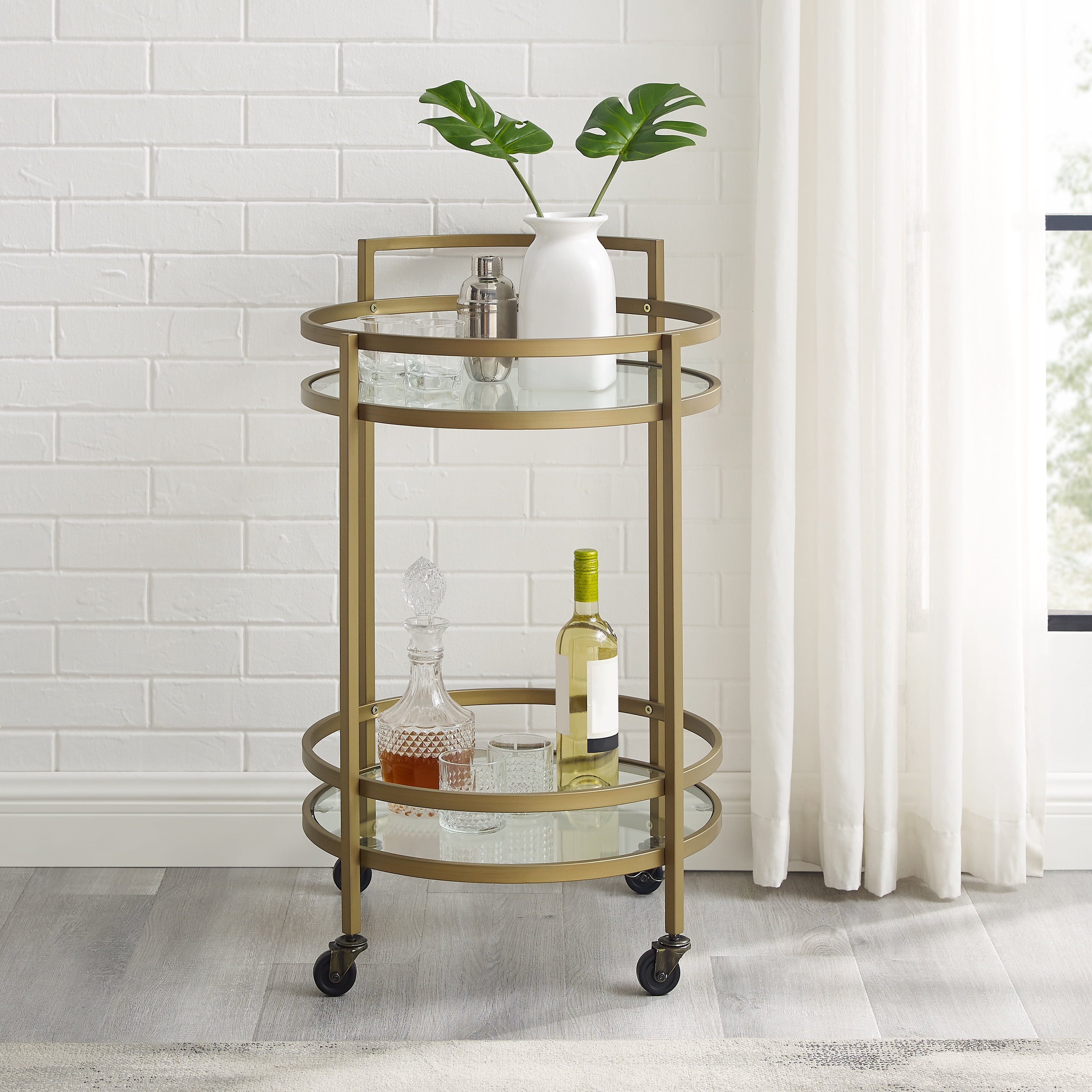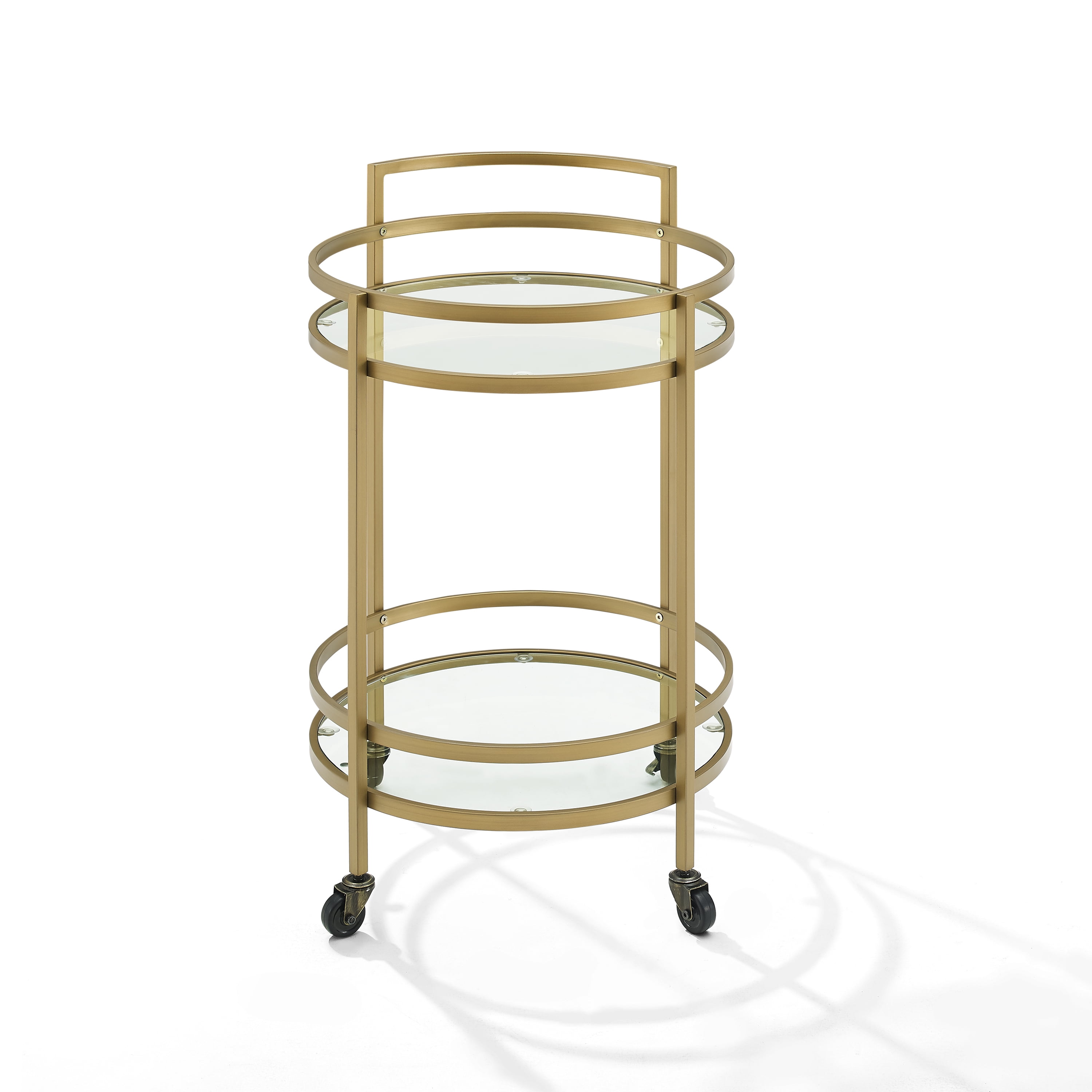 Featuring a modern silhouette with a glamorous finish, the Bailey Round Bar Cart is ready to party in style. With a small footprint and caster wheels, this cart creates a mobile beverage station, plant stand, or end table. The two tempered glass shelves can support wine and liquor bottles, as well as glassware and decor. The Bailey Bar Cart is a lovely addition to any room in your home. Features: Includes a total of four caster wheels with two that lock Material: Tempered glass 50%, steel metal 50% Finish: Gold Art Deco inspired design Two tempered glass shelves each with a 20 lbs weight limit Pairs with glam, traditional, mid-century and modern farmhouse decor Specifications: Product Dimensions: 32.5″H x 20″W x 21.13″D Product Weight: 20.02 lbs Product Dimensions: (Floor Clearance) 5.63″ Arm Height: 0 Back Dimensions: 0 Back Height (IN) Product Dimensions: 5.63 Floor Clearance (IN)