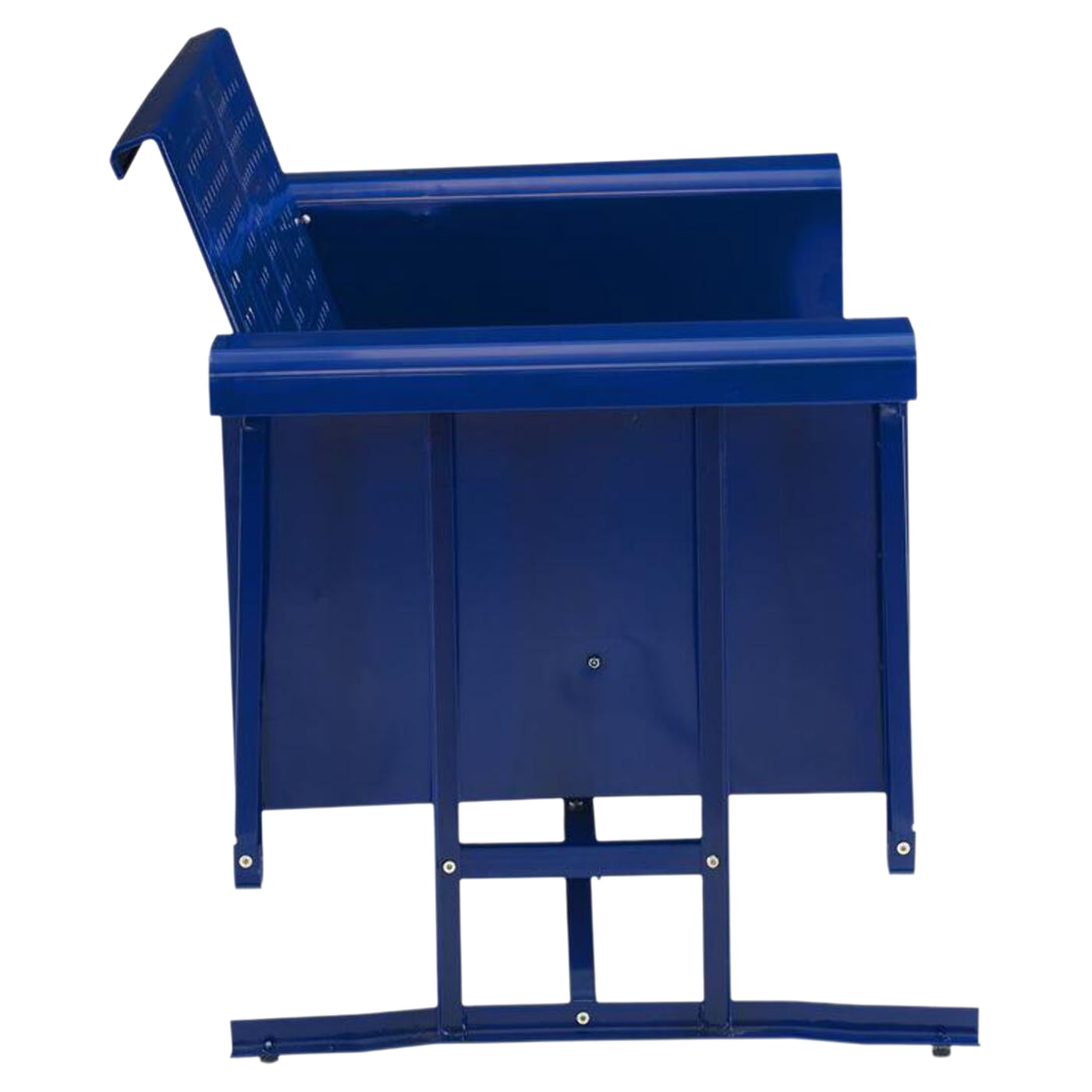 Material: Steel metal 100% Finish: Navy gloss Retro design Sturdy steel construction Weather-resistant powder-coated finish UV and rust resistant Navy gloss finish Back and seat have a basket weave design with holes for air circulation Smooth glide rocking mechanism Ideal for small outdoor spaces Seating for up to two Can be used as outdoor patio furniture, balcony furniture, or porch furniture Anti-tip hardware: No Outdoor furniture