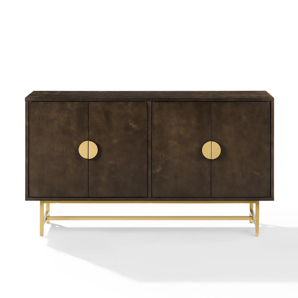 Material: Particle board wood 60%, MDF 20%, birch veneer 10%, steel 10% Finish: Dark brown, gold Mid-century modern design Genuine metal half-circle pull hardware in a gold finish Sideboard cabinet doors have magnetic closures Each buffet cabinet has an adjustable and removable shelf with a 15lb weight limit per shelf Gold legs with adjustable levellers Two pre-cut cable management holes with swivel covers Can be used as a TV stand for a 55+ inch TV Ideal for use as a bar cabinet, coffee bar, or credenza Pairs well with modern and glam decor Anti-tip hardware: Yes Indoor furniture
