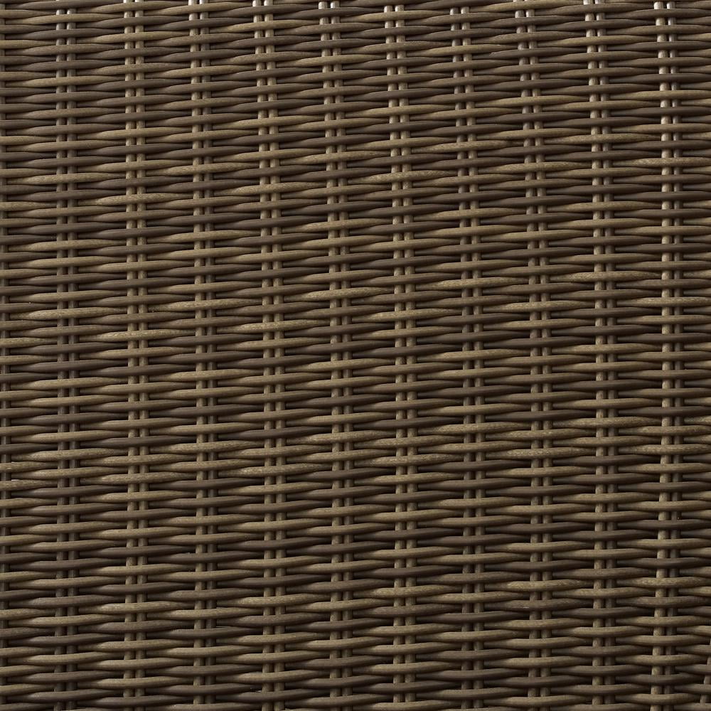 Material: Solution dyed polyester fabric 50%, steel 20%, foam 15%, pe wicker 15% Finish: Sand, weathered brown Traditional patio furniture UV-proof all-weather half-round resin wicker with rattan look Weatherproof powder-coated steel frame Handwoven weathered brown resin wicker outdoor furniture Neutral sand cushion cover with white piping High-performance solution-dyed polyester cushion covers resist mould, sun fade, and abrasion to keep your outdoor patio furniture looking good Adjustable levelers on legs Can be used as balcony furniture or porch furniture Anti-tip hardware: No Outdoor Furniture Moisture-proof high grade cushion cores Anti-slip pads on the cushion cover prevent slippage Removable cushion covers are machine washable Modular design pairs with other items in this collection