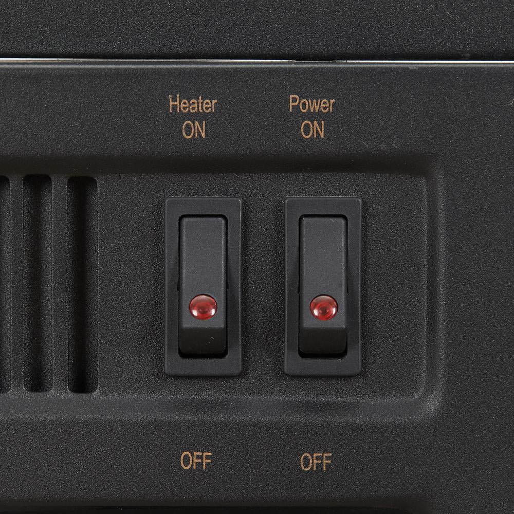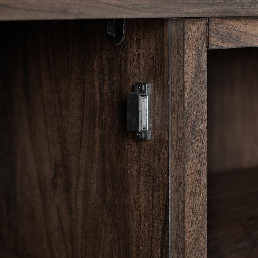 Rustic design Dark walnut finish Genuine metal hardware in an antique brass finish Adjustable levelers on feet One adjustable shelf inside each entertainment center cabinet with a 15lb weight limit per shelf Fits most TV’s up to 50″ Fully assembled electric fireplace with remote included Electric fireplace can heat approximately 400 square feet Power cable for fireplace passes through pre-cut holes in the back Energy-saving LED fire display has three brightness levels and creates a realistic fire glow with or without the heat Timer function with automatic shut off from 30 minutes up to 6 hours, provides over heating protection Adjustable temperature with memory function that displays upon next use Pairs well with modern farmhouse and traditional decor TV Stand weight limit is 100lbs