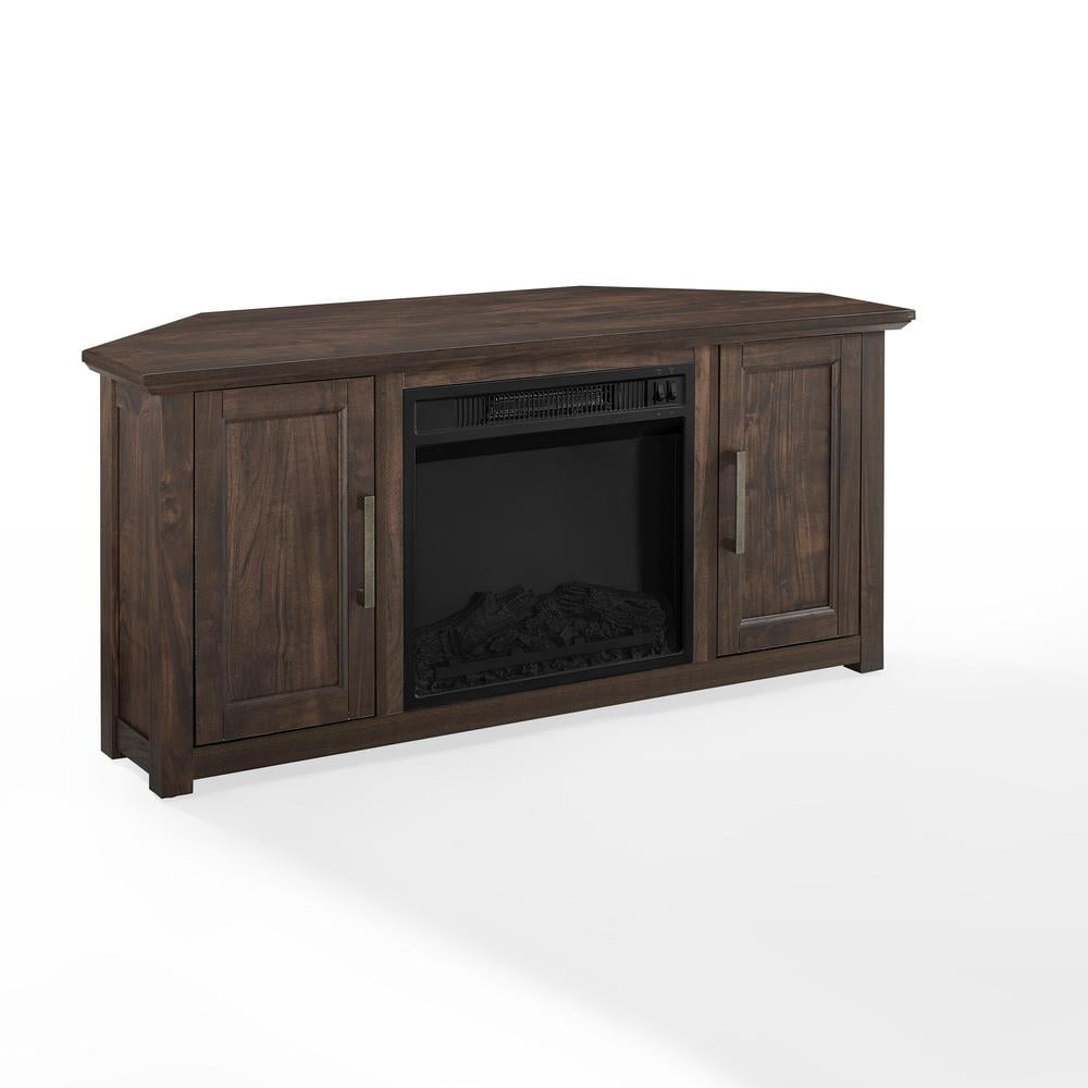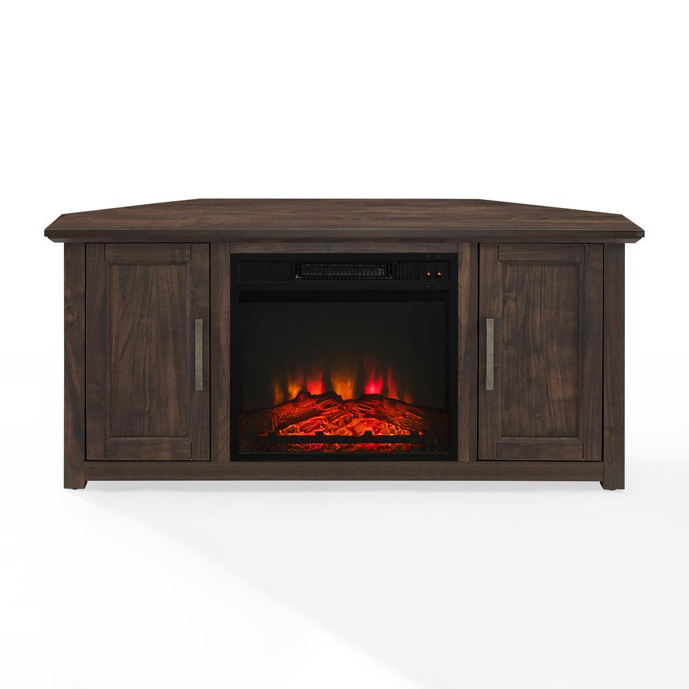 Ideal for smaller living spaces, the Camden 48″Corner TV Stand with fireplace creates a cozy space for home entertainment. This TV console tucks neatly into any corner while showcasing your television and keeping media necessities hidden away. Each cabinet features an adjustable shelf that adapts to your storage needs. With an electric fireplace in the center compartment, this TV stand doubles as a modern-day hearth, able to heat approximately 400 square feet of your home. Sized to fit most TV’s up to 50 inches, this fireplace TV stand keeps you cozy while entertaining at home. Features: Material: Steel 40%, MDF 27.5%, paper veneer 20%, tempered glass 5%, plastic 5%, pine wood 2.5% Finish: Dark walnut Genuine metal hardware in an antique brass finish Adjustable levelers on feet One adjustable shelf inside each entertainment center cabinet Anti-tip hardware: No Indoor furniture Rustic design Fits most TV’s up to 50″ Fully assembled electric fireplace with remote included Electric fireplace can heat approximately 400 square feet Power cable for fireplace passes through pre-cut holes in the back Energy-saving LED fire display has three brightness levels and creates a realistic fire glow with or without the heat Timer function with automatic shut off from 30 minutes up to 6 hours, provides over heating protection Adjustable temperature with memory function that displays upon next use Pairs well with modern farmhouse and traditional decor Specifications: Product Dimensions: 22″H x 47.75″W x 20″D Product Weight: 79.86 lbs Shelf Weight Capacity: 15 lbs Weight Capacity: (TV Stand) 100 lbs Product Dimensions: (Floor Clearance) 1″