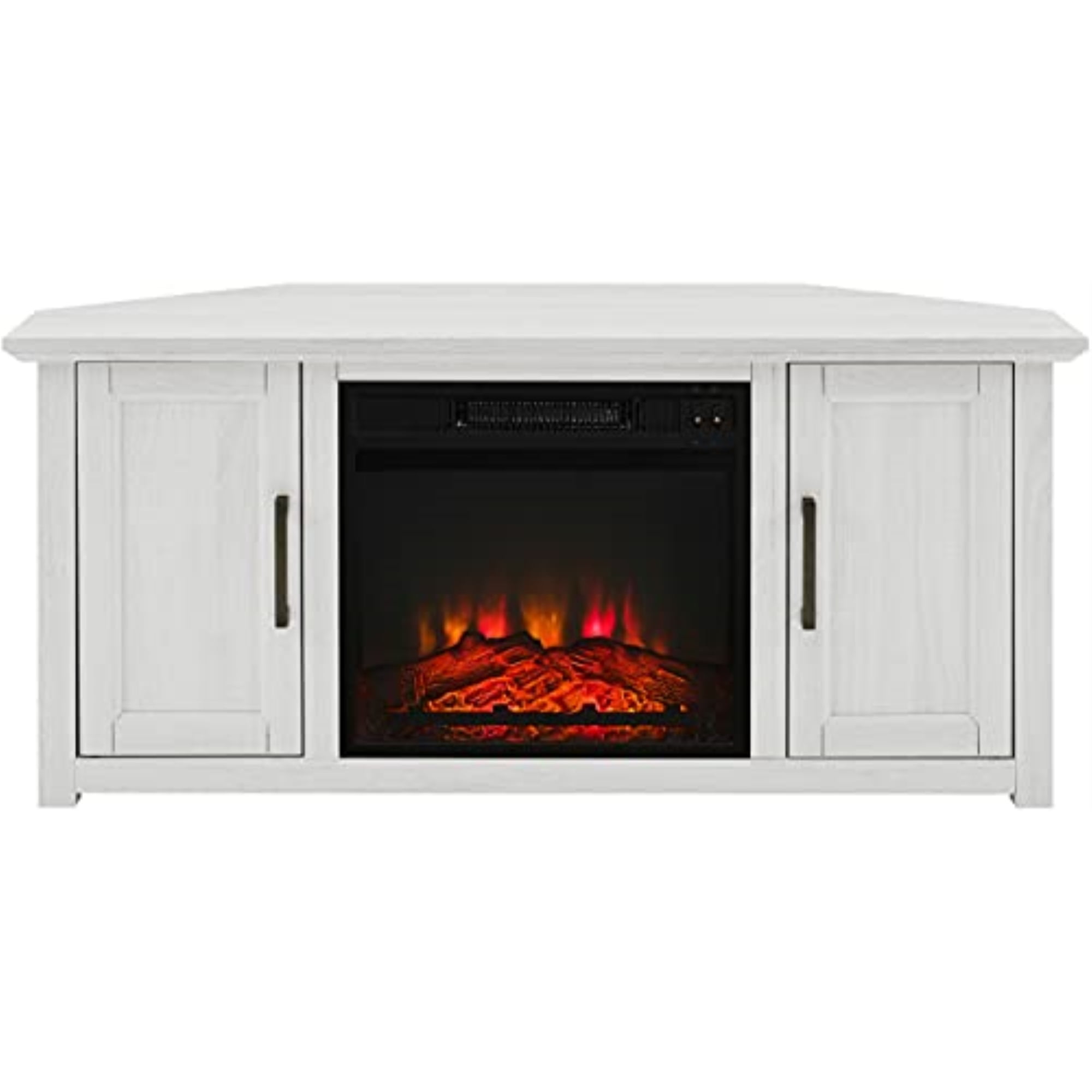 Ideal for smaller living spaces, the Camden 48″Corner TV Stand with fireplace creates a cozy space for home entertainment. This TV console tucks neatly into any corner while showcasing your television and keeping media necessities hidden away. Each cabinet features an adjustable shelf that adapts to your storage needs. With an electric fireplace in the center compartment, this TV stand doubles as a modern-day hearth, able to heat approximately 400 square feet of your home. Sized to fit most TV’s up to 50 inches, this fireplace TV stand keeps you cozy while entertaining at home. Features: Material: Steel 40%, MDF 27.5%, paper veneer 20%, tempered glass 5%, plastic 5%, pine wood 2.5% Finish: Whitewash, black Genuine metal hardware in an antique brass finish Adjustable levelers on feet One adjustable shelf inside each entertainment center cabinet Anti-tip hardware: No Indoor furniture Rustic design Fits most TV’s up to 50″ Fully assembled electric fireplace with remote included Electric fireplace can heat approximately 400 square feet Power cable for fireplace passes through pre-cut holes in the back Energy-saving LED fire display has three brightness levels and creates a realistic fire glow with or without the heat Timer function with automatic shut off from 30 minutes up to 6 hours, provides over heating protection Adjustable temperature with memory function that displays upon next use Pairs well with modern farmhouse and traditional decor Specifications: Product Dimensions: 22″H x 47.75″W x 20″D Product Weight: 79.86 lbs Shelf Weight Capacity: 15 lbs Weight Capacity: (TV Stand) 100 lbs Product Dimensions: (Floor Clearance) 1″