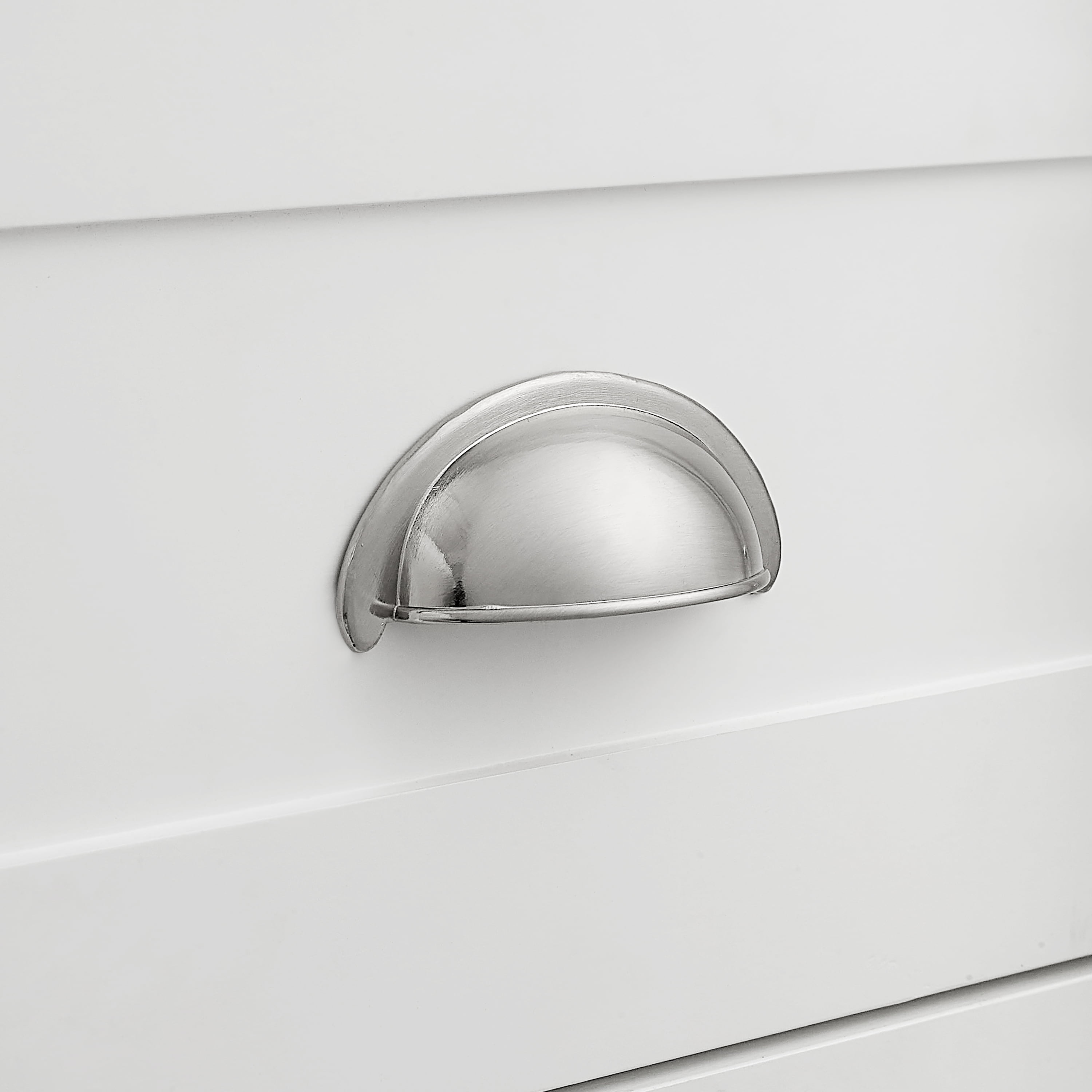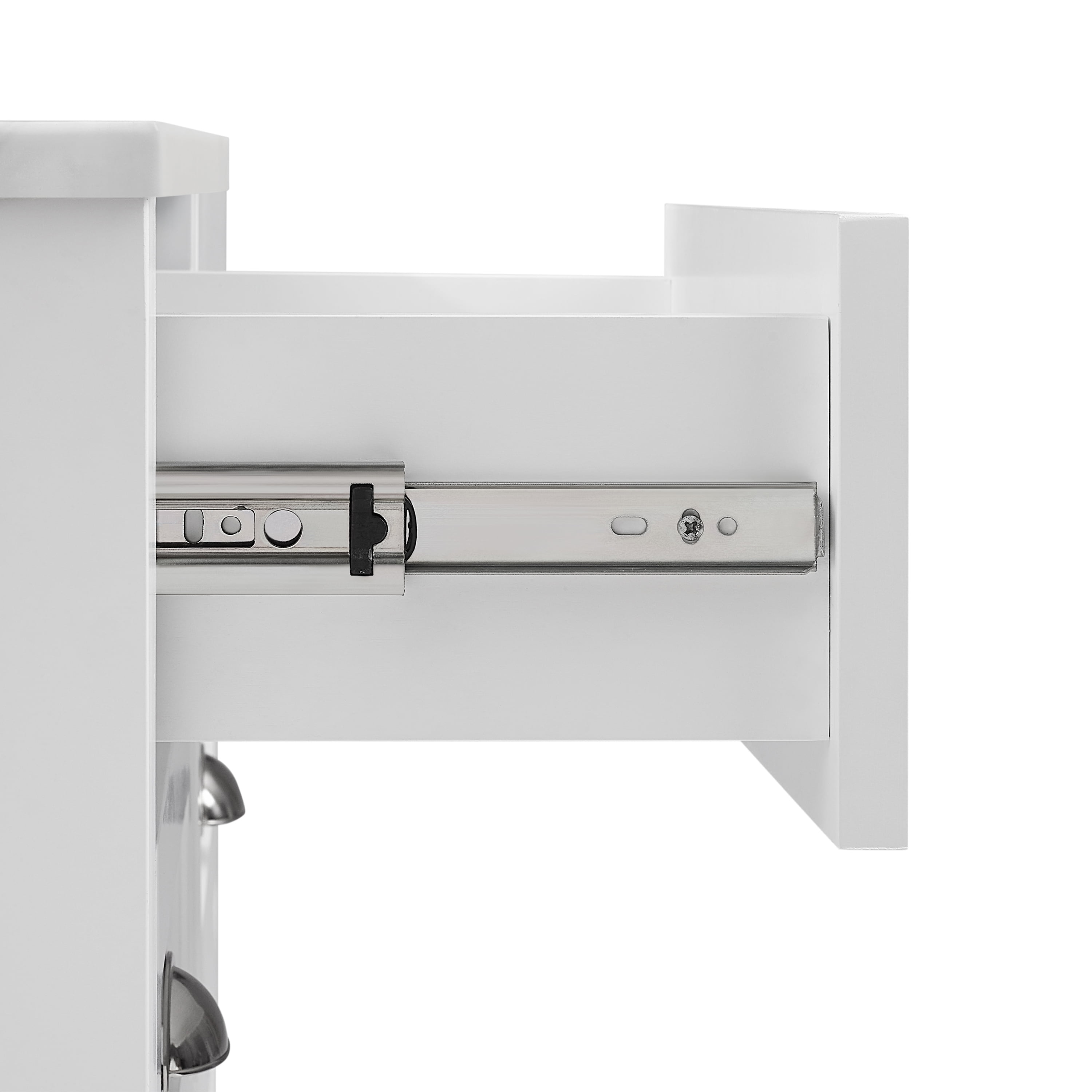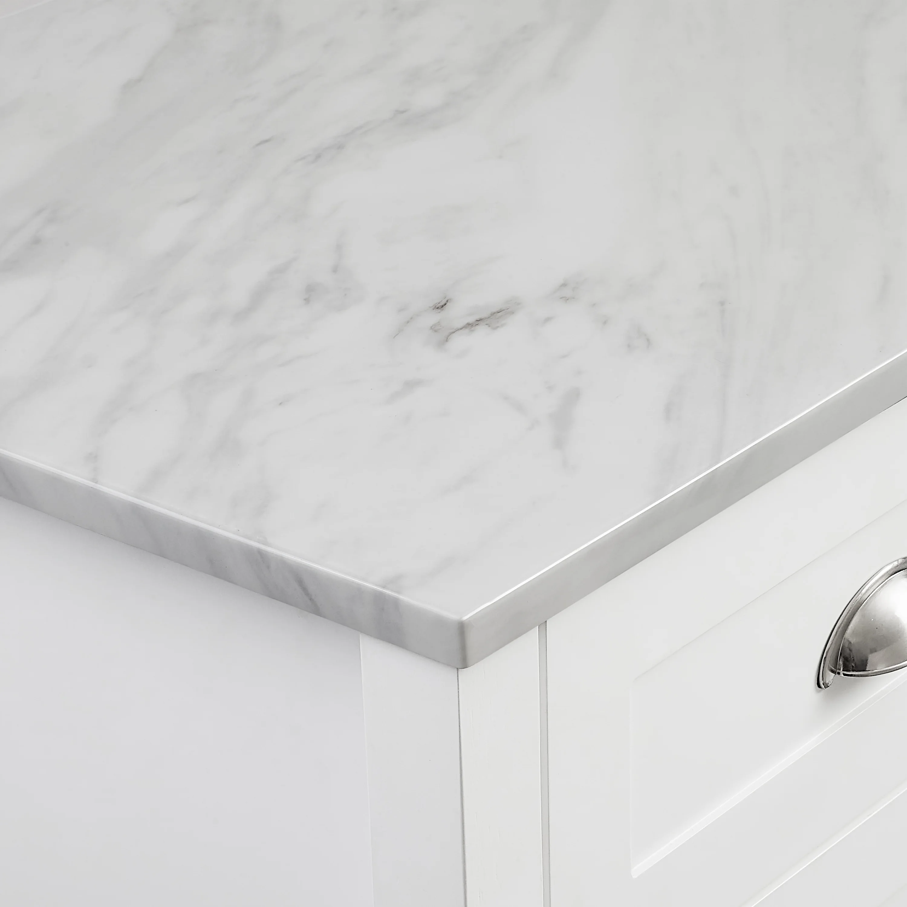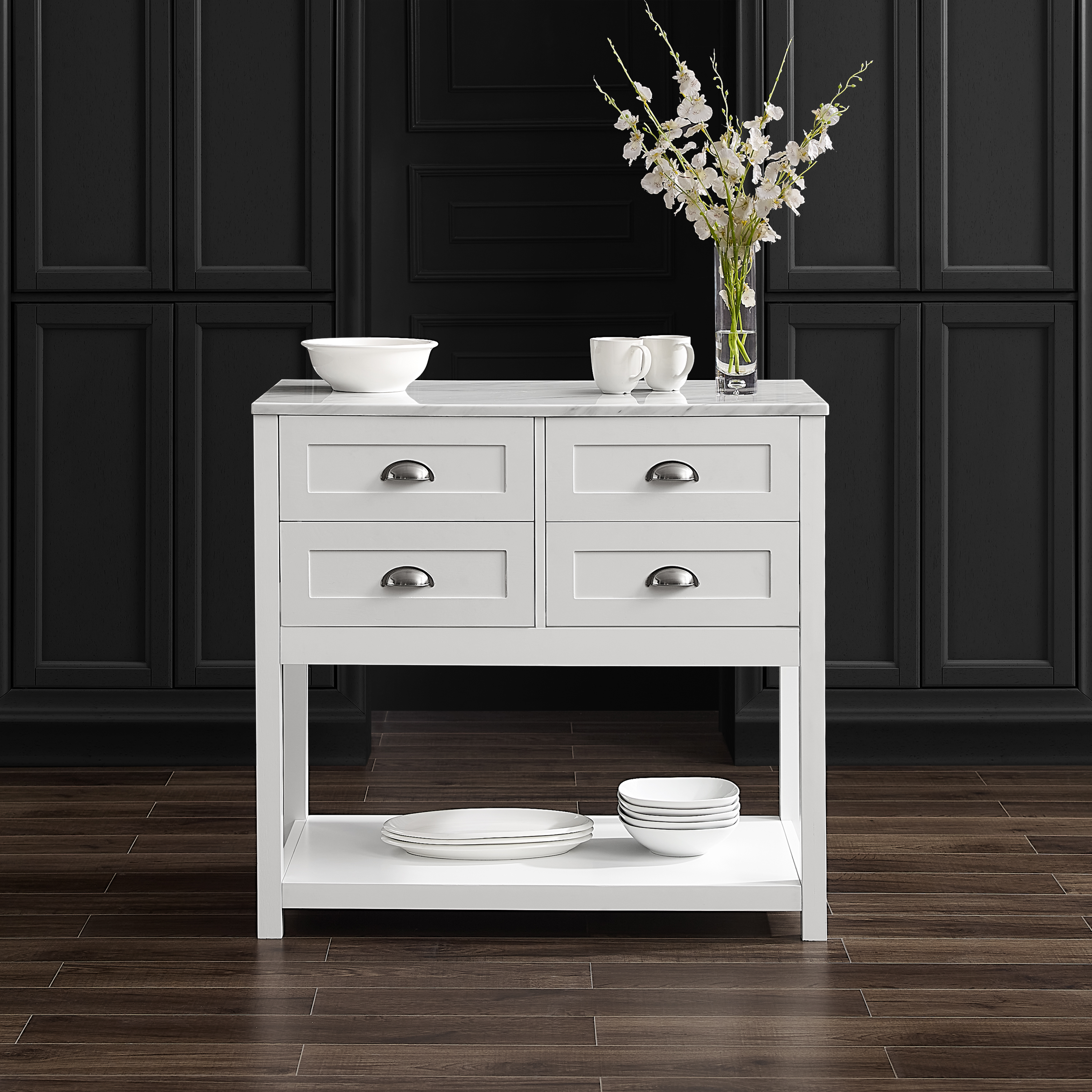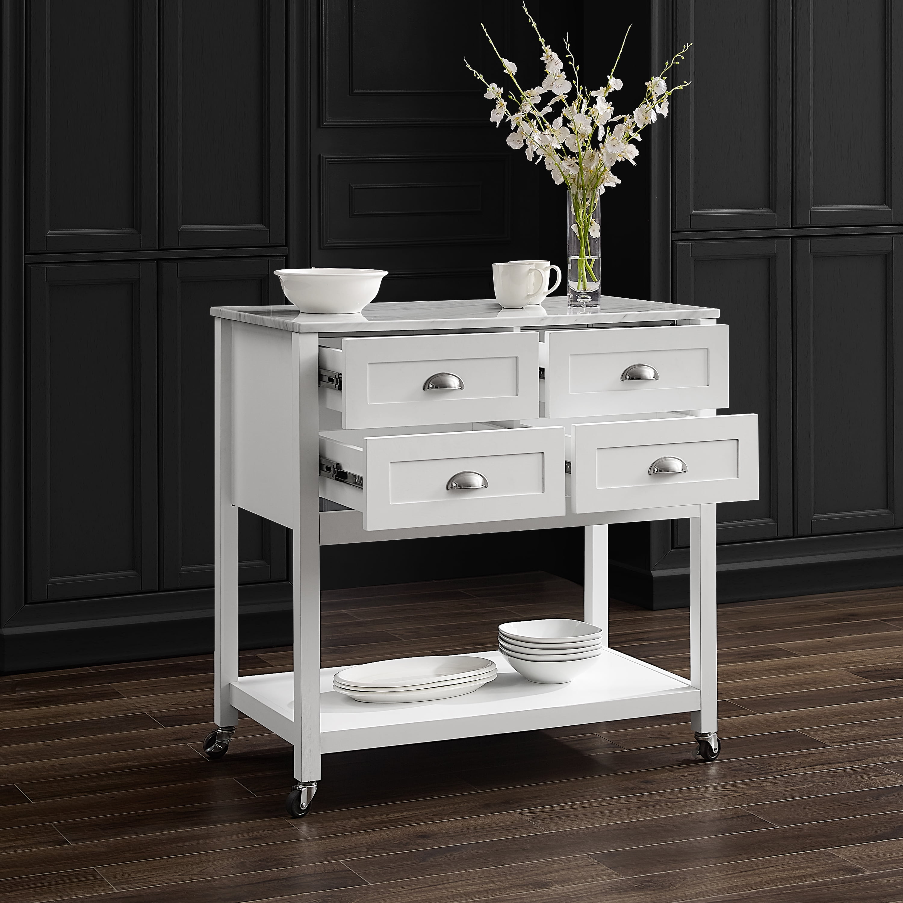 Material: Particle board wood 45%, MDF 35%, birch veneer 10%, paper marble 5%, poplar wood 5% Finish: White, gray Finished back Pairs well with traditional and coastal decor Modern farmhouse kitchen organization and storage Elegant white faux marble countertop Classic cup pull hardware in a brushed nickel finish Four full-extension kitchen storage drawers on ball-bearing glides Includes four optional caster wheels with two that lock Can be used as a kitchen cart, microwave stand, or coffee cart Anti-tip hardware: No Indoor furniture