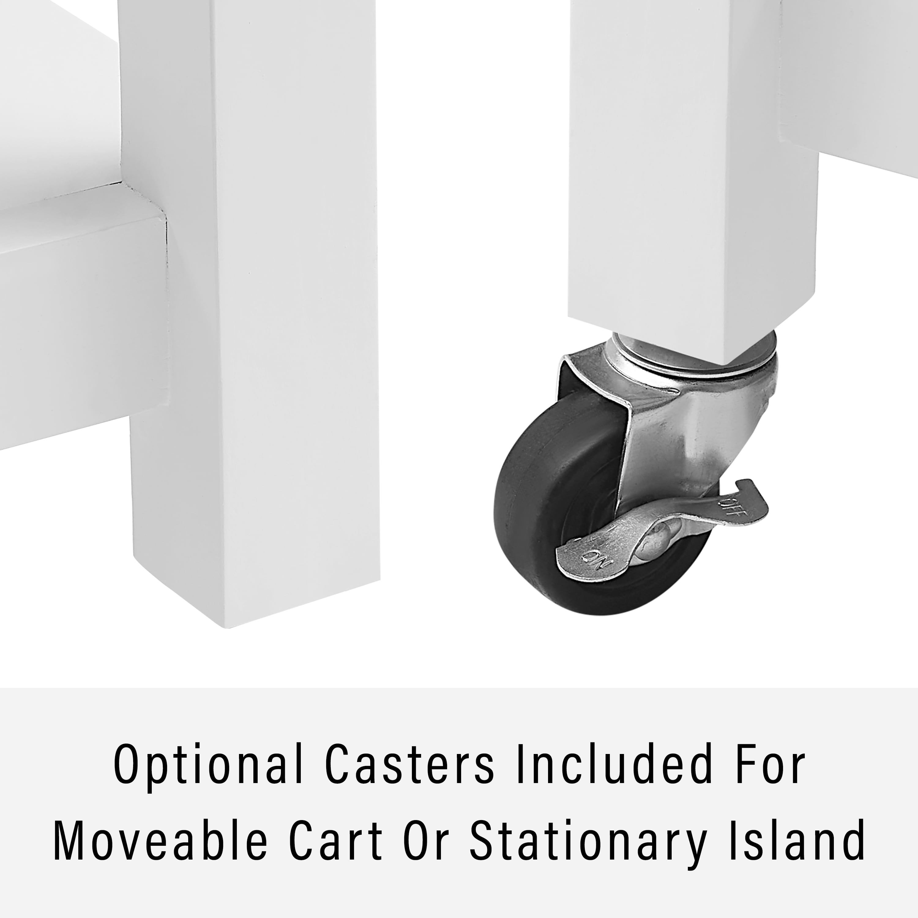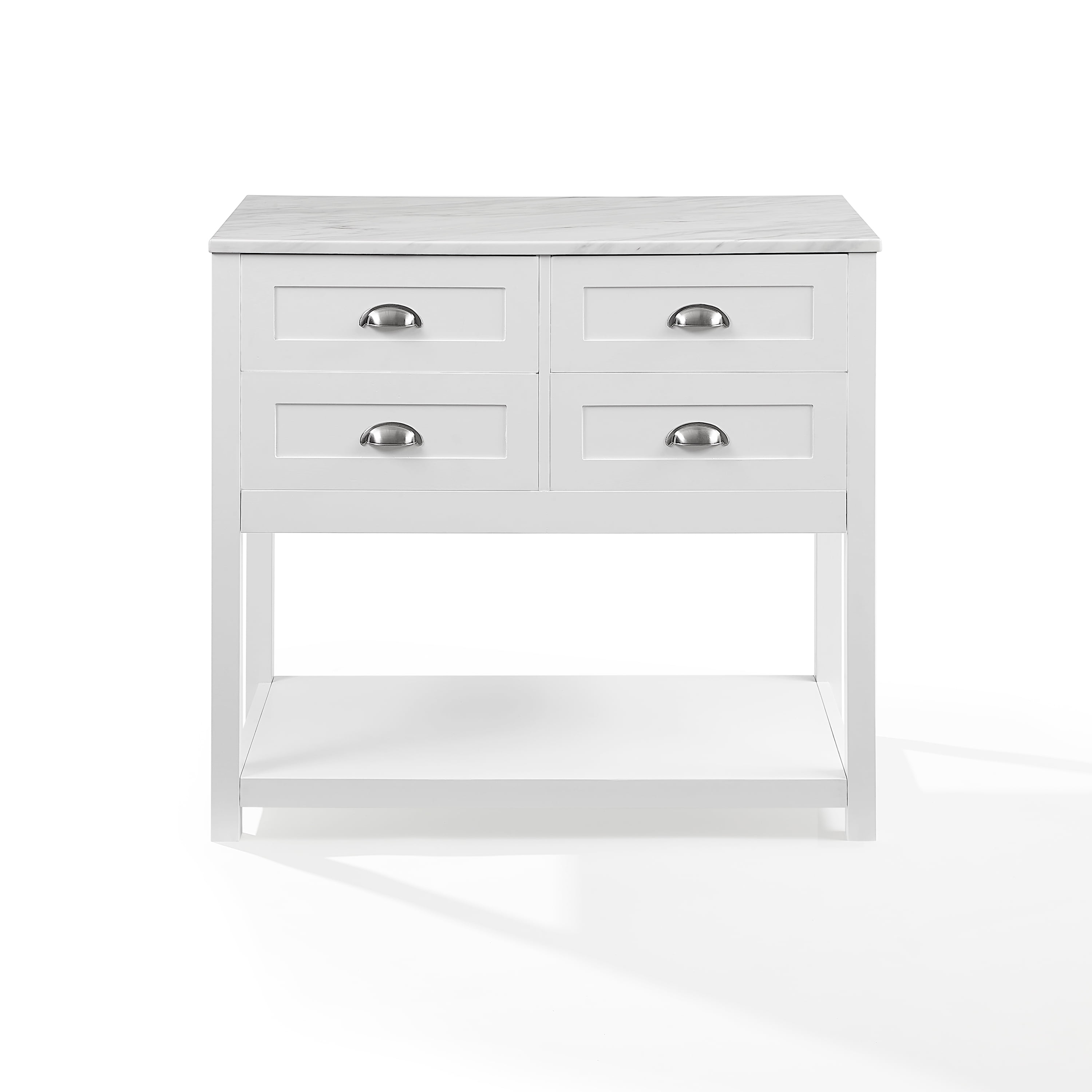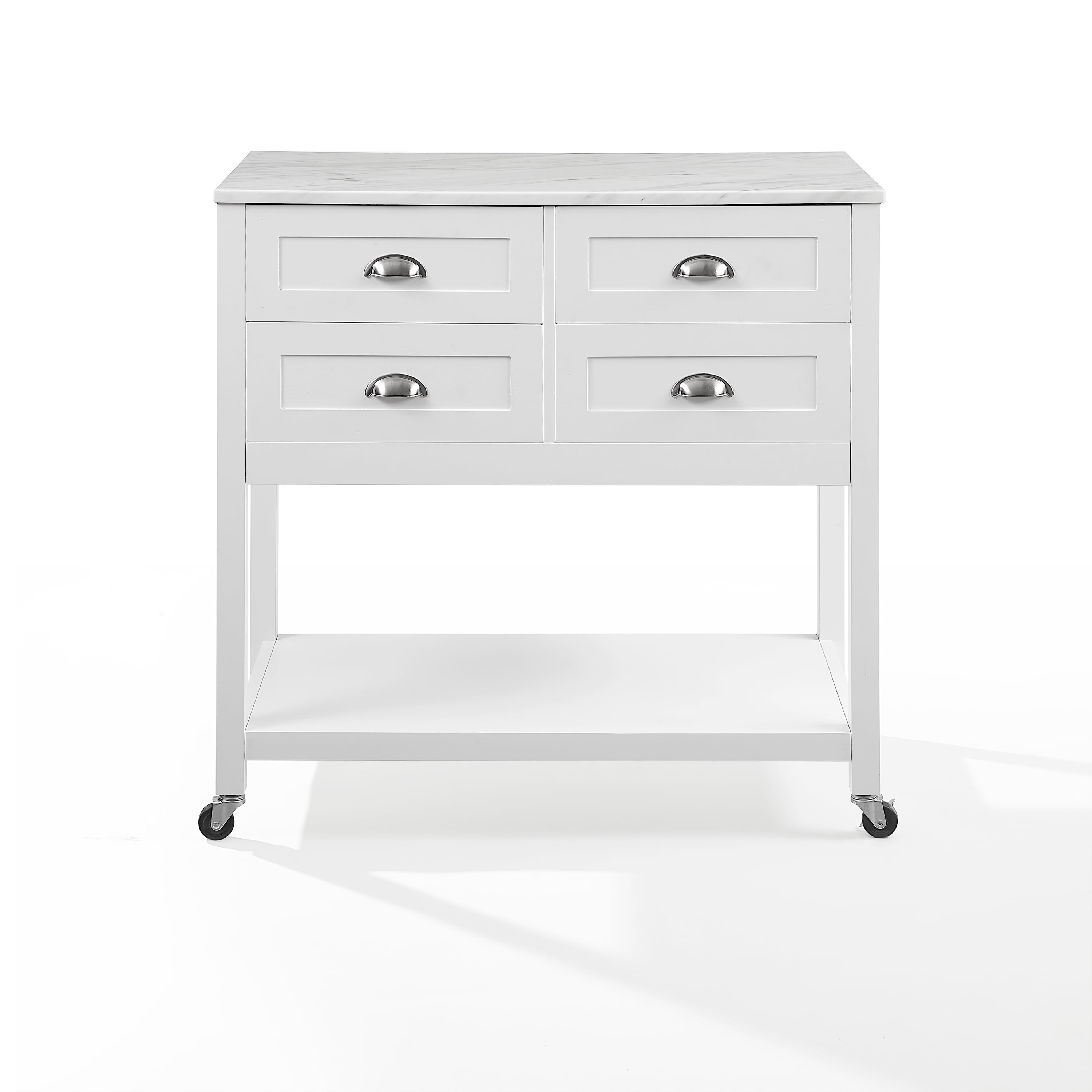 Elevate any kitchen with the high-end look of the Connell Kitchen Island/Cart. Ideal for adding counter space and extra storage, this kitchen island with storage features four sizeable drawers perfect for utensils, flatware, and linens. An open stationary shelf can store larger items or be used for display. With optional casters and a beautiful faux marble countertop, this small kitchen island on wheels makes for a stylish coffee bar or microwave cart. Features: Material: Particle board wood 45%, MDF 35%, birch veneer 10%, paper marble 5%, poplar wood 5% Finish: White, gray Finished back Pairs well with traditional and coastal decor Modern farmhouse kitchen organization and storage Elegant white faux marble countertop Classic cup pull hardware in a brushed nickel finish Four full-extension kitchen storage drawers on ball-bearing glides Includes four optional caster wheels with two that lock Can be used as a kitchen cart, microwave stand, or coffee cart Anti-tip hardware: No Indoor furniture Specifications: Product Dimensions: 36.25″H x 36″W x 20″D Product Weight: 83.82 lbs Drawer Weight Capacity: 15 lbs Shelf Weight Capacity: 20 lbs Weight Capacity: (Countertop) 100 lbs Product Height: (Floor Clearance) 4.5″