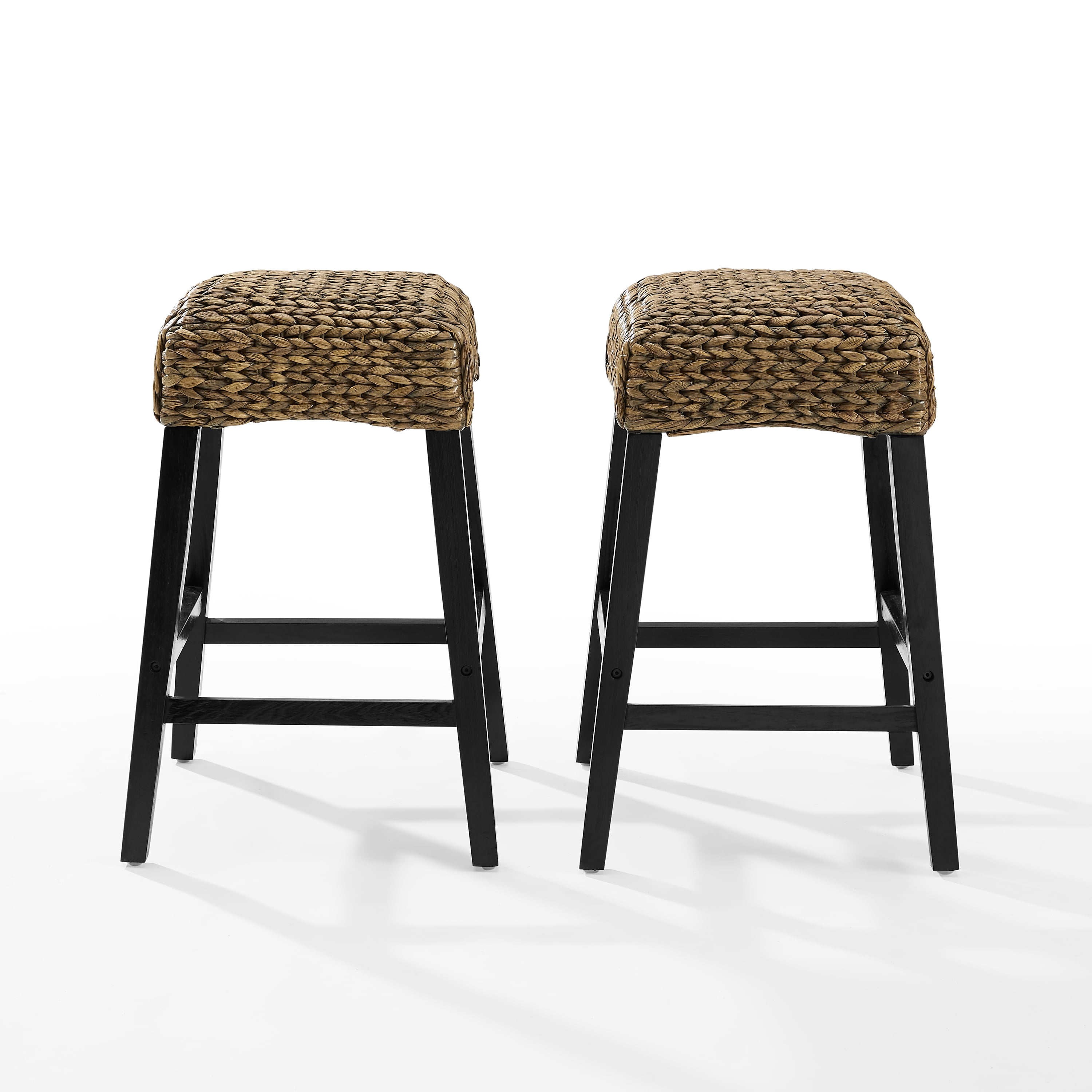 Set includes: 2 stools Material: Mahogany wood 60%, water hyacinth seagrass 40% Finish: Sea grass, black Coastal design Seat is covered in handwoven natural water hyacinth seagrass Dark brown finish on legs Natural plant fibers have inherent color variations that enhance the character of the product Wood crossbar supports double as footrests Can be used with counter height tables and kitchen islands Pairs well with modern farmhouse, traditional, and boho decor Bar stool seat is covered in handwoven natural water hyacinth seagrass Dark brown finish on stool legs Pairs well with modern farmhouse, traditional, and boho decor Kitchen stool can be used with counter height tables and kitchen islands Anti-tip hardware: No Indoor furniture