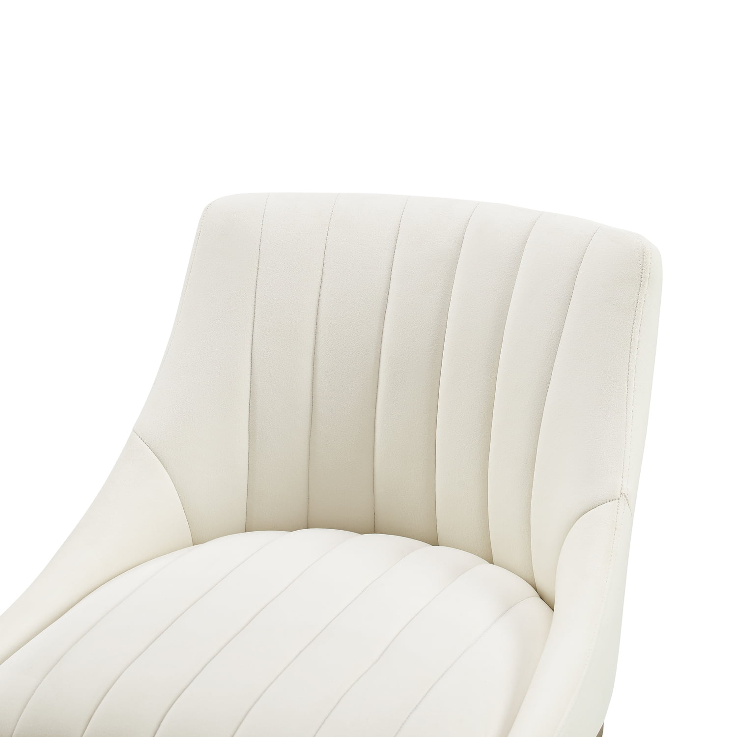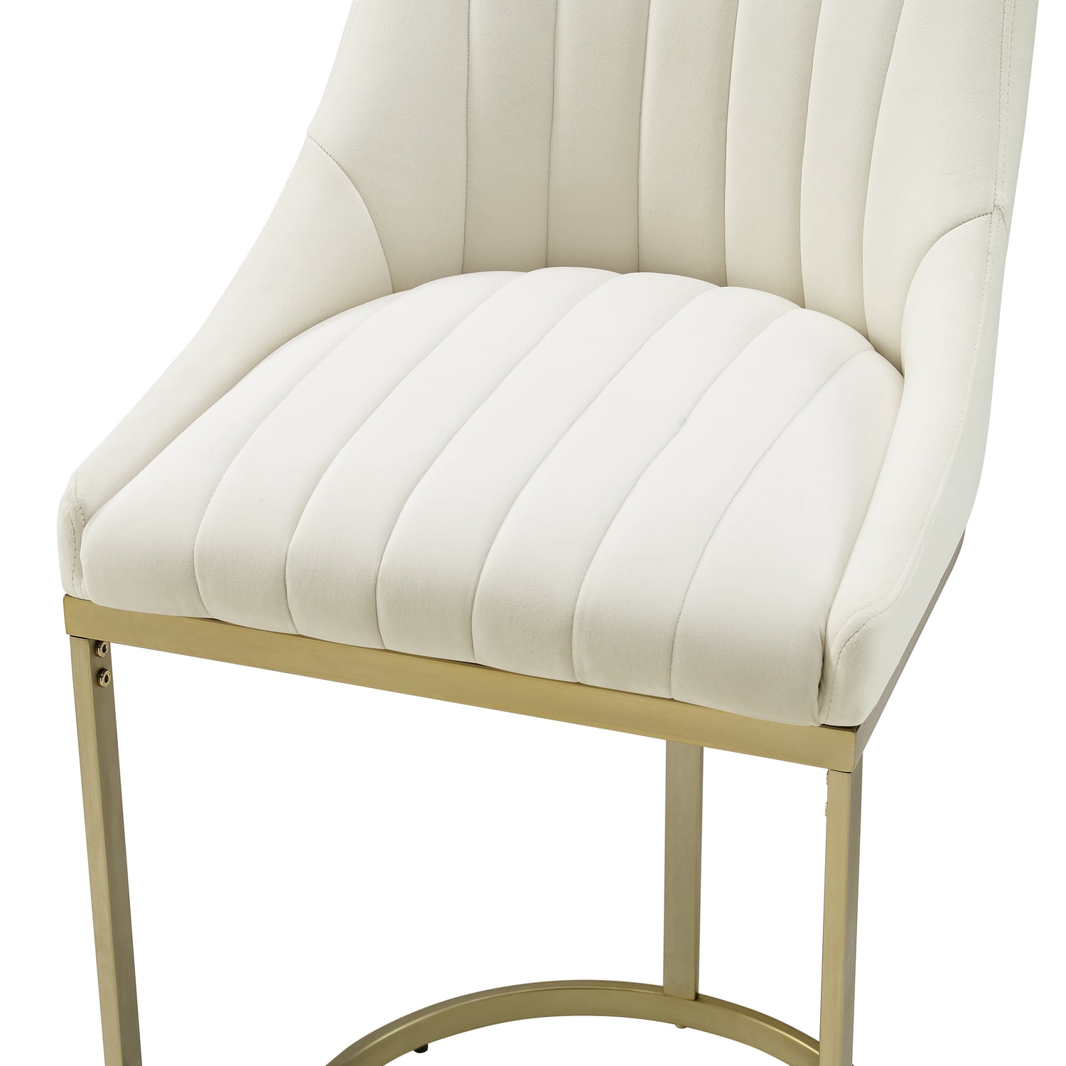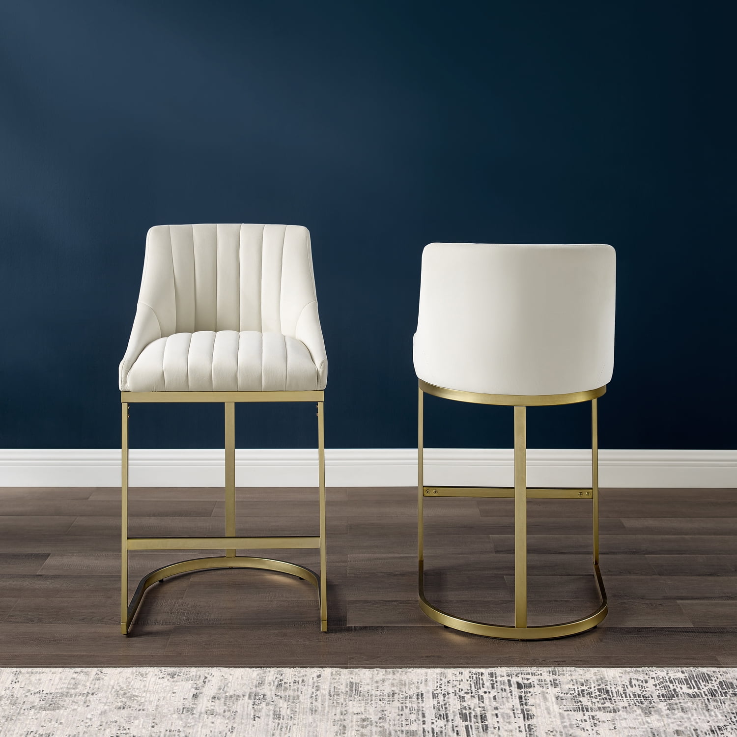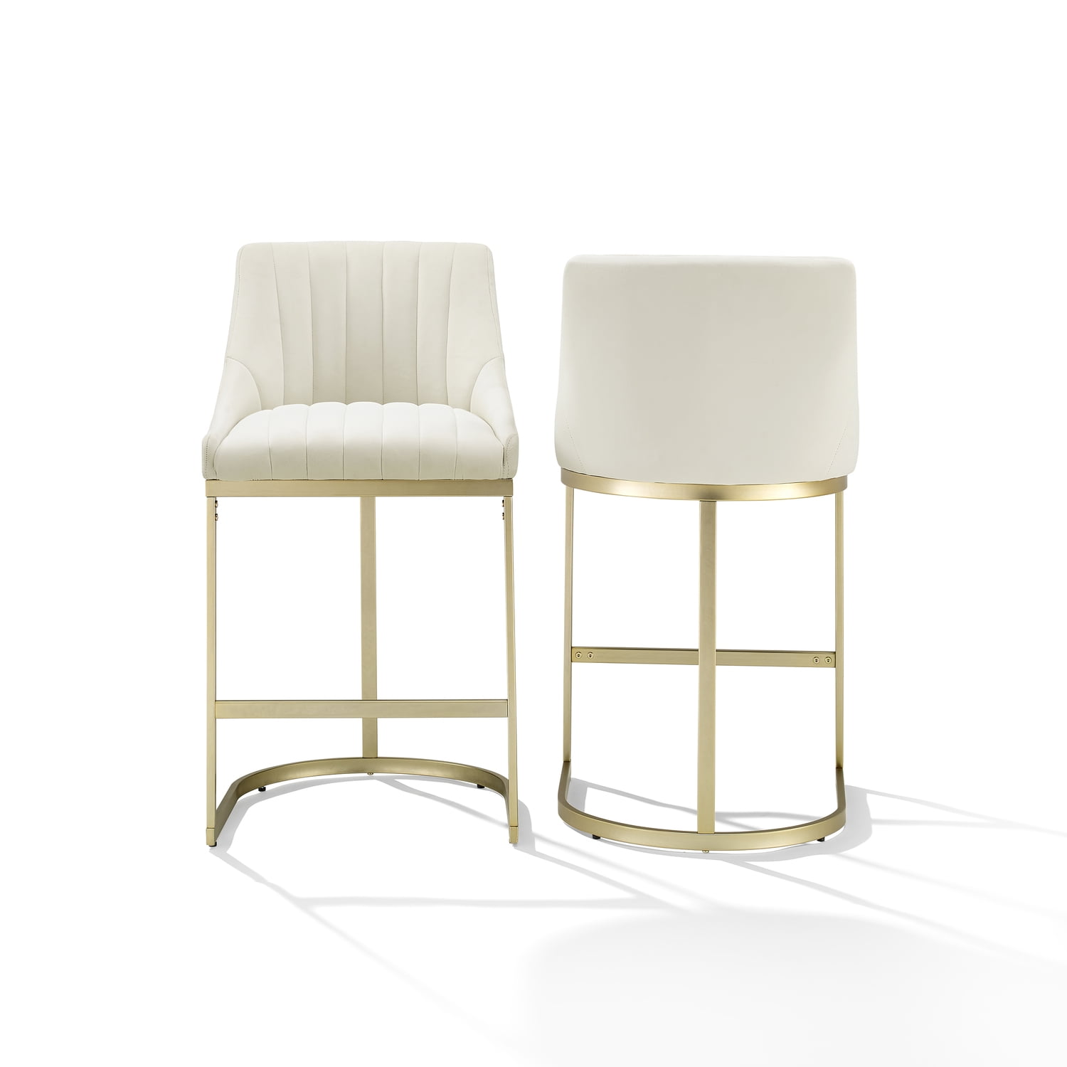 Modern design Steel frames have a brushed gold finish Counter stool bucket seats upholstered in creme velvet fabric Low stool backs with channel tufted upholstery Curved sled-style bar stool bases with footrests Adjustable levelers on bases Bar stools can be used with counter height tables and kitchen islands Pairs well with glam, Art Deco, modern farmhouse and traditional decor
