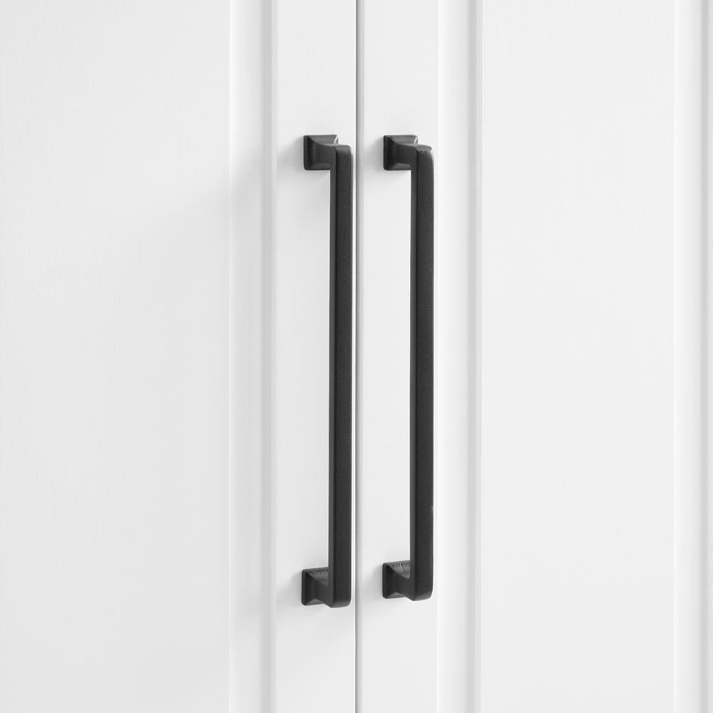 Material: Particle board 40%, MDF 40%, birch veneer 15%, poplar wood 5% Finish: White, black Oversized genuine metal hardware in a matte black finish Beautiful raised panels on storage cabinet doors and drawer fronts Pantry cabinet doors have magnetic closures Three adjustable and removable storage shelves Two large storage drawers with metal roller glides Two perforated half-round cable management holes Tapered legs with adjustable levelers Ideal for smaller spaces Pairs well with modern farmhouse and coastal decor Can be used as a linen cabinet, coffee bar cabinet, or laundry room storage Anti-tip hardware: Yes Indoor furniture