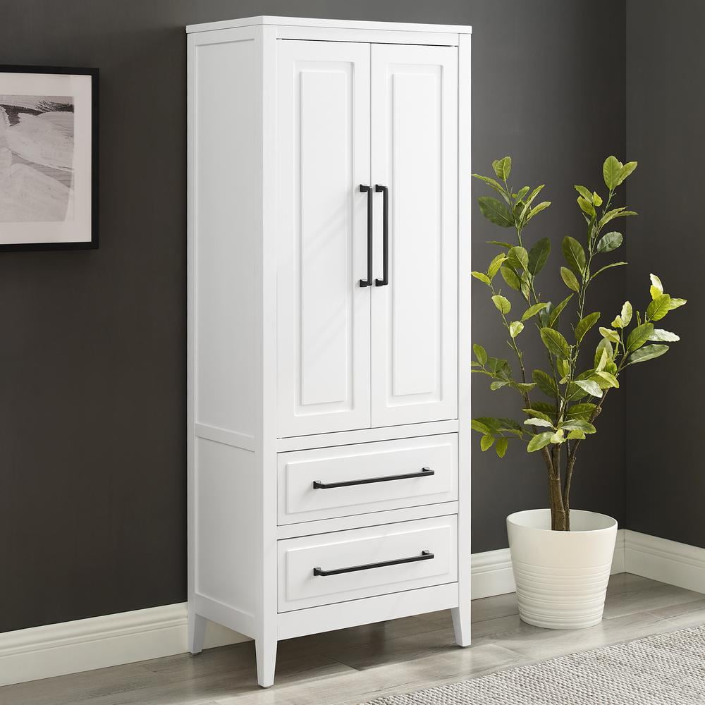 Versatile kitchen organization and storage with classic styling make the Genevieve Storage Pantry a perfect addition to your home. Featuring adjustable shelves and cable management holes, this freestanding storage cabinet accommodates everything from kitchenware to electronics. Two lower drawers offer ample storage for things like cooking utensils, office supplies, or even extra blankets. Scaled to fit any size room, this pantry is kitchen organization at its finest. Features: Material: Particle board 40%, MDF 40%, birch veneer 15%, poplar wood 5% Finish: White, black Oversized genuine metal hardware in a matte black finish Beautiful raised panels on storage cabinet doors and drawer fronts Pantry cabinet doors have magnetic closures Three adjustable and removable storage shelves Two large storage drawers with metal roller glides Two perforated half-round cable management holes Tapered legs with adjustable levelers Ideal for smaller spaces Pairs well with modern farmhouse and coastal decor Can be used as a linen cabinet, coffee bar cabinet, or laundry room storage Anti-tip hardware: Yes Indoor furniture Specifications: Product Dimensions: 60″H x 24″W x 14″D Product Weight: 92.4 lbs Product Dimensions: (Floor Clearance) 4.25″ Shelf Weight Capacity: 15 lbs Drawer Weight Capacity: 15 lbs