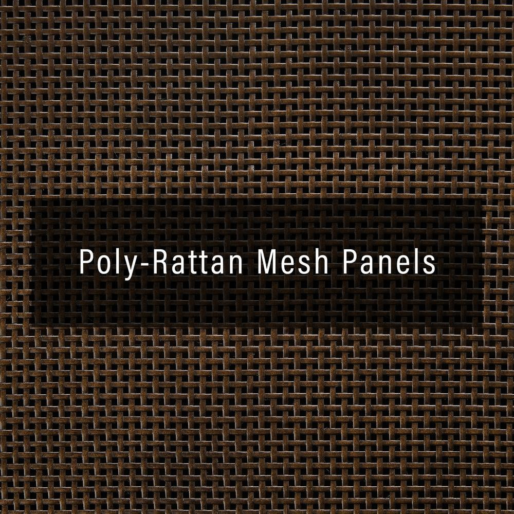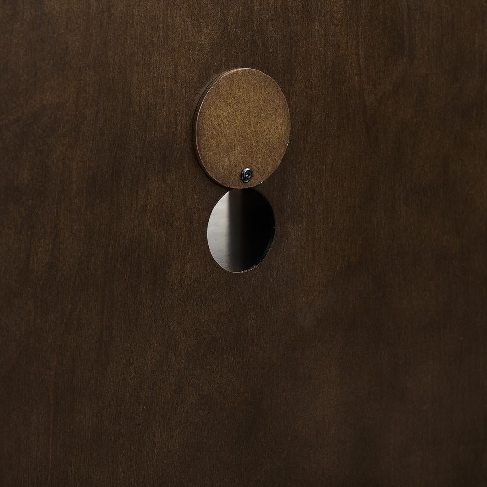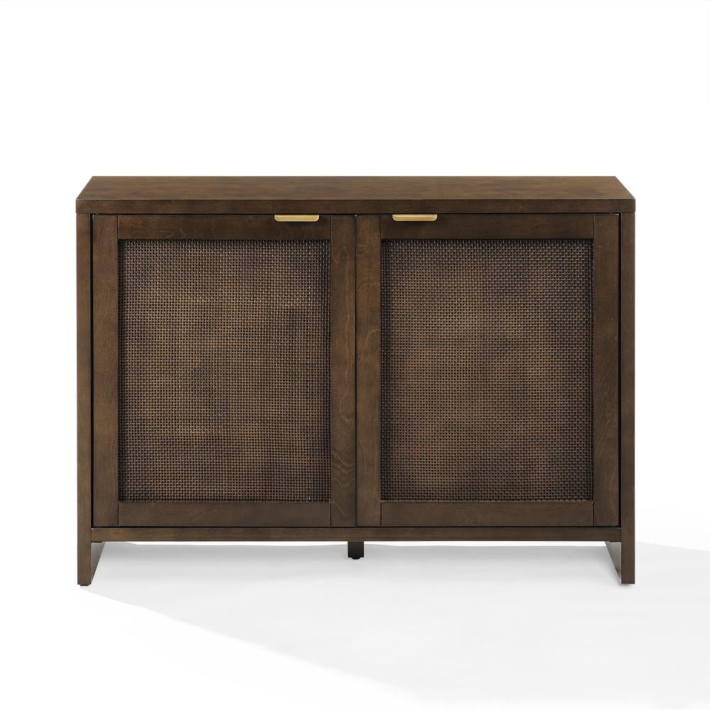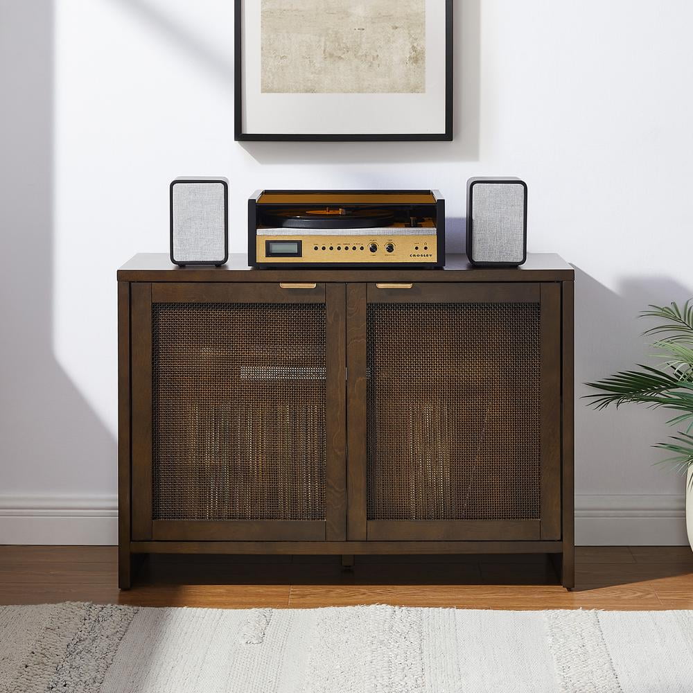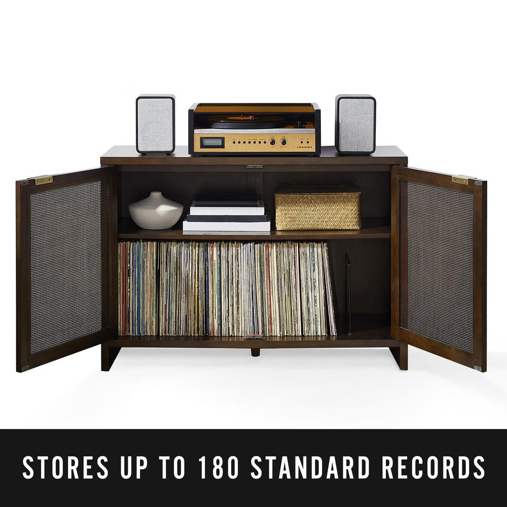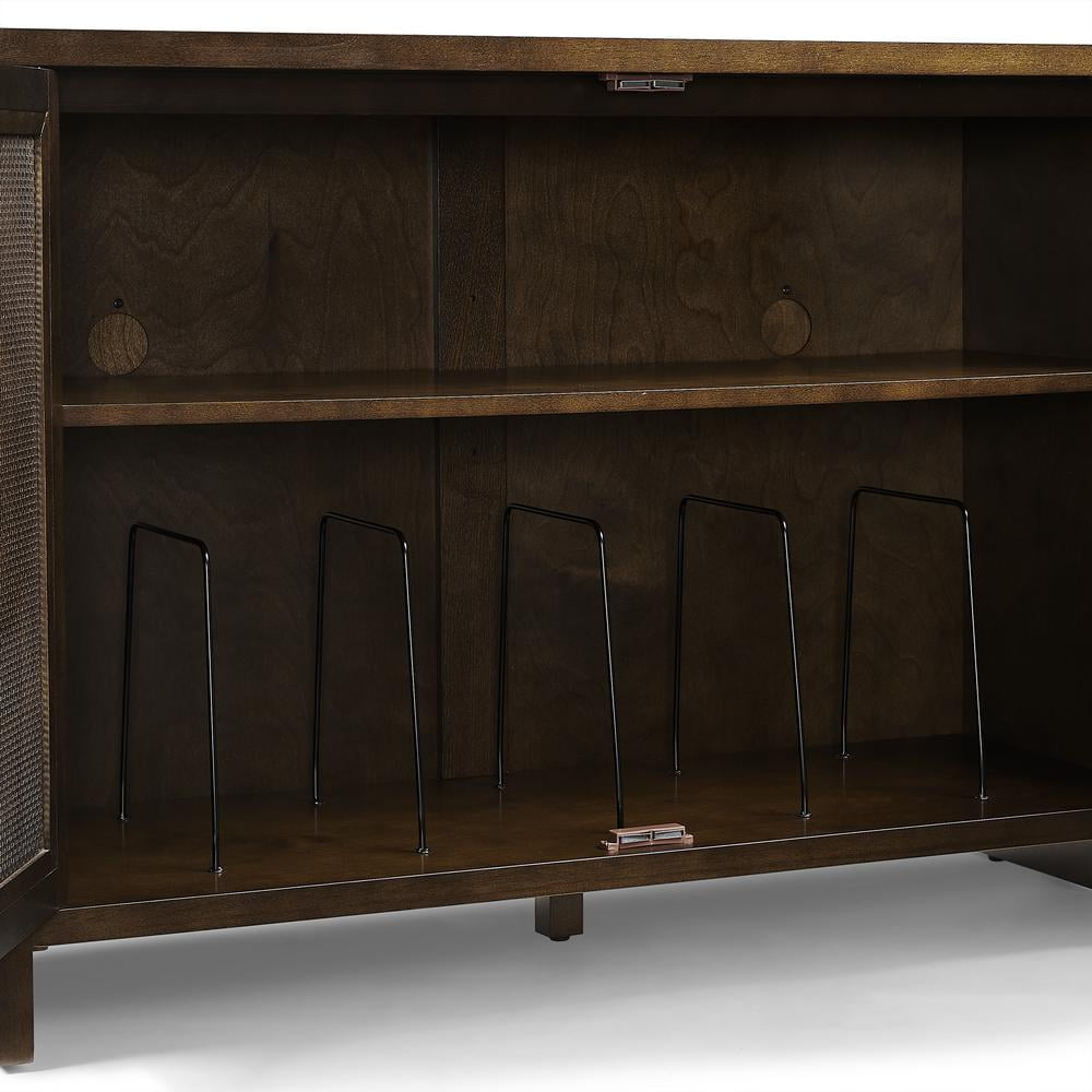 Modern media furniture Dark brown finish Genuine metal edge pull hardware in an antique brass finish Cabinet doors on the media console have handwoven poly-rattan mesh panels and magnetic closures Storage cabinet has one adjustable and removable shelf with a weight limit of 15lbs Lower shelf can hold up to 180 vinyl records with a maximum weight of 90lbs Five removable wire dividers for upright vinyl organization Two pre-cut cable management holes with swivel covers Adjustable levelers on legs Pairs well with modern farmhouse, traditional, and boho decor