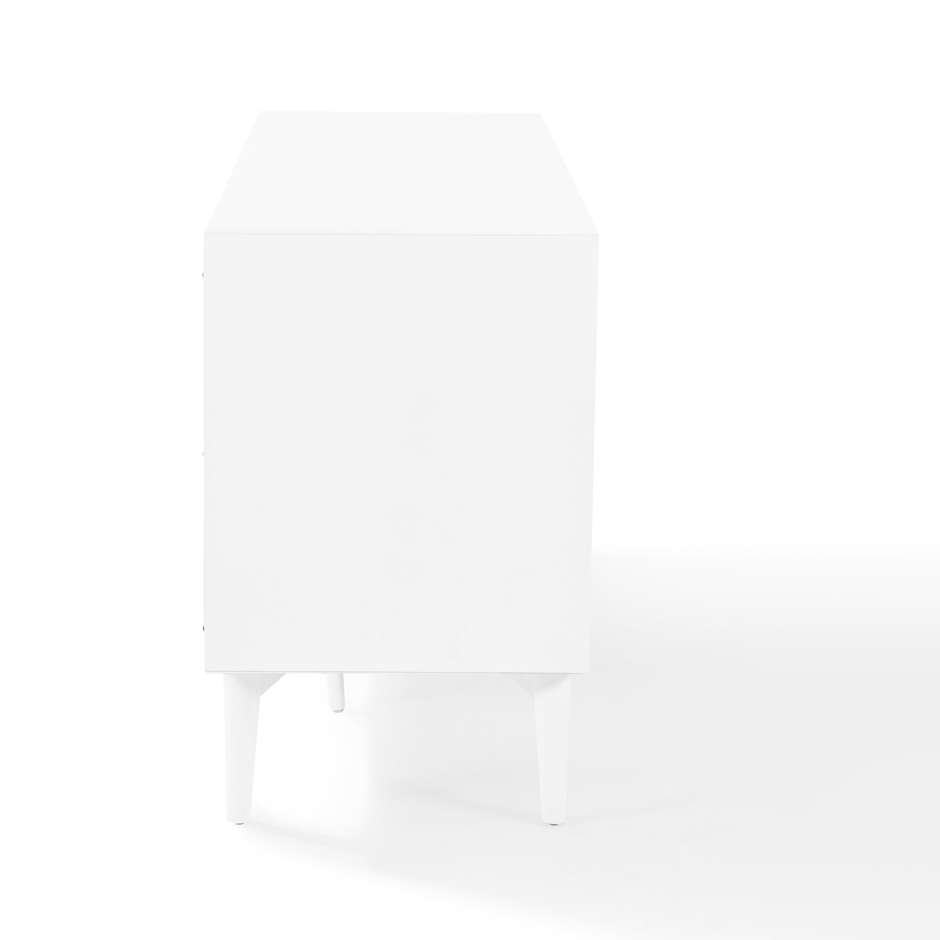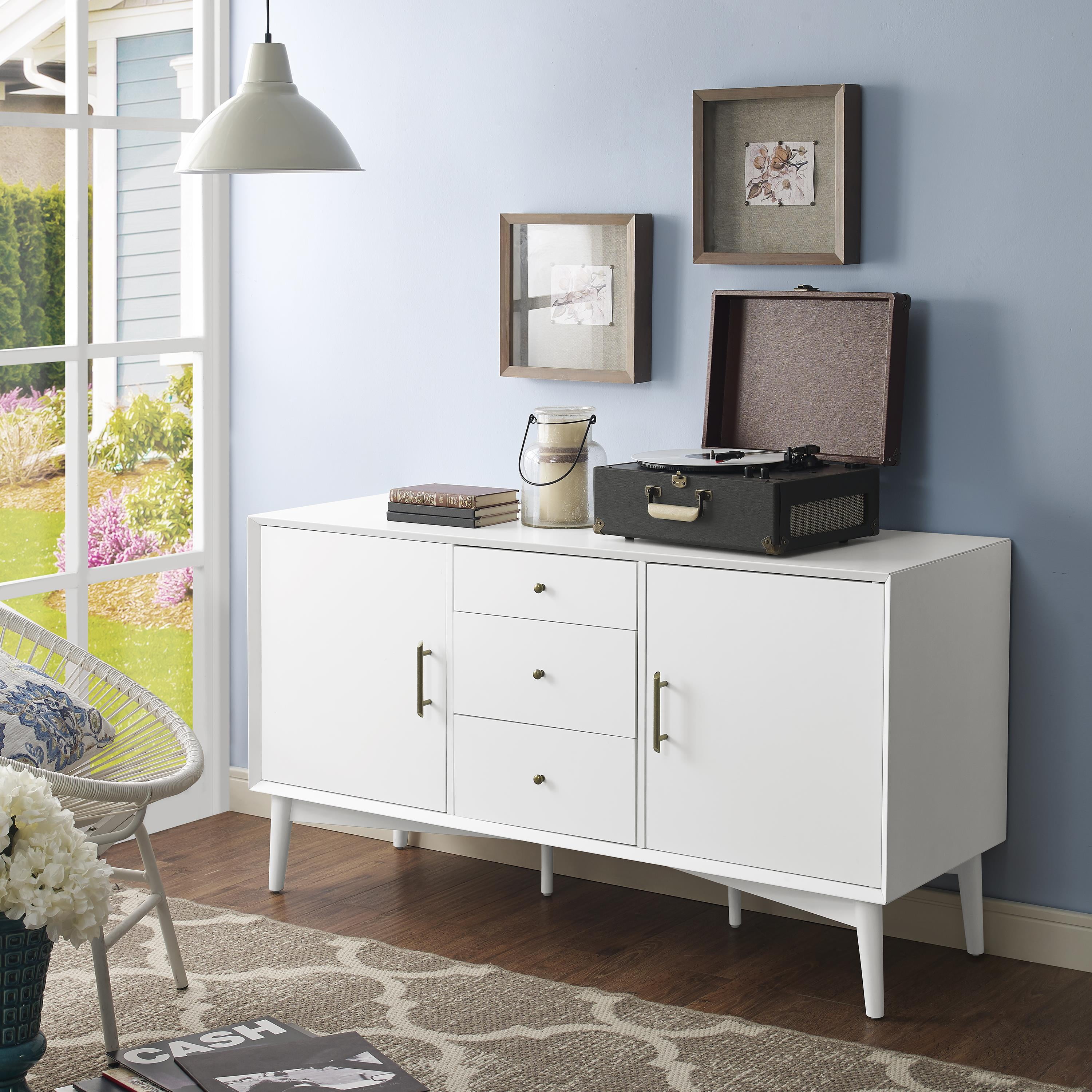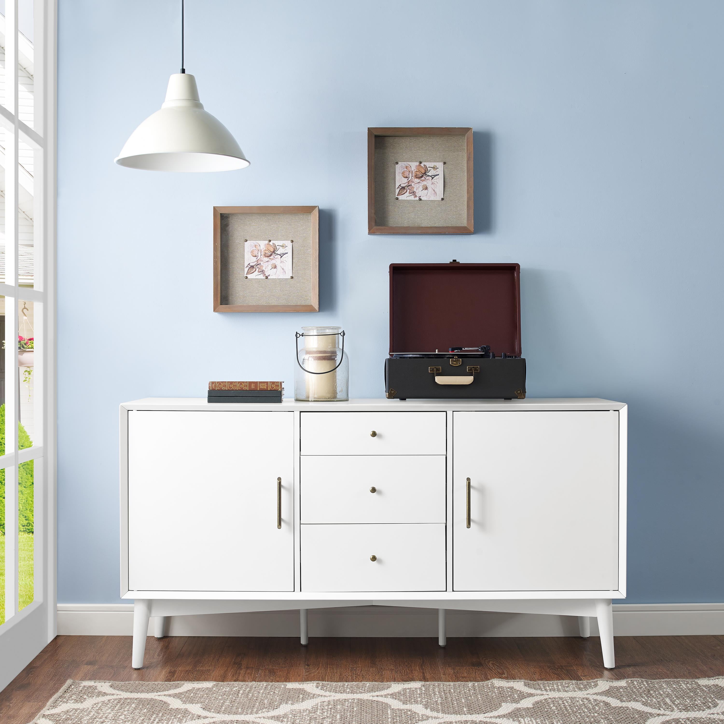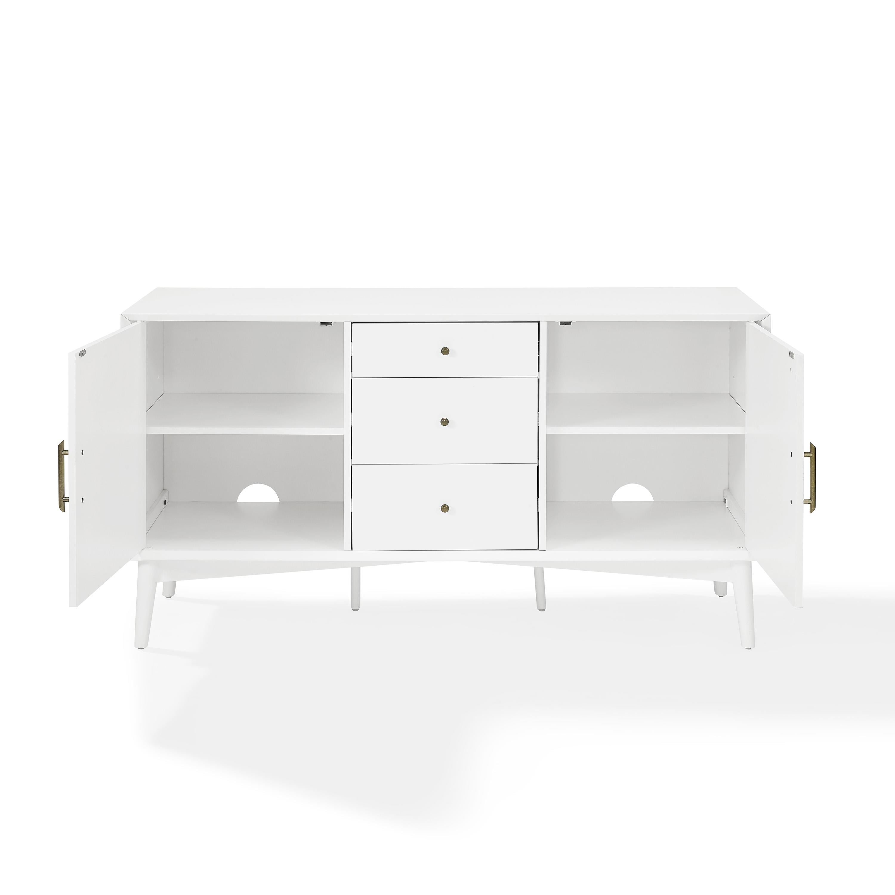 Mid-century modern design White finish Genuine metal hardware in an antique gold finish Two large cabinets with adjustable shelves Three large storage drawers on full-extension glides Tapered legs Two pre-cut holes for cable management Ideal for use as a sideboard or media cabinet Pairs well with modern, farmhouse, and rustic decor Single drawers have a 15lb weight limit Adjustable and removable shelf with a weight limit of 15lbs Sideboard top weight limit is 100lbs