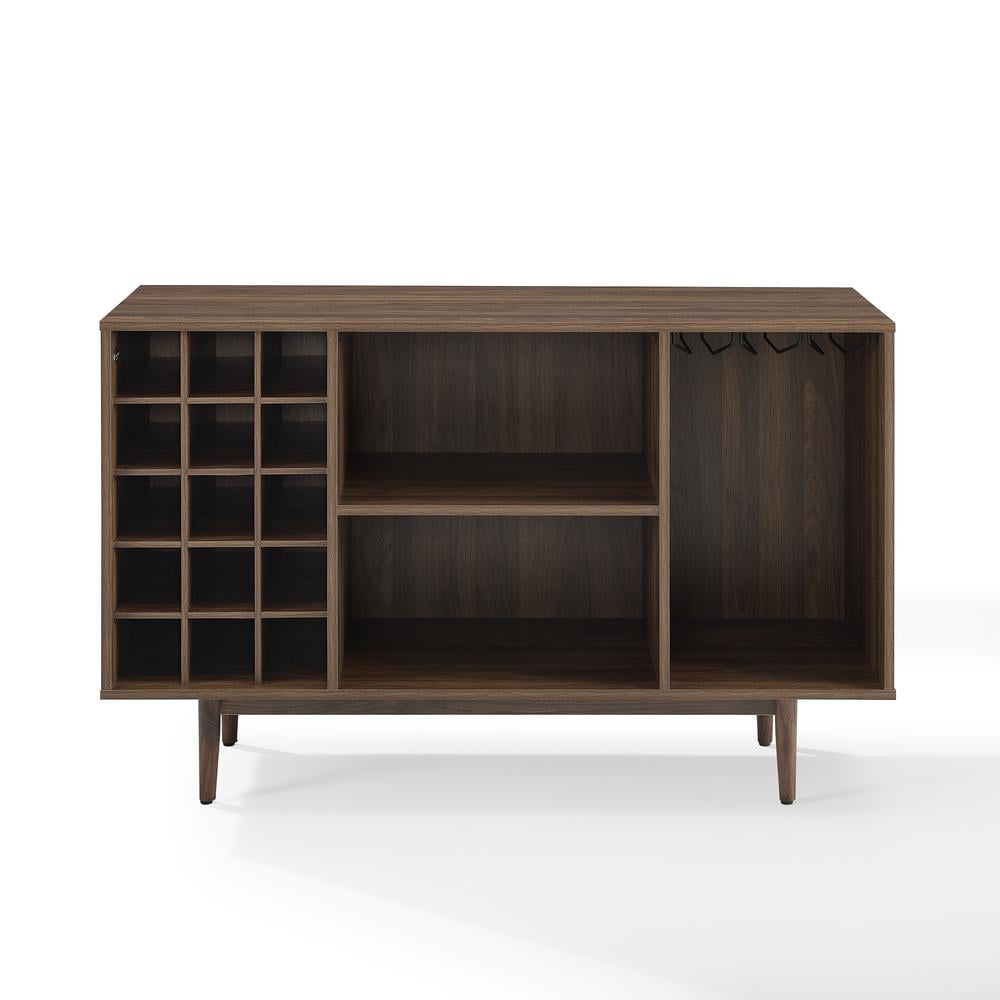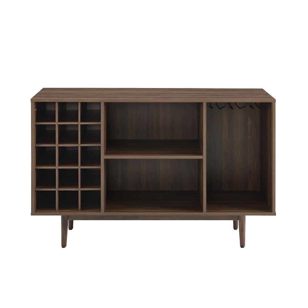 Simple and stunning, the Liam Wine Storage Sideboard has a mid-century style perfect for the modern wine lover. Perched atop classic tapered legs, this sideboard features three open compartments that can accommodate dishes and decor, plus a 15-bottle wine rack and slots for wine glasses. Add the Liam Sideboard to your dining or family room for wine storage and display space. Features: Material: Particle board 45%, MDF 35%, melamine 15%, poplar wood 5% Finish: Walnut Mid-century modern design Tapered legs Adjustable levelers on legs Three open storage compartments each with a weight limit of 20 lbs 15 compartment wine storage Metal under-shelf stemware rack Pairs well with industrial, rustic and modern decor Sideboard top weight limit is 100 lbs Specifications: Product Dimensions: 30.25″H x 47.75″W x 18″D Product Weight: 76.12 lbs Product Dimensions: (Floor Clearance) 5.5″
