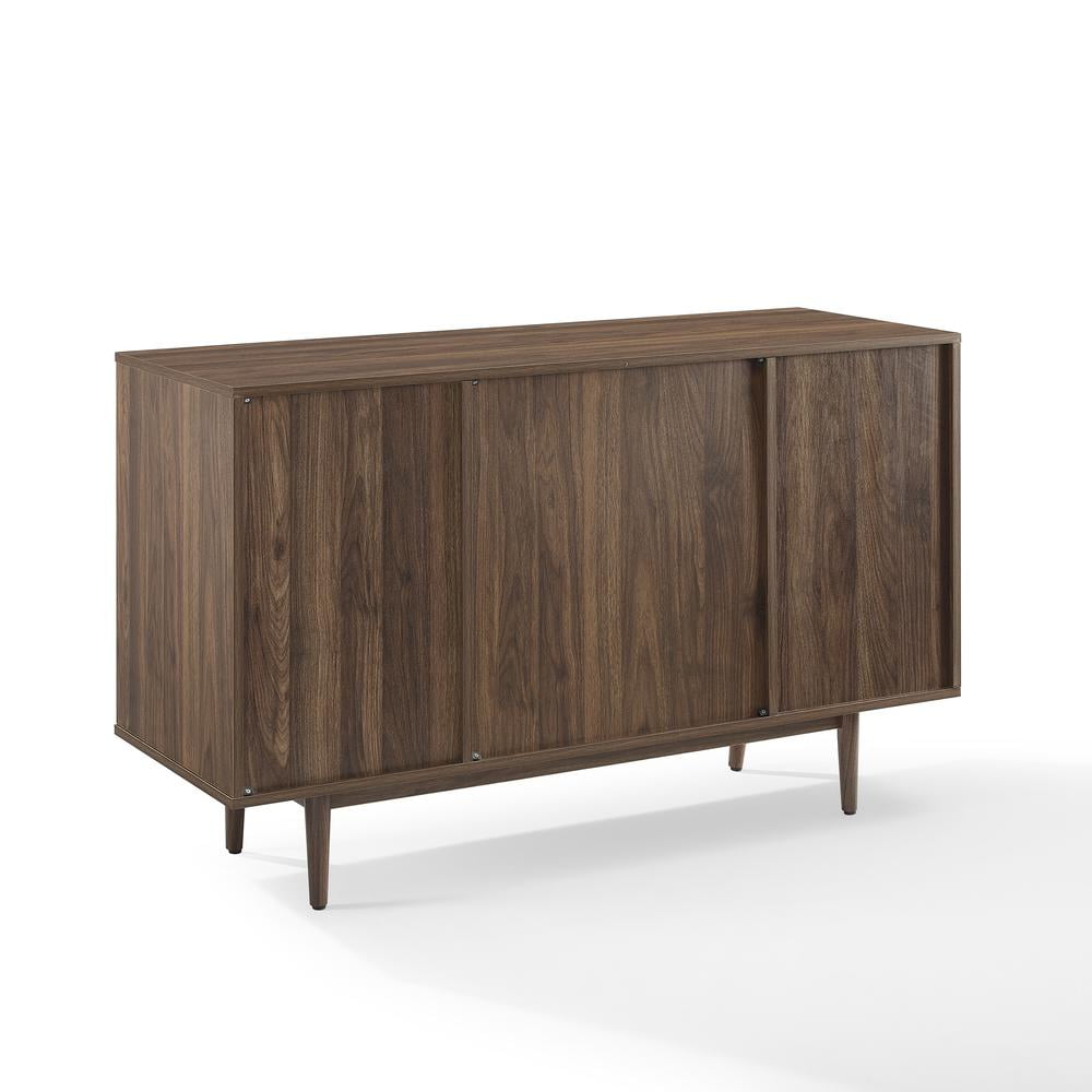 Material: Particle board 45%, MDF 35%, melamine 15%, poplar wood 5% Finish: Walnut Mid-century modern design Tapered legs Adjustable levelers on legs Three open storage compartments each with a weight limit of 20 lbs 15 compartment wine storage Metal under-shelf stemware rack Pairs well with industrial, rustic and modern decor Sideboard top weight limit is 100 lbs