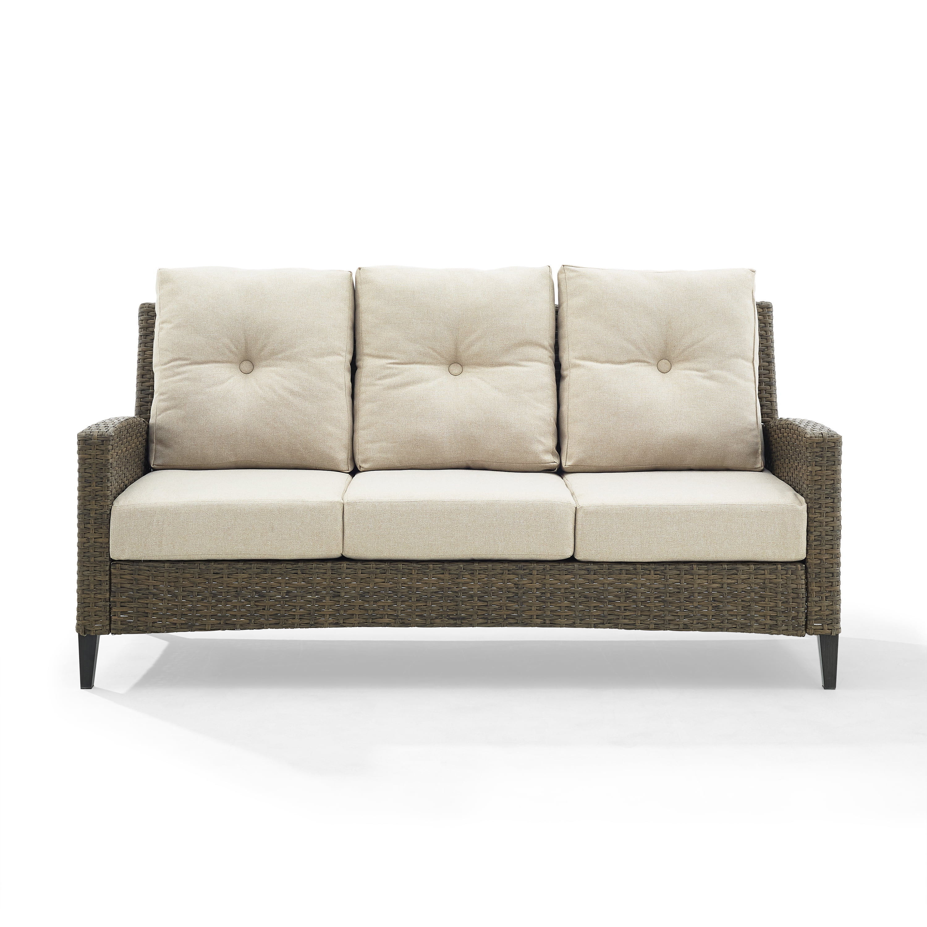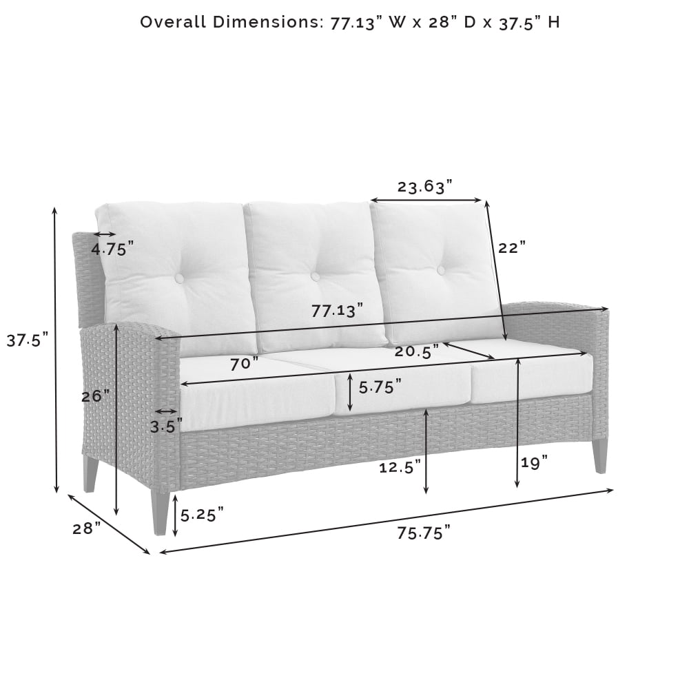 Bring classic style to your outdoor oasis with the Rockport Sofa. With a high back and gently arched arms, this sofa is built from all-weather resin wicker handwoven over a powder-coated steel frame. Plush seat and back cushions covered in olefin fabric offer durable comfort, while the unique tapered legs are made of sturdy steel that is hand-painted to look like real wood. The Rockport Sofa will be your go-to for outdoor lounging. Features: Finish: Oatmeal and Light Brown Material: Steel 50.00%, Pe Wicker 30.00%, Foam 10.00%, Olefin Fabricc 10.00% Anti-Tip Hardware Included: No Traditional design UV resistant all-weather reed style flat resin wicker Weather-resistant powder-coated steel frame Handwoven light brown resin wicker Oatmeal cushion covers Quick-drying olefin fabric cushion covers resist sun fade Moisture-resistant high grade cushion cores Back cushion features a single button tuft 5.75″ thick seat cushion and 4.75″ thick back cushion Steel tapered legs are hand-painted, offering a natural wood look with better durability than traditional wood furniture Adjustable levelers on legs Seating for up to three Specifications: Product Dimensions: 37.5″ H x 77.13″ x W 28″ D Seat Dimensions: 19″ H x 20.5″ D Product Weight: 75.68 lbs