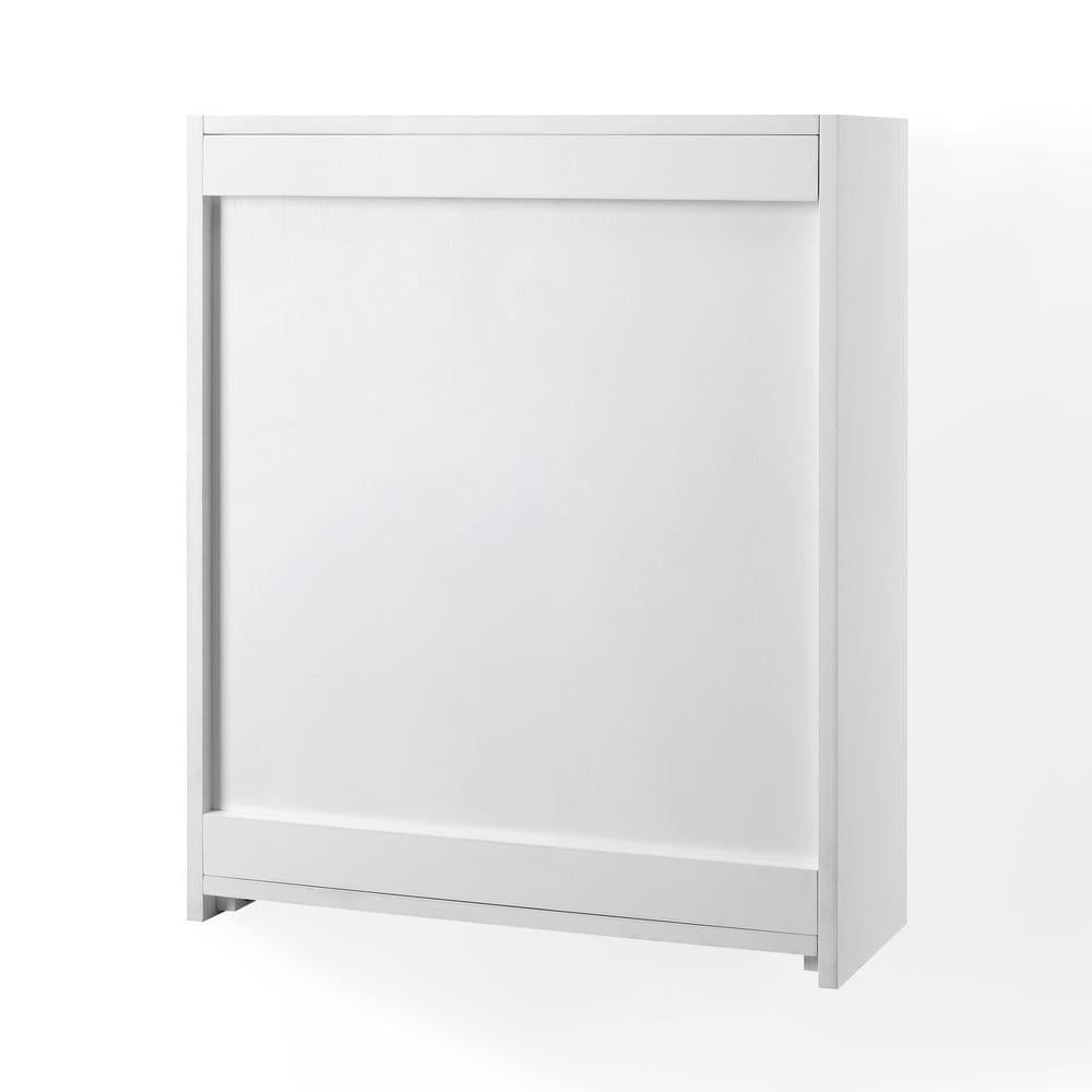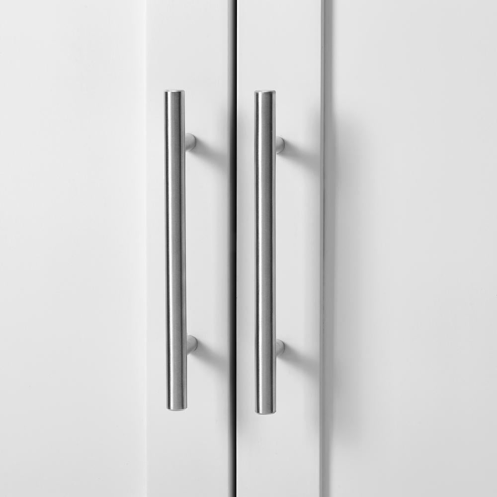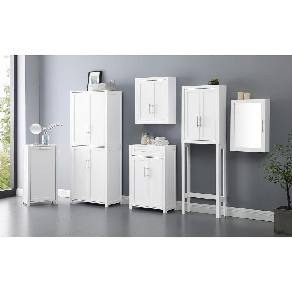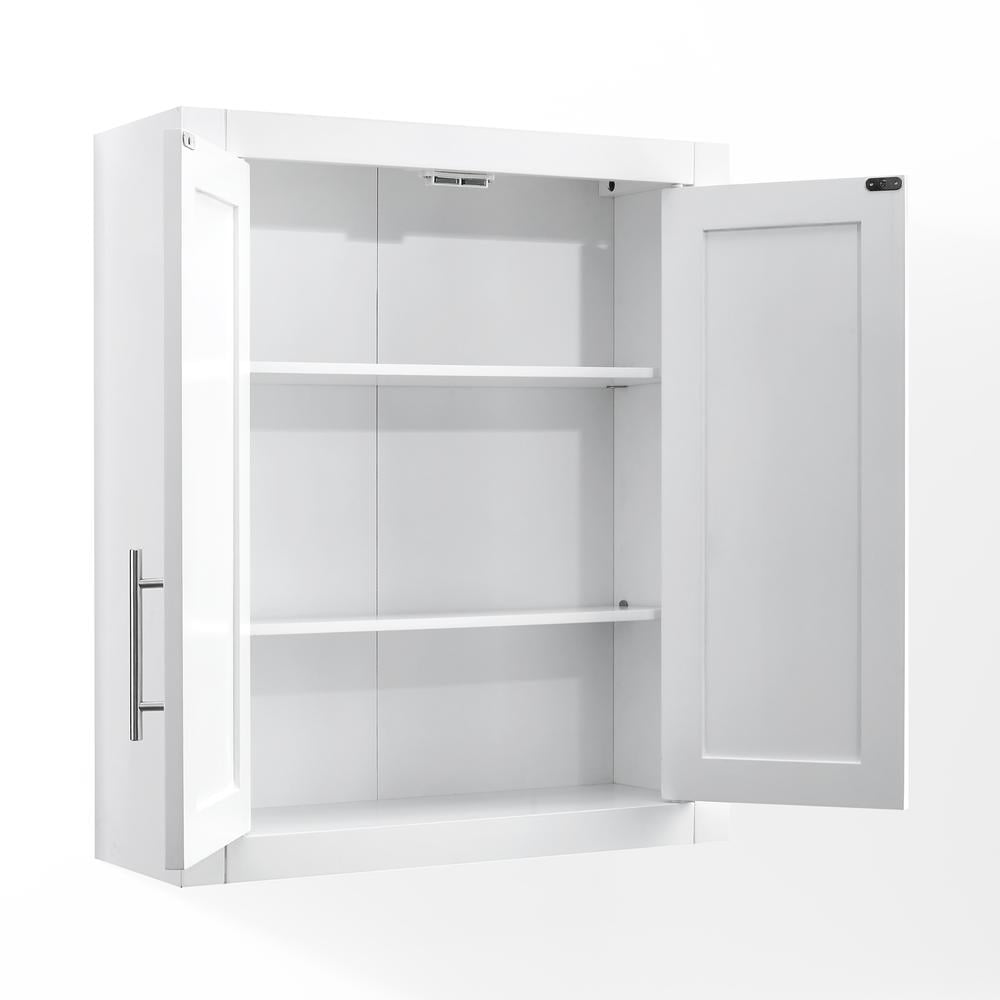 Material: MDF wood 80%, birch veneer 20% Finish: White, chrome Cabinet doors have magnetic closures Shaker-style recessed panels on cabinet doors Two adjustable and removable shelves Mounts flush against the wall with sturdy support rail Pairs well with modern, minimalist, traditional, and farmhouse decor Total wall shelf weight limit is 50lbs Anti-tip hardware: No Indoor furniture