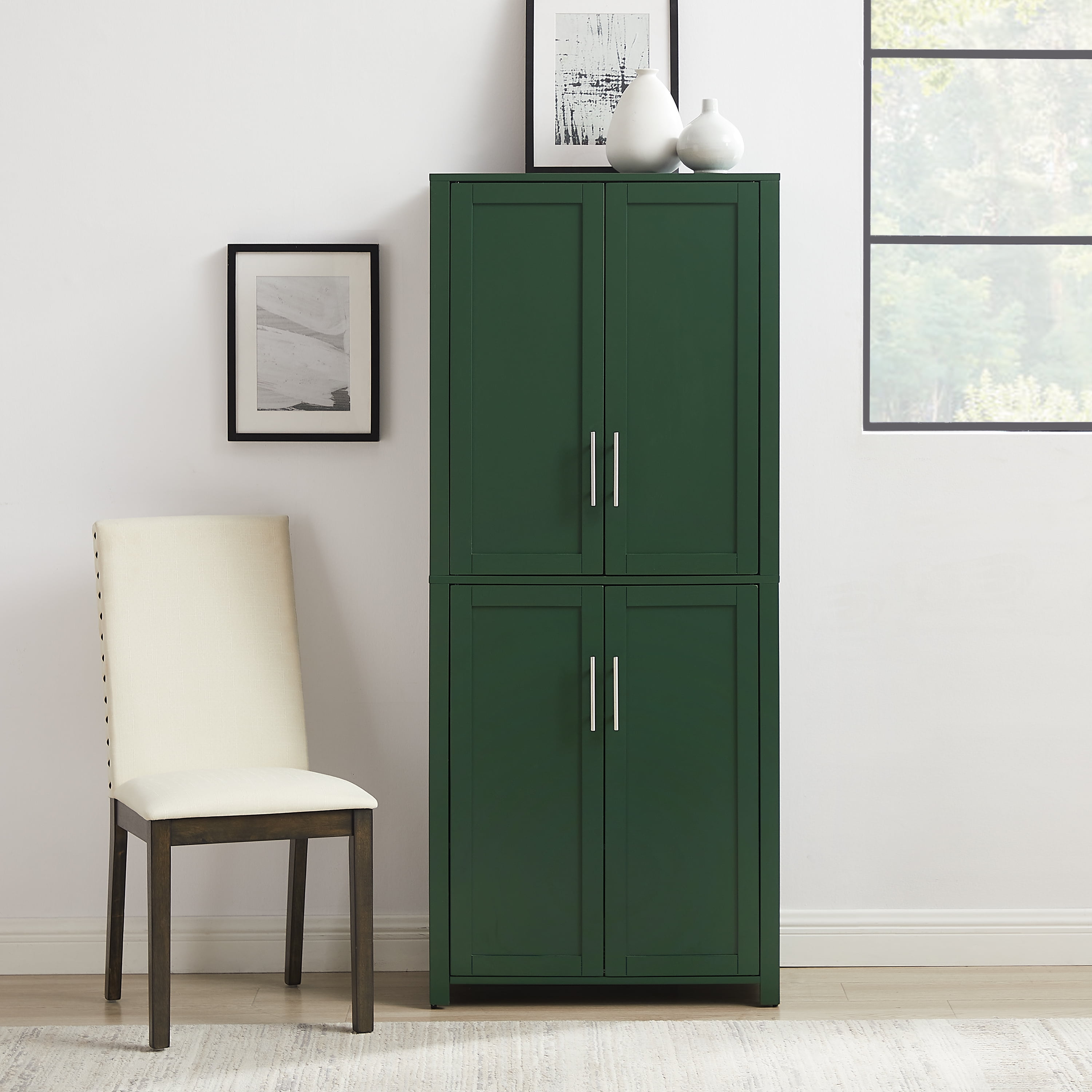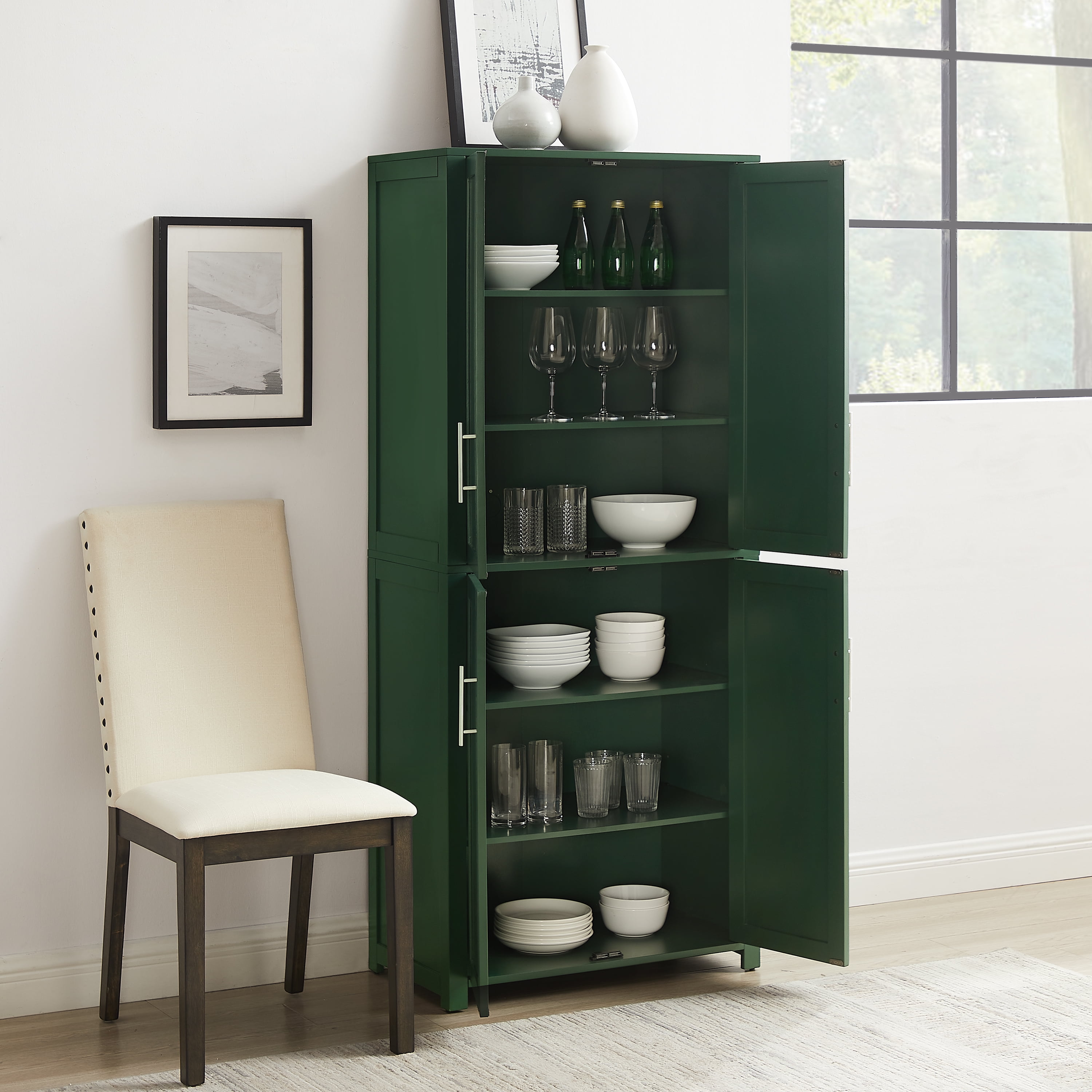 TRADITIONAL STYLE: With a classic hunter green finish and brushed nickel hardware, this kitchen pantry is a stylish addition to your home. Shaker-style recessed panels on the doors complete the traditional look. SPACIOUS STORAGE: The pantry features two cabinets with double doors, magnetic closures, and adjustable shelves. Each adjustable shelf has a weight capacity of up to 15 lbs. MODULAR ORGANIZATION: Designed to sit flush against one another, multiple pantry units can be paired together for expanded storage and organization. MULTI-USE PANTRY: This storage cabinet features a covered cable management hole and can be used as a coffee bar, linen cabinet, or laundry room storage. It pairs beautifully with modern, minimalist, and farmhouse home décor. AMERICAN LEGACY: Inspired by over 100 years of the Crosley legacy, Crosley Furniture offers style for every space, from retro to modern. Crosley products are proudly designed in the USA and come with USA-based customer support.