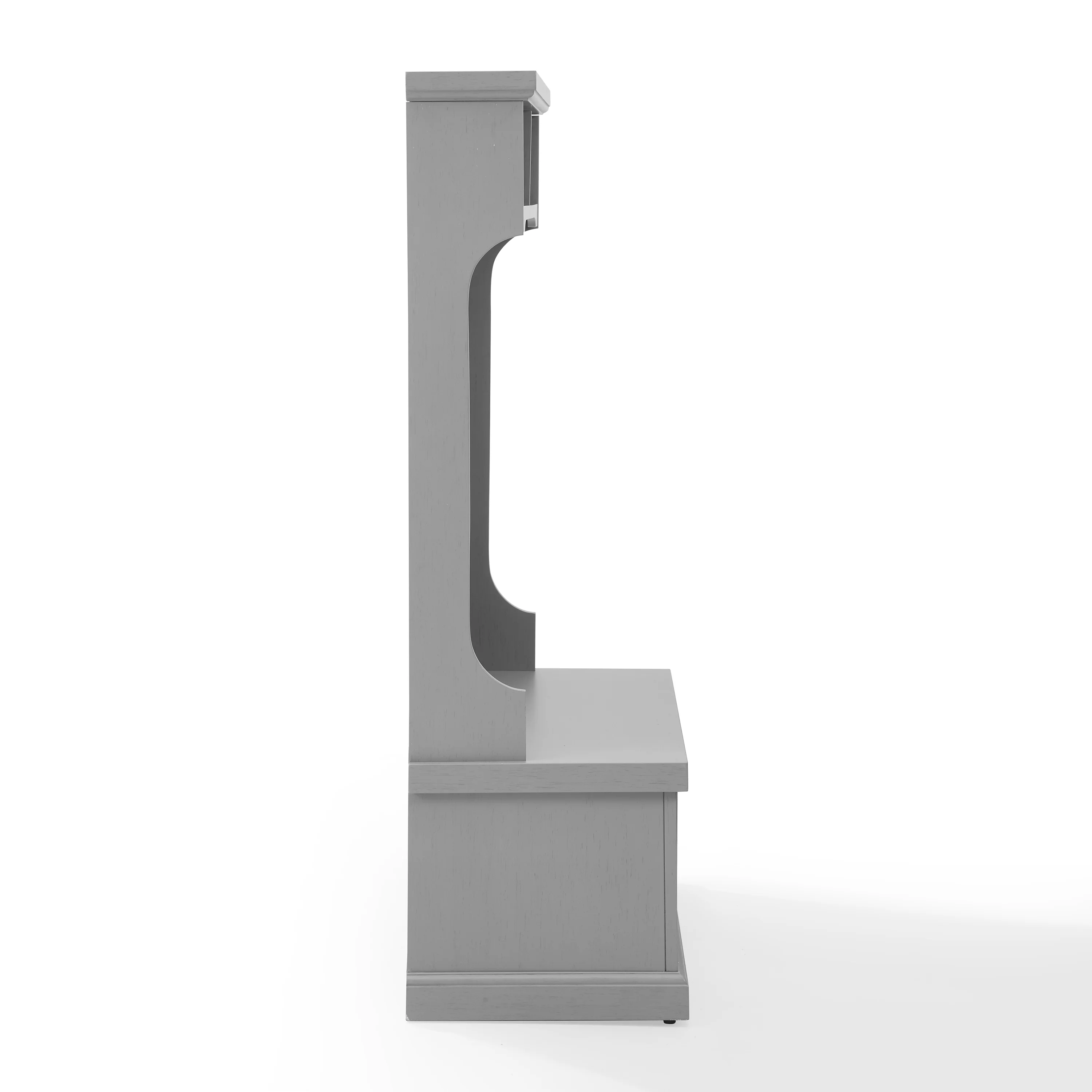 Material: Particle board 70%, birch veneer 20%, solid poplar wood 10% Finish: Distressed gray, chrome Coastal design Genuine metal hardware in an antique gold finish Beadboard paneling Hinged drop-down cabinet door on the bench Drop-down door has a magnetic closure Four double prong metal hooks for hanging coats, hats, and scarves Storage hooks have a 5lb weight limit Open top shelf for display or storage Pairs well with traditional and modern farmhouse decor Anti-tip hardware: Yes Indoor furniture