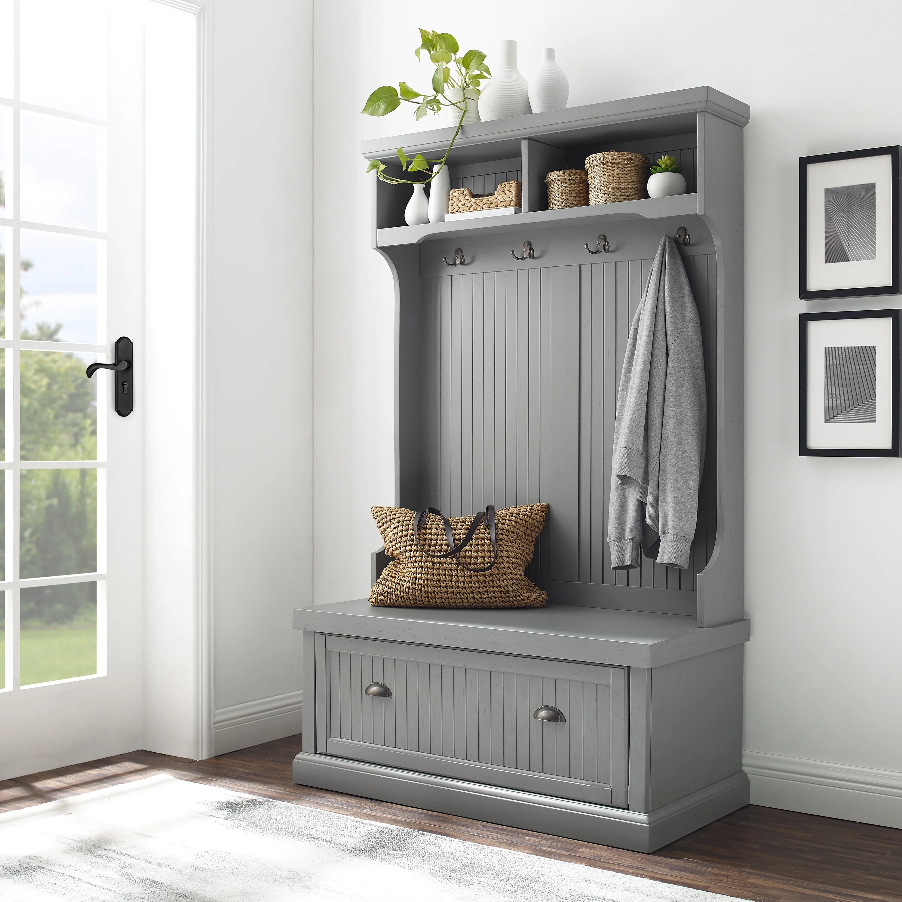 Add coastal flair to your mudroom with the Seaside Hall Tree. This full-size entryway bench with coat rack offers both seating and shoe storage in an elegant package. The lower storage bench offers two large cubbies behind a pull-down door, perfect for use as a shoe rack. Two overhead storage shelves organize smaller items, while four double-prong hooks make a great coat tree. Beautifully crafted with beadboard accents and high-end distressing, the Seaside Hall Tree will elevate your home organization. Features: Material: Particle board 70%, birch veneer 20%, solid poplar wood 10% Finish: Distressed gray, chrome Coastal design Genuine metal hardware in an antique gold finish Beadboard paneling Hinged drop-down cabinet door on the bench Drop-down door has a magnetic closure Four double prong metal hooks for hanging coats, hats, and scarves Storage hooks have a 5lb weight limit Open top shelf for display or storage Pairs well with traditional and modern farmhouse decor Anti-tip hardware: Yes Indoor furniture Specifications: Product Dimensions: 64.5″H x 40″W x 18.5″D Product Weight: 94.6 lbs Shelf Weight Capacity: 20 lbs