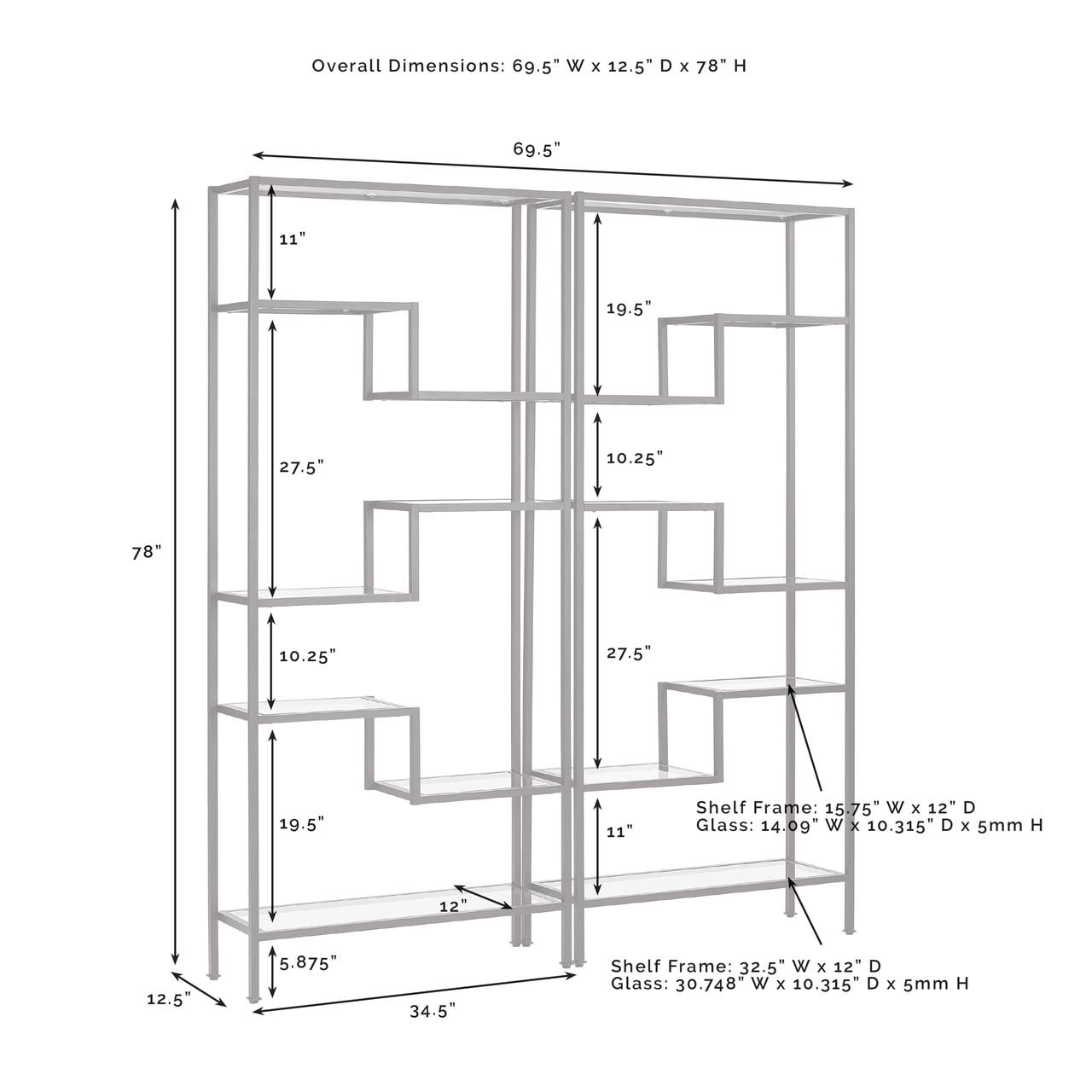 Modern beauty and functional simplicity are the hallmarks of the Sloane 2-Piece Etagere Bookcase Set. Ready to display precious keepsakes or your favorite books, this bookshelf set’s sculptural steel frame features sturdy tempered glass shelves. With variable shelf heights in an Art Deco design, this modern bookshelf is sure to be the focal point of your living room or home office. Features: Set includes: 2 etageres Material: Metal (steel) 80%, tempered glass 20% Finish: Gold, clear Art deco inspired design Frames are constructed of sturdy steel 14 tempered glass shelves Variable shelf heights Adjustable levelers on legs Modular design allows multiple units to be paired together Pairs well with modern and glam decor Anti-tip hardware: Yes Indoor furniture Specifications: Product Dimensions: 78″H x 69.5″W x 12.5″D Product Weight: 105.16 lbs Shelf Weight Capacity: 20 lbs Product Dimensions: (Floor Clearance) 5.88″