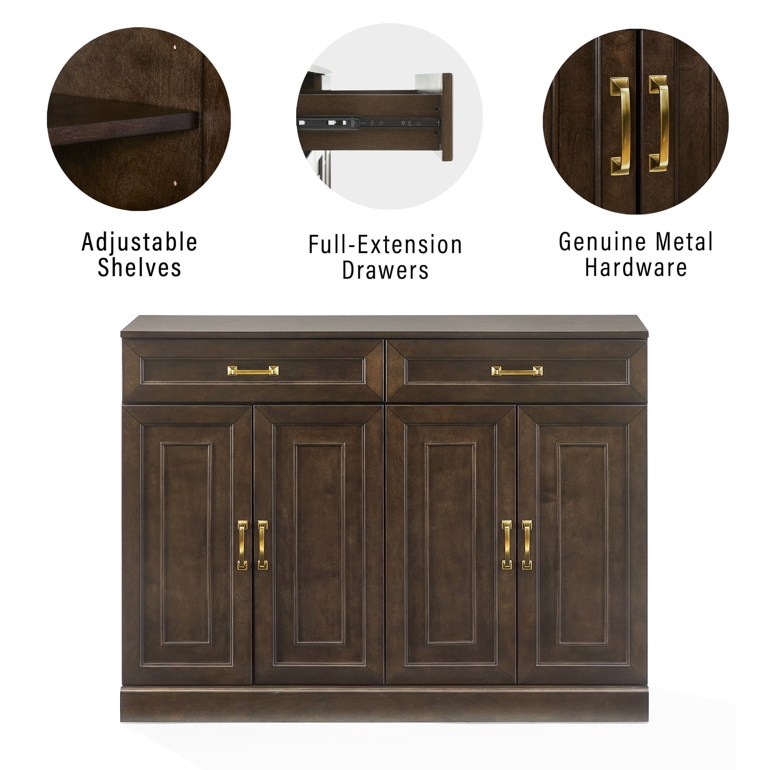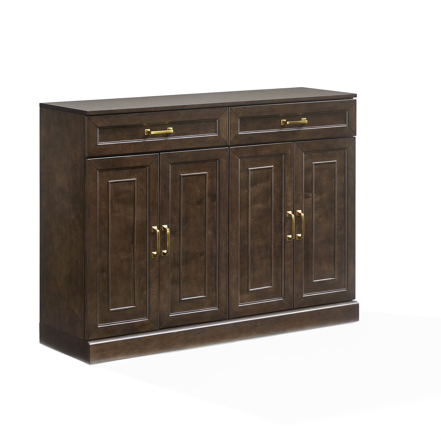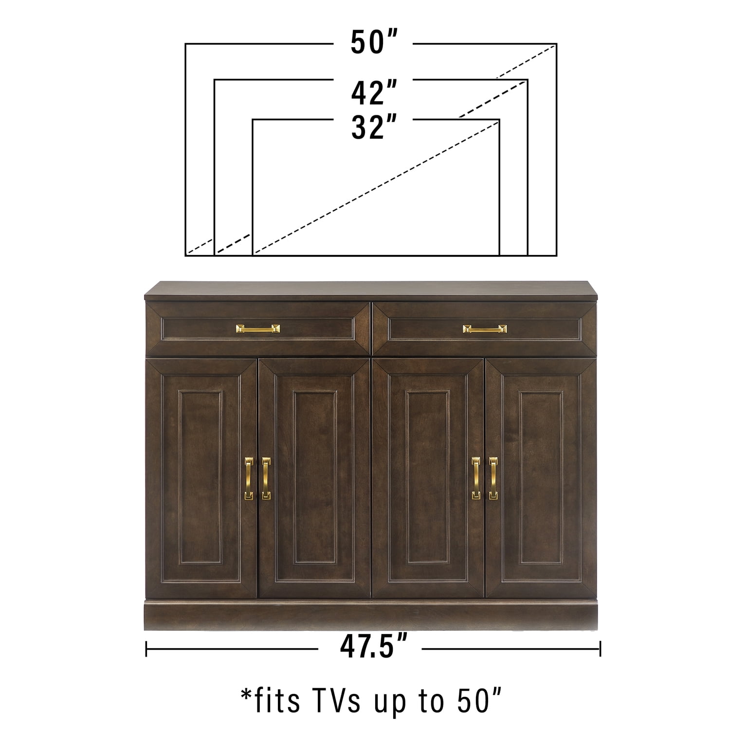 TRADITIONAL STYLE: With a beautiful coffee finish and recessed panels, this sideboard adds a touch of class to any space. SPACIOUS STORAGE: Both cabinets feature double doors, magnetic closures, and concealed hinges. The cabinets also include adjustable shelves, each with a 15 lb. weight capacity. MODULAR ORGANIZATION: This sideboard pairs seamlessly with other pieces from the collection, making it easy to expand your storage and keep things organized. VERSATILE DESIGN: Use this sideboard as a bar cabinet, coffee bar, or credenza. It also works perfectly as a TV stand for screens up to 50 inches, supporting 100 lbs on its top. AMERICAN LEGACY: Inspired by over 100 years of the Crosley legacy, Crosley Furniture offers style for every space, from retro to modern. Crosley products are proudly designed in the USA and come with USA-based customer support.