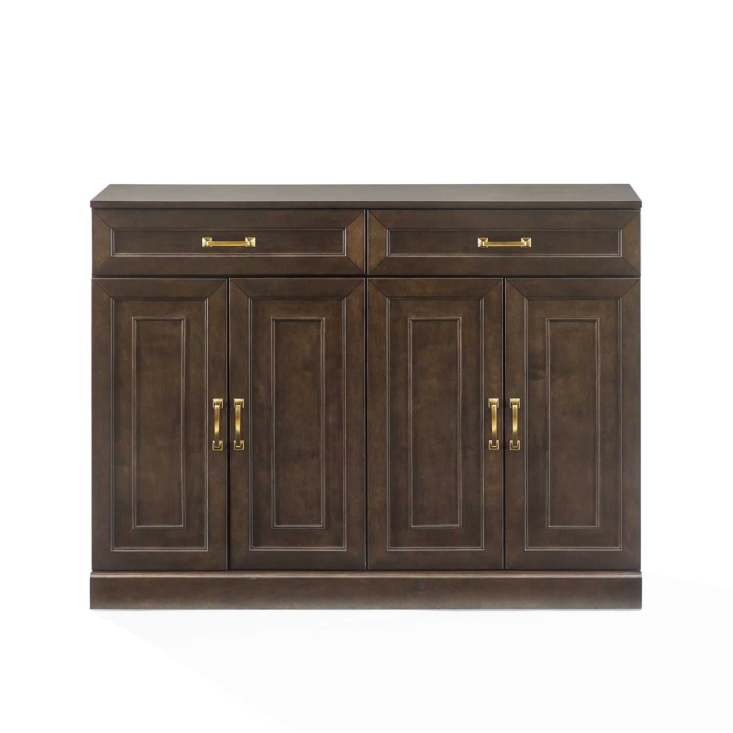 Stanton Sideboard The Stanton Sideboard brings versatile storage to any room. Featuring two large kitchen cabinets with adjustable shelves and two full-extension drawers, this credenza is great for home organization. Useful as a classic dining room sideboard or as a TV stand, the Stanton Sideboard’s modular design pairs with other items in the collection for customizable storage. TRADITIONAL STYLE: With a beautiful coffee finish and recessed panels, this sideboard adds a touch of class to any space. SPACIOUS STORAGE: Both cabinets feature double doors, magnetic closures, and concealed hinges. The cabinets also include adjustable shelves, each with a 15 lb. weight capacity. MODULAR ORGANIZATION: This sideboard pairs seamlessly with other pieces from the collection, making it easy to expand your storage and keep things organized. VERSATILE DESIGN: Use this sideboard as a bar cabinet, coffee bar, or credenza. It also works perfectly as a TV stand for screens up to 50 inches, supporting 100 lbs on its top. AMERICAN LEGACY: Inspired by over 100 years of the Crosley legacy, Crosley Furniture offers style for every space, from retro to modern. Crosley products are proudly designed in the USA and come with USA-based customer support.