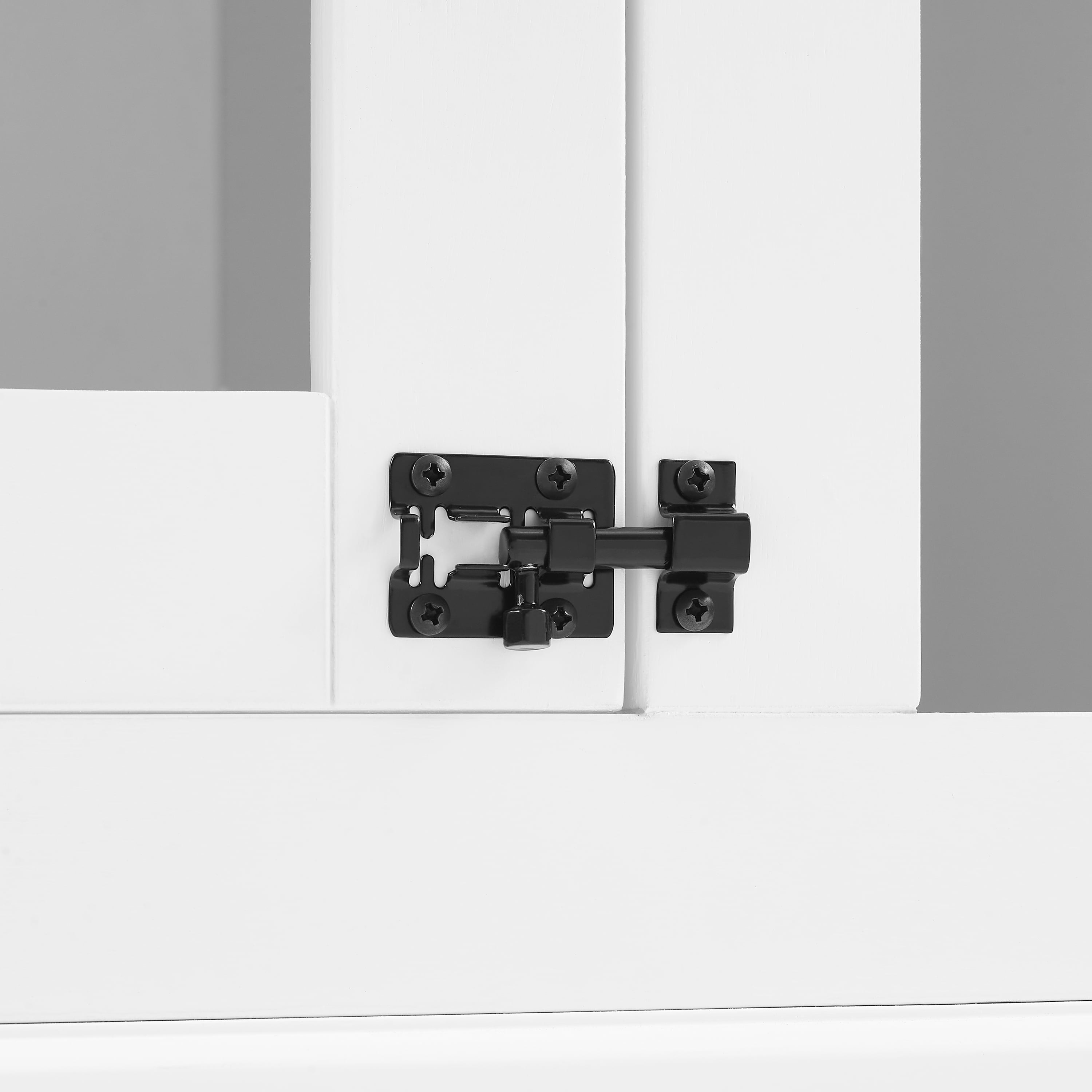 Traditional design White pet crate with black genuine metal hardware Console top has a dark brown finish Two classic barrel bolt latches and sturdy steel bars on dog kennel Corner hugging design Designed for small pets Can fit pet beds up to 30″W x 20″D Only recommended for well-behaved, crate-trained pets – not ideal for passionate chewers, escape artists, or accident-prone animals Pairs well with modern farmhouse decor Credenza top weight limit is 100lbs Interior Pet Storage Dimensions: 50.5”W x 31.38”D x 24.75”H
