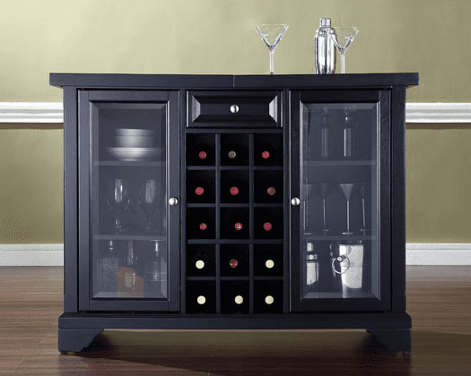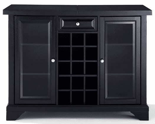 Elegantly entertain guests with this sliding top bar cabinet constructed of solid hardwood and wood veneers. The beautiful beveled/ tempered glass doors and raised panel drawer front are classically styled to enhance any home decor. The sliding top expands to greatly increase the size of your serving area. Behind the two doors, you will find adjustable shelves and plentiful storage space for spirits, appliances and other items that require additional space. The center storage area is great for up to 15 bottles of wine, or if you prefer, remove the wine storage cubes to reveal an adjustable shelf. Style, function, and quality make this sliding top bar cabinet a wise addition to your home. Features: Finish: Black Material: Birch Veneer 13.333%, Glass 3.333%, MDF, Particle Board 43.333%, Solid Hardwood & Veneers 16.667%, Solid Poplar Wood 3.333%, Solid Rubberwood 16.667%, Steel 3.333% Sliding expandable top Hand-rubbed, multi-step finish Beveled/ tempered glass doors Brushed nickel hardware Plenty of room for storing barware and spirits Doubles as a serving station when entertaining Adjustable levelers in legs Specifications: Product Dimensions: 36″ H x 64.5″ W x 19″ D Product Weight: 220 lbs Number of Doors: 2 Number of Drawers: 1 Number of Shelves: 21 Arm Height: 0 Back Dimensions: 0 Back Height (IN) Product Dimensions: 3.25 Floor Clearance (IN)