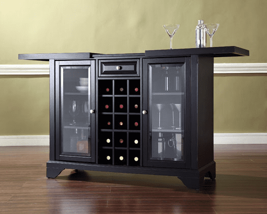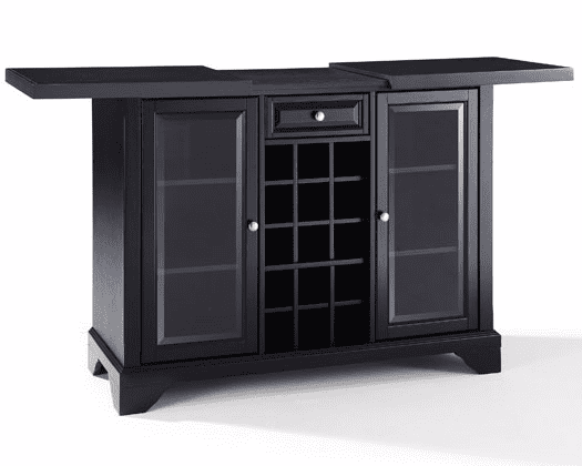 Finish: Black Material: Birch Veneer 13.333%, Glass 3.333%, MDF, Particle Board 43.333%, Solid Hardwood & Veneers 16.667%, Solid Poplar Wood 3.333%, Solid Rubberwood 16.667%, Steel 3.333% Sliding expandable top Hand-rubbed, multi-step finish Beveled/ tempered glass doors Brushed nickel hardware Plenty of room for storing barware and spirits Doubles as a serving station when entertaining Adjustable levelers in legs