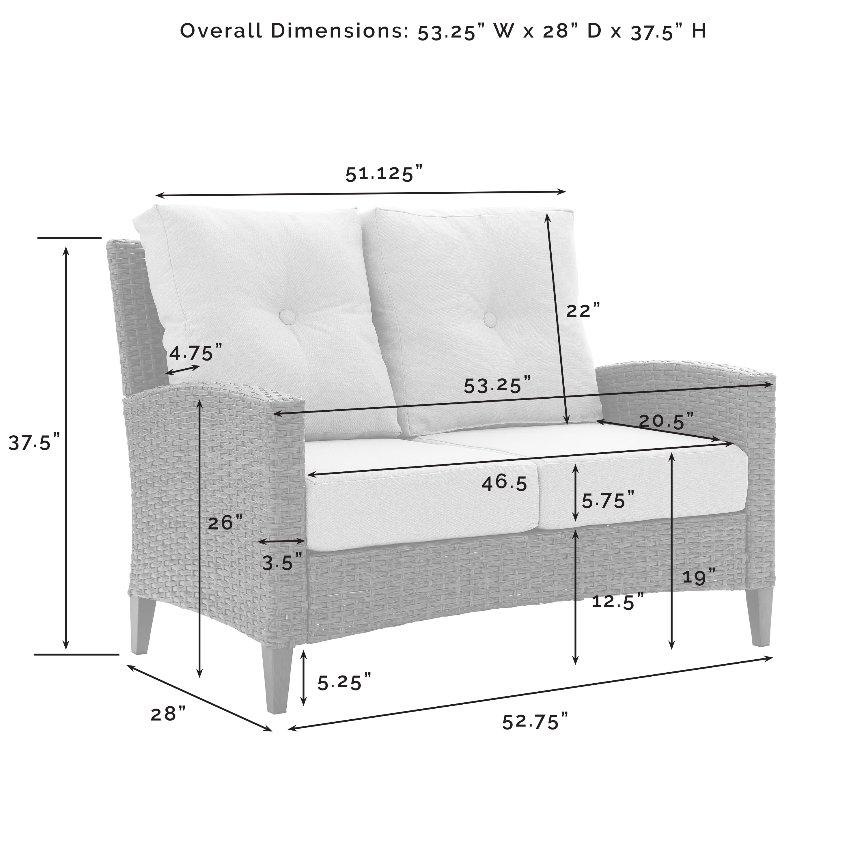 Bring classic style to your outdoor oasis with the Rockport Loveseat. With a high back and gently arched arms, this outdoor wicker loveseat is built from all-weather resin wicker over a powder-coated steel frame. Plush seat and back cushions covered in olefin fabric offer durable comfort, while the unique tapered legs are made of sturdy steel painted to look like real wood. The Rockport Loveseat will be your go-to for outdoor lounging. Features: Finish: Oatmeal and Light Brown Materials: 50.00% Steel, 30.00% PE Wicker, 10.00% Olefin Fabric, 10.00% Foam Transitional design UV resistant outdoor resin wicker Durable powder-coated steel frame Light brown reed-style flat wicker Quick-drying olefin fabric cushion covers Oatmeal colored cushions Back cushions feature a single button tuft Removable cushion covers are machine washable Steel tapered legs painted with a faux wood finish improve the durability of the furniture Specifications: Product Dimensions: 37.50″ H x 53.25″ W x 28.00″ D Product Weight: 51.92 lbs Pillow / Cushion Dimensions: Back cushion is 4.75″ thick and seat cushion is 5.75″ thick Arm Height: 26 Back Dimensions: 22 Back Height (IN) Product Dimensions: 5.25 Floor Clearance (IN)
