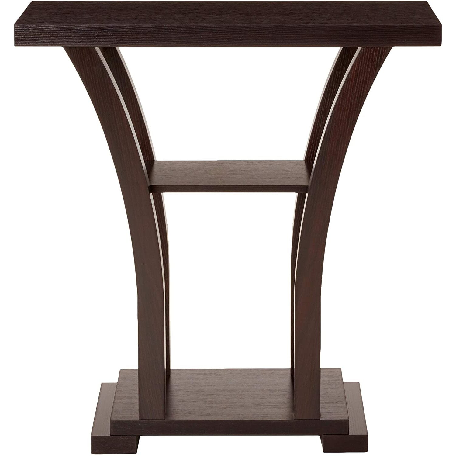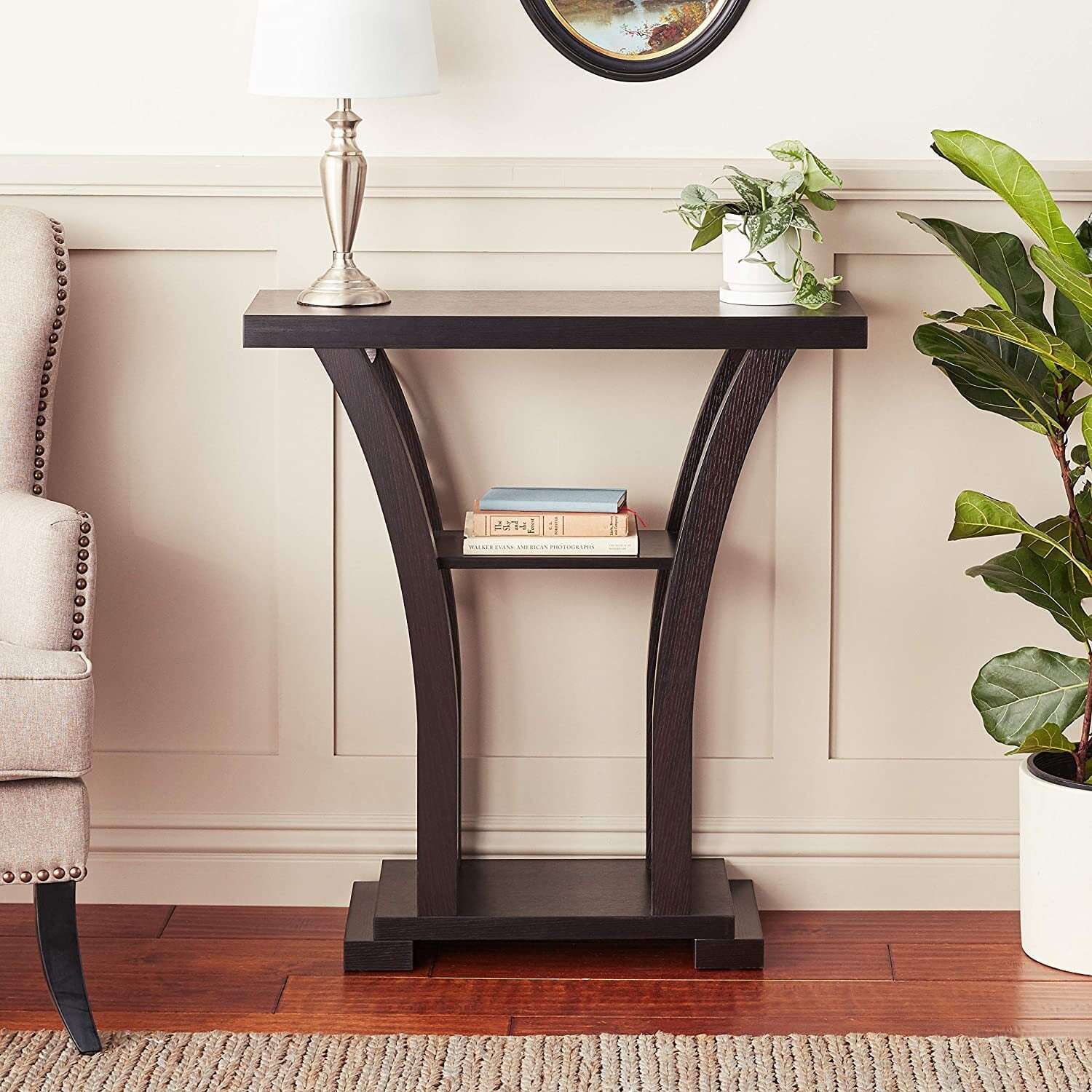 Product Dimensions:34.00″H x 31.06″W x 11.06″D Product Weight:25 Color:Espresso Modern design console table with two shelves. Clean lines and sleek legs gives the table smooth shape. Square feet giving a stacked look Curved table legs for a sleek and smooth look