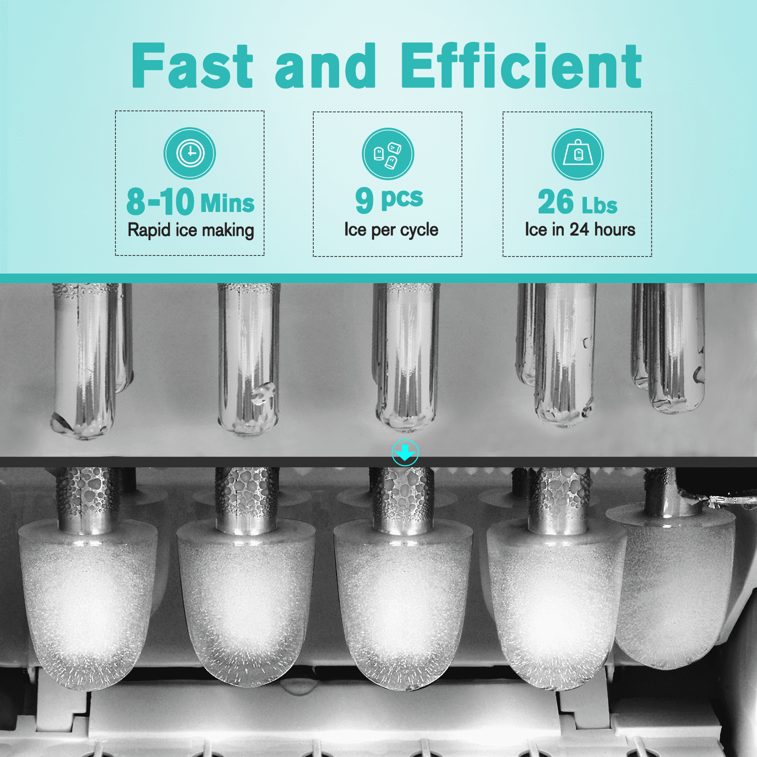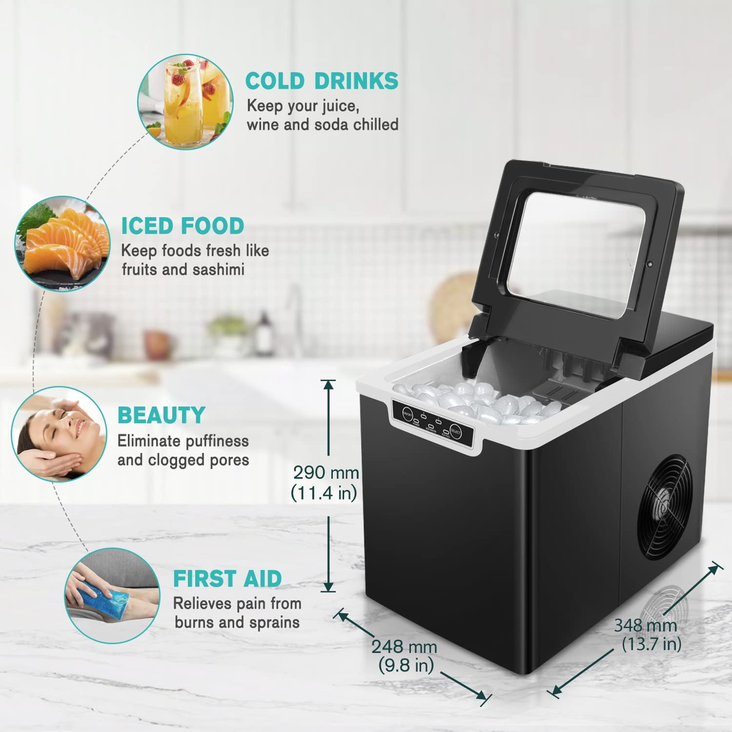 Small and large two sizes ice cube are available, choose the size as per your needs for beverages, smoothies, seafood The high-quality cooling system requires very less energy to cool, save electricity Makes up to 26 lbs. of ice in a day Fast ice making, 9 ice cubes in 7mins Compact size, save the counterspace and can carry it around for anywhere Intuitive control panel, just a simple one touch operation Transparent lid, allows you to see the process inside Automatic cleaning function, which deep cleans all the corners of the ice machine through water circulation Advanced infrared sensor, ice full reminder and water less reminder Water cycle, the melted water goes into water reservoir and transform back into ice Water reservoir capacity: 1.8L Ice basket capacity: 1.3lbs Rated Power: 105W Housing: 304 stainless steel, ABS Package content: 1 x Ice Maker, 1 x Ice Basket, 1 x Ice Scoop