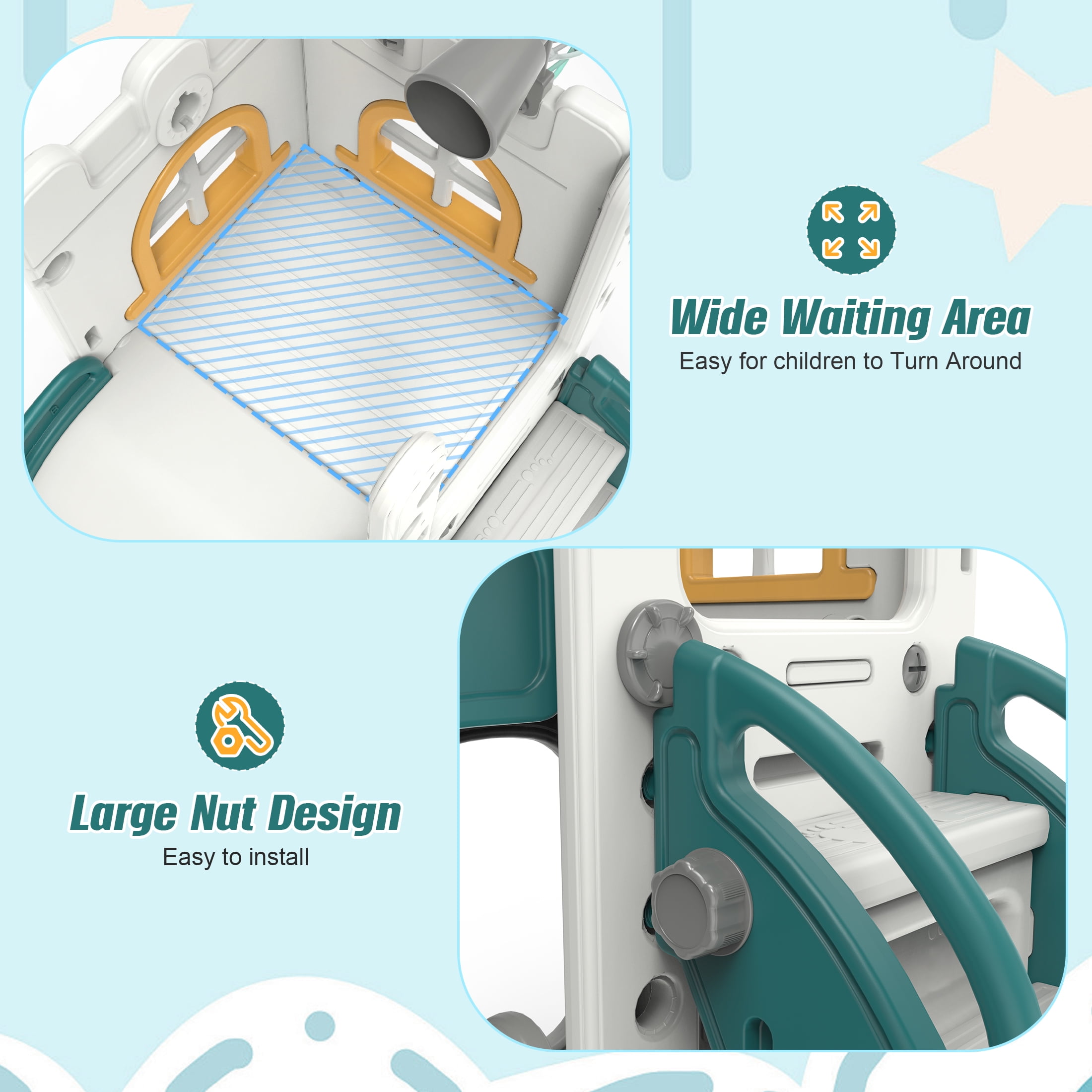 ????Tips – The children’s slide is suitable for indoors, outdoors, backyards or gardens. Please check whether the screws are tightened before use, and tighten them regularly after use. To ensure stability and safety during use, it is recommended to place the slide on a flat ground ????This 6-in-1 toddler toy set provides a slide, a basketball hoop, and even a telescope, supporting children to climb, slide, and play imaginative games indoors and outdoors. The clever design includes space to store basketballs or other toys, suitable for indoor and outdoor use. The toddler play set provides endless opportunities for imaginative play and exploration ✅Safe and Sturdy Material: This toy set is made of non-toxic and odorless HDPE material. The sturdy structure and smooth surface ensure durability and provide a comfortable sliding experience. It can withstand up to 190 pounds and is suitable for most toddlers ????Safety Design: This toddler swing and slide set is equipped with handrails, non-slip pedals, scientific step distances, and a stable base. This design prevents your child’s feet from slipping or getting stuck, thereby reducing the risk of tripping or falling. The baby climber features fully enclosed pedals to avoid the danger of stepping on the ground. ????Easy to Assemble Kids Slide – Assembling this slide is easy even for those with minimal DIY skills. Our slide is lightweight, easy to move, suitable for indoor or outdoor use, and has a sturdy and durable structure