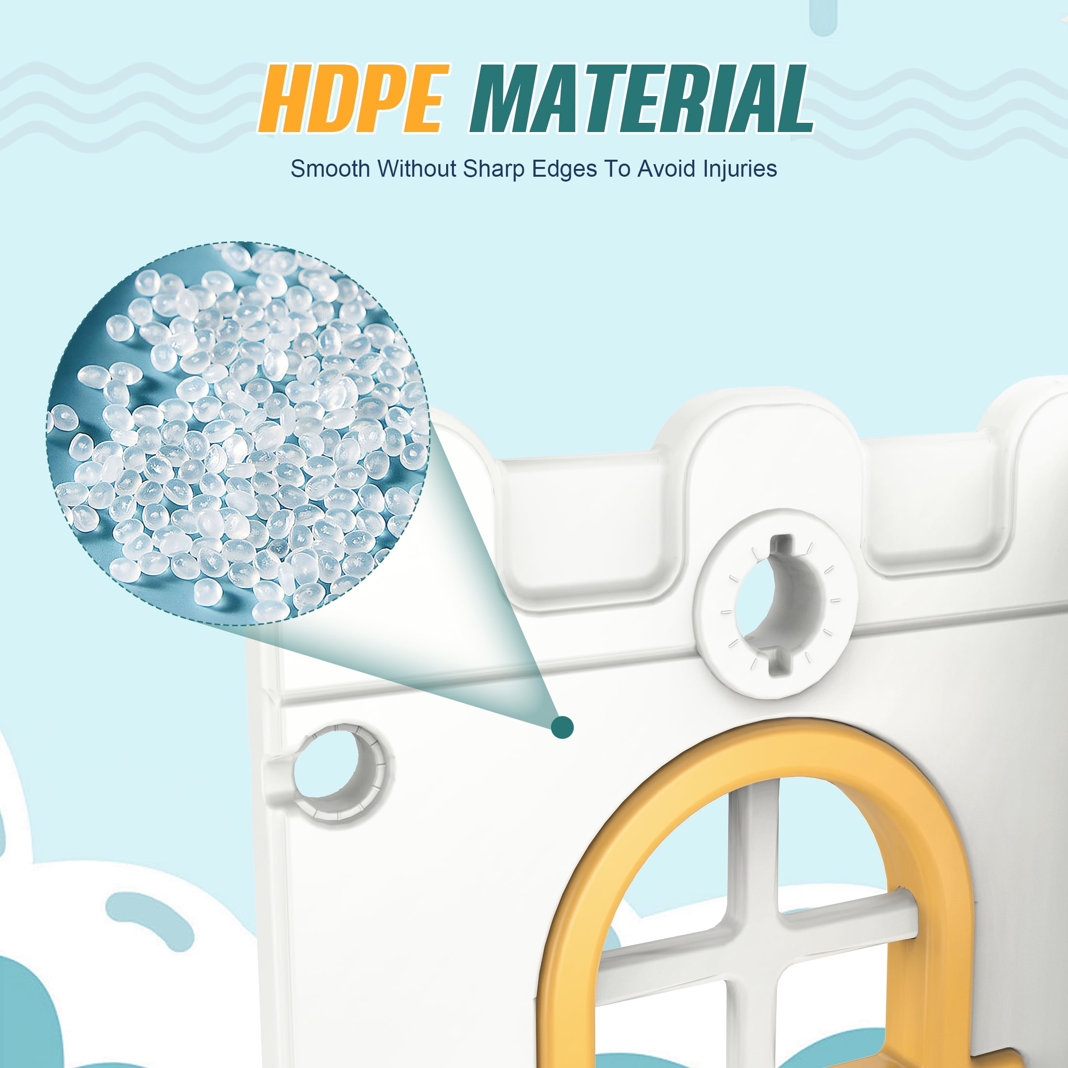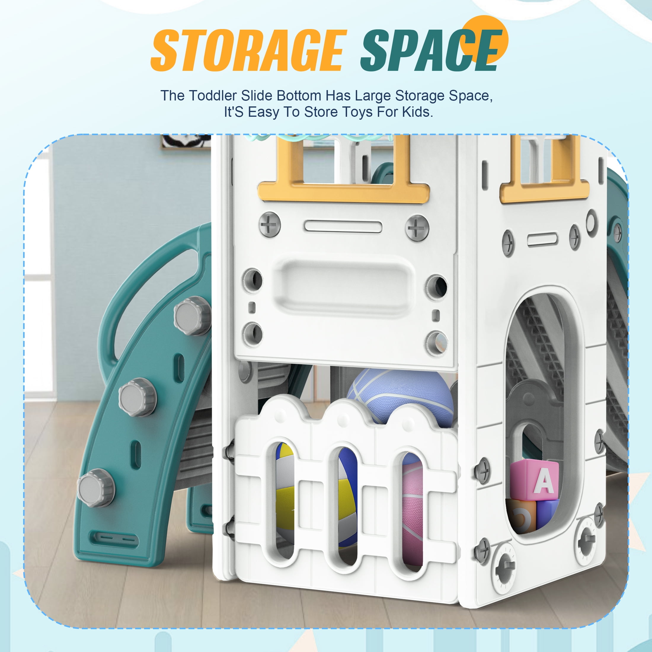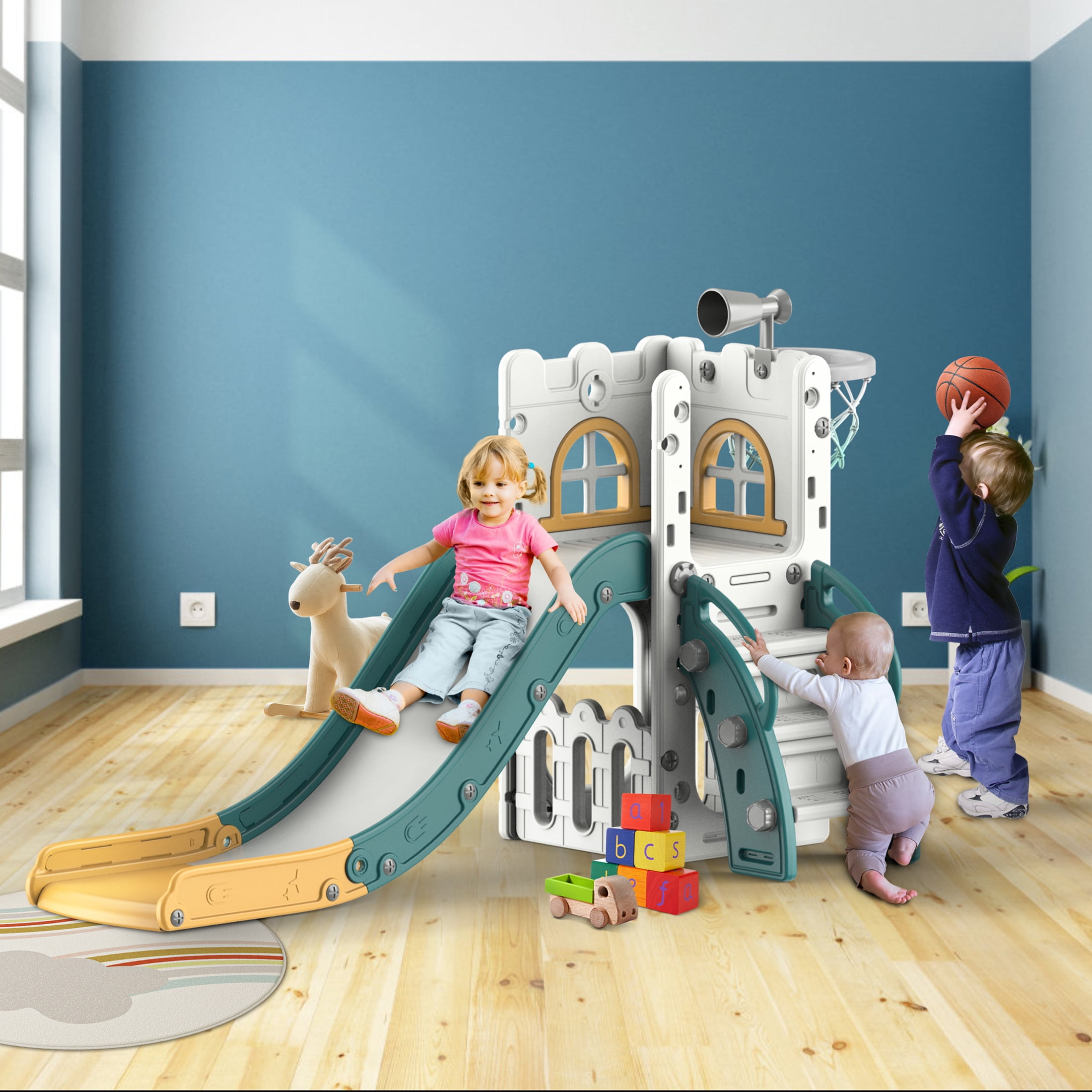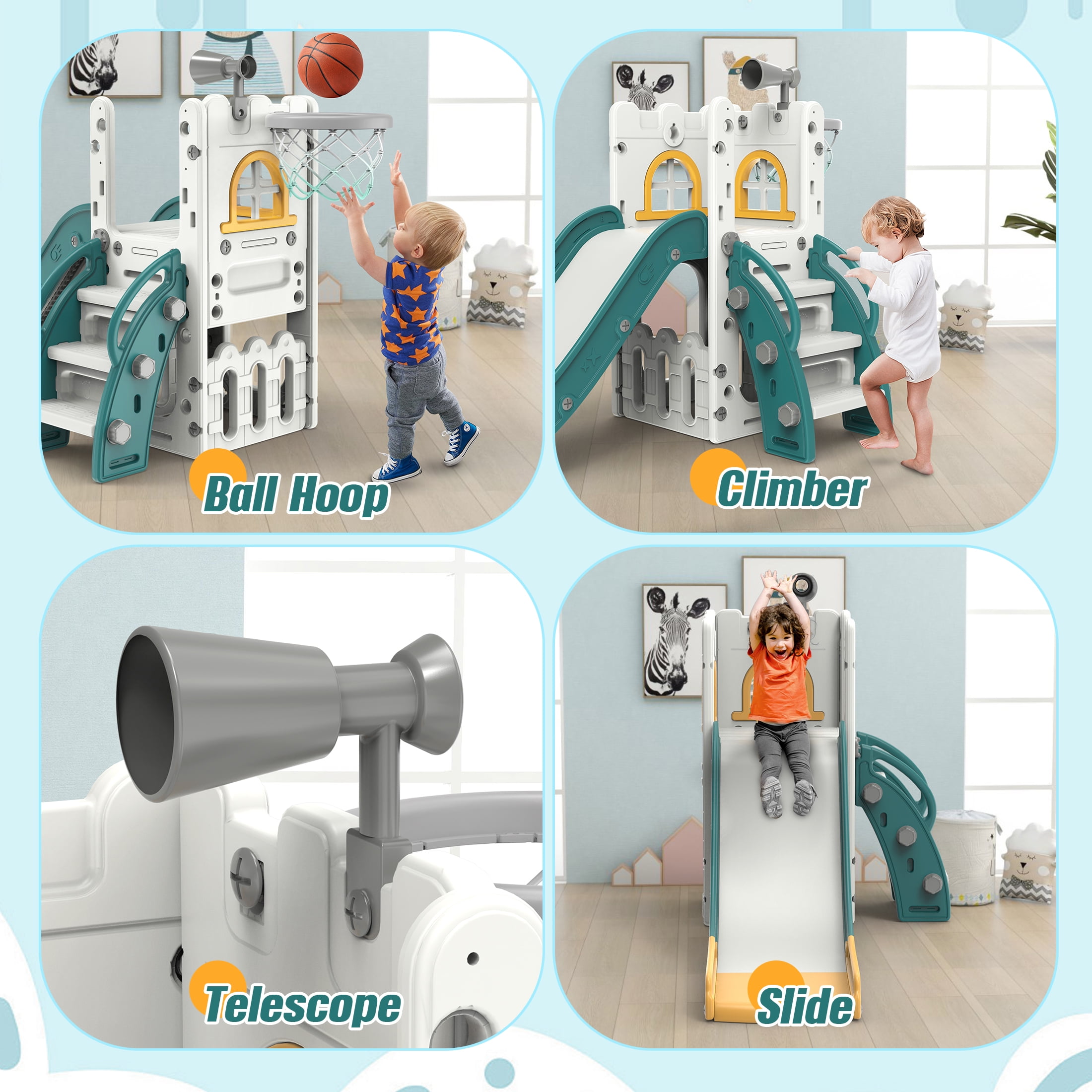 6-in-1 Toddler Slide, Children’s Climbing Slide with Basketball Hoop and Ball, Indoor and Outdoor Backyard Playground Climbing Theme Baby Slide Toy, Suitable for Toddlers Aged 1-3 Climbing and Sliding, Enclosed Shooting Multiple ways to play: Shooting, Hide and Seek, Telescope, Climbing, Slide Always attract the baby’s attention to avoid three-minute heat The slide is an adventure for the baby. While feeling the excitement and speed, the baby also receives basic sports training. The three-section slide has a heightened and lengthened guardrail, and the slide is scientifically divided to enhance the buffering force during sliding, effectively preventing the baby from hurting the little butt. Fully enclosed foot pedal to avoid the risk of missing the pedal Wide and expand the sliding area to create a spacious activity space for the baby Color: yellow-green, blue-gray Material: HDPE Package includes: 1 x children’s slide, 1 x children’s swing, 1 x basketball hoop, 1 x telescope, 1 x storage room 1 x instruction manual