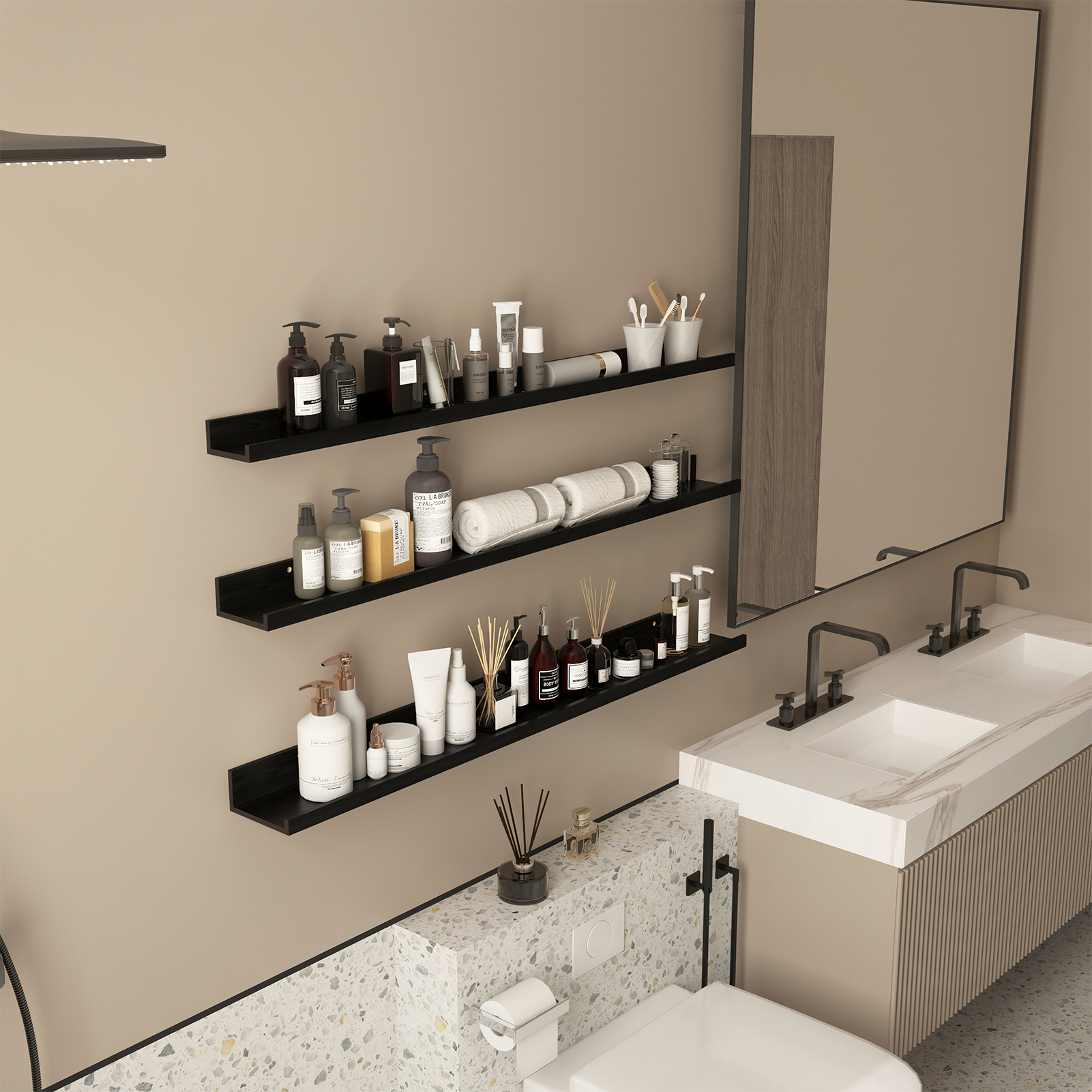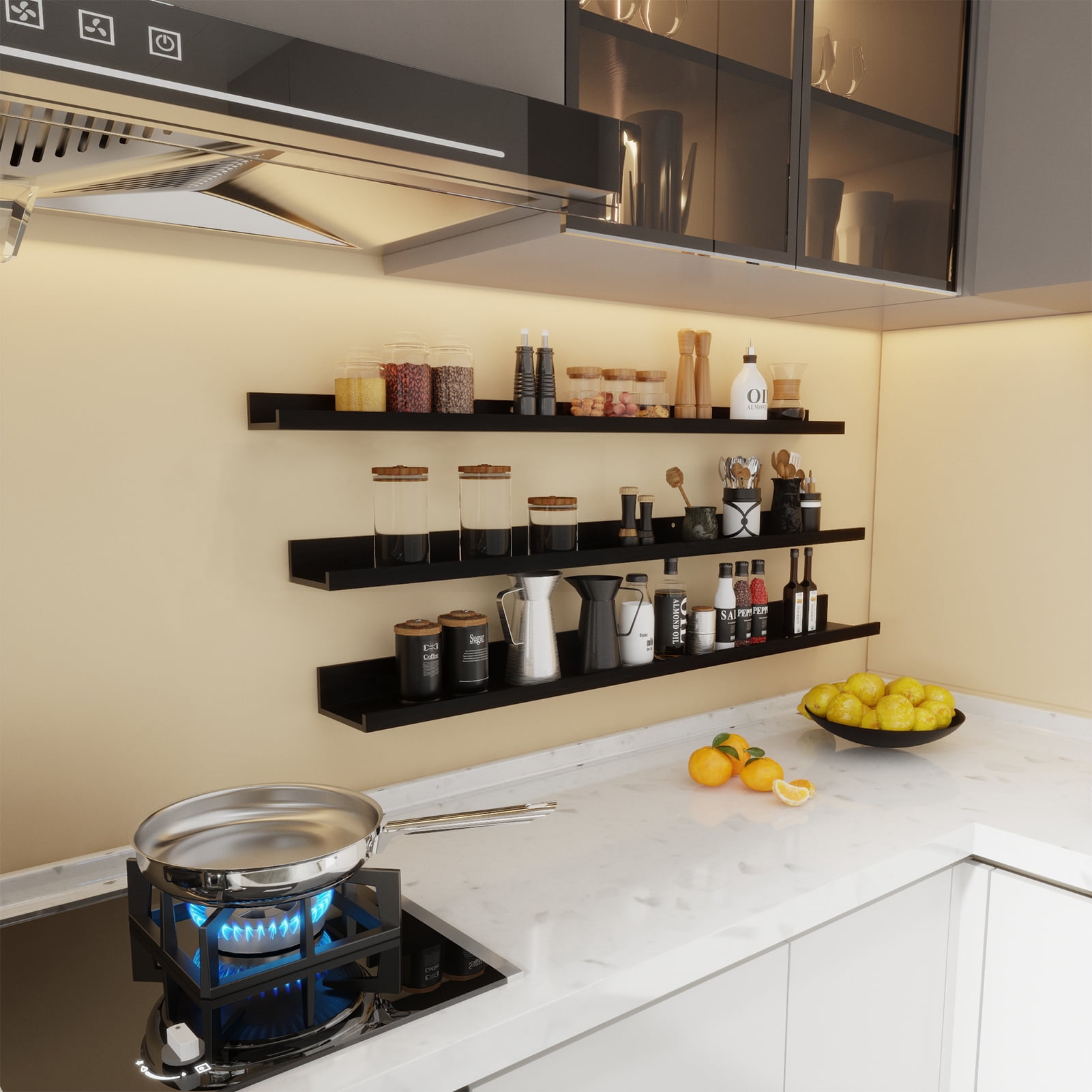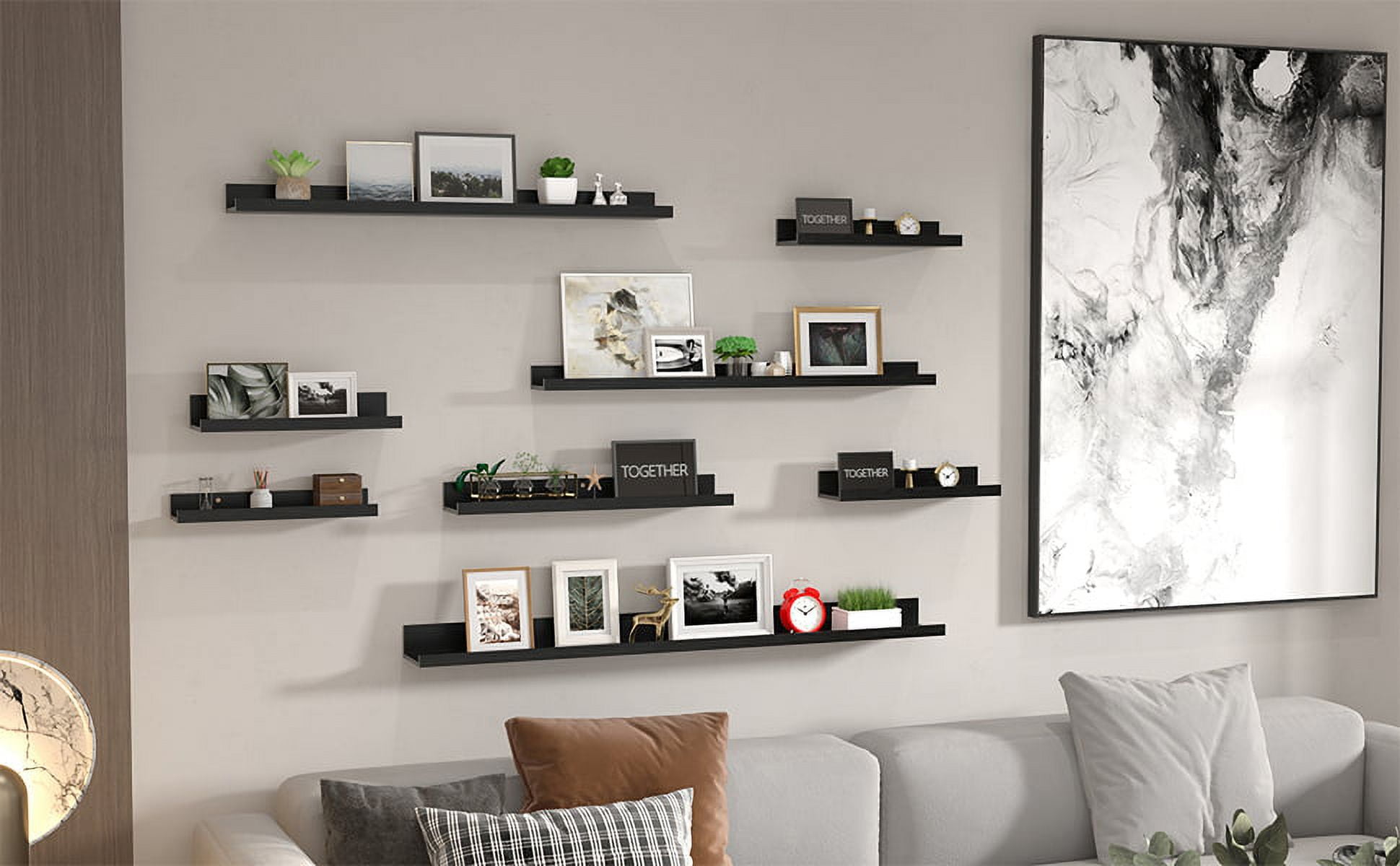 These shelves are over 47 inches long and they have slightly different depth and width dimensions. The overall size is large enough to meet your display or utility purposes. The wall shelves are made of high quality MDF wood. The stylish black wall shelveswith rustic wood grain make them more attractive. They will add a great touch to your arrangement The classic lift lip wall shelves will prevent items from falling or sliding forward. Set of 3 different size shelves, large: 47×4.8×2.6 inches, medium:47×3.9×2.3 inches; small: 47x3x1.9 inches. Package comes with the required hardware including anchors, screws, mini rods, instructions and pre-drilled holes, mounting the long shelves to the wall is easy. These 47-inch wall shelves are perfect for displaying family photos, photo albums, plants,collectibles and memorabilia in bedrooms, living rooms and offices.
