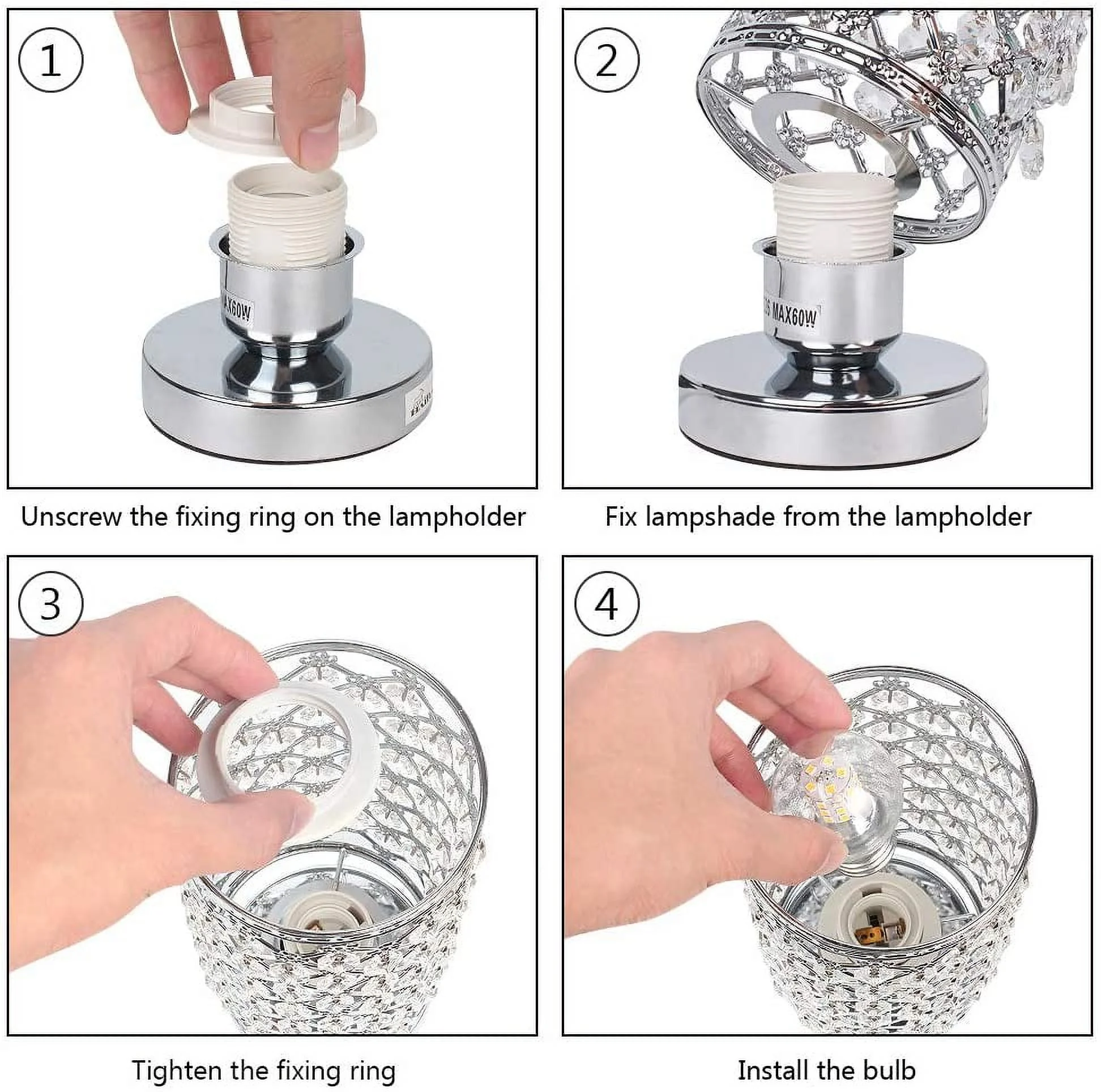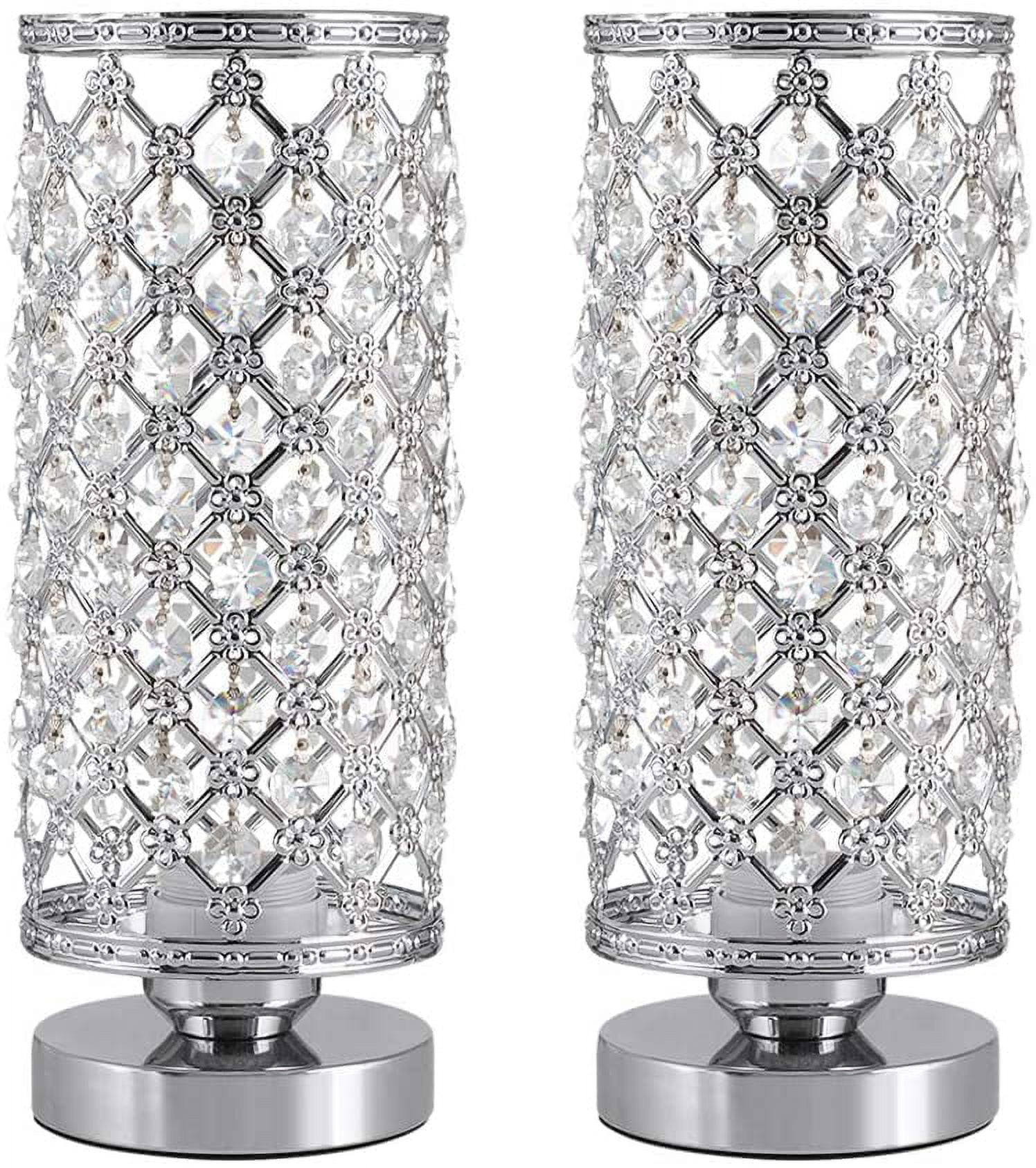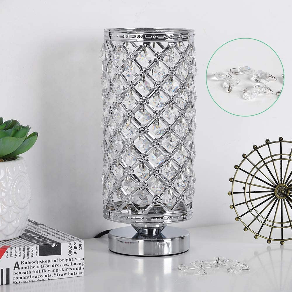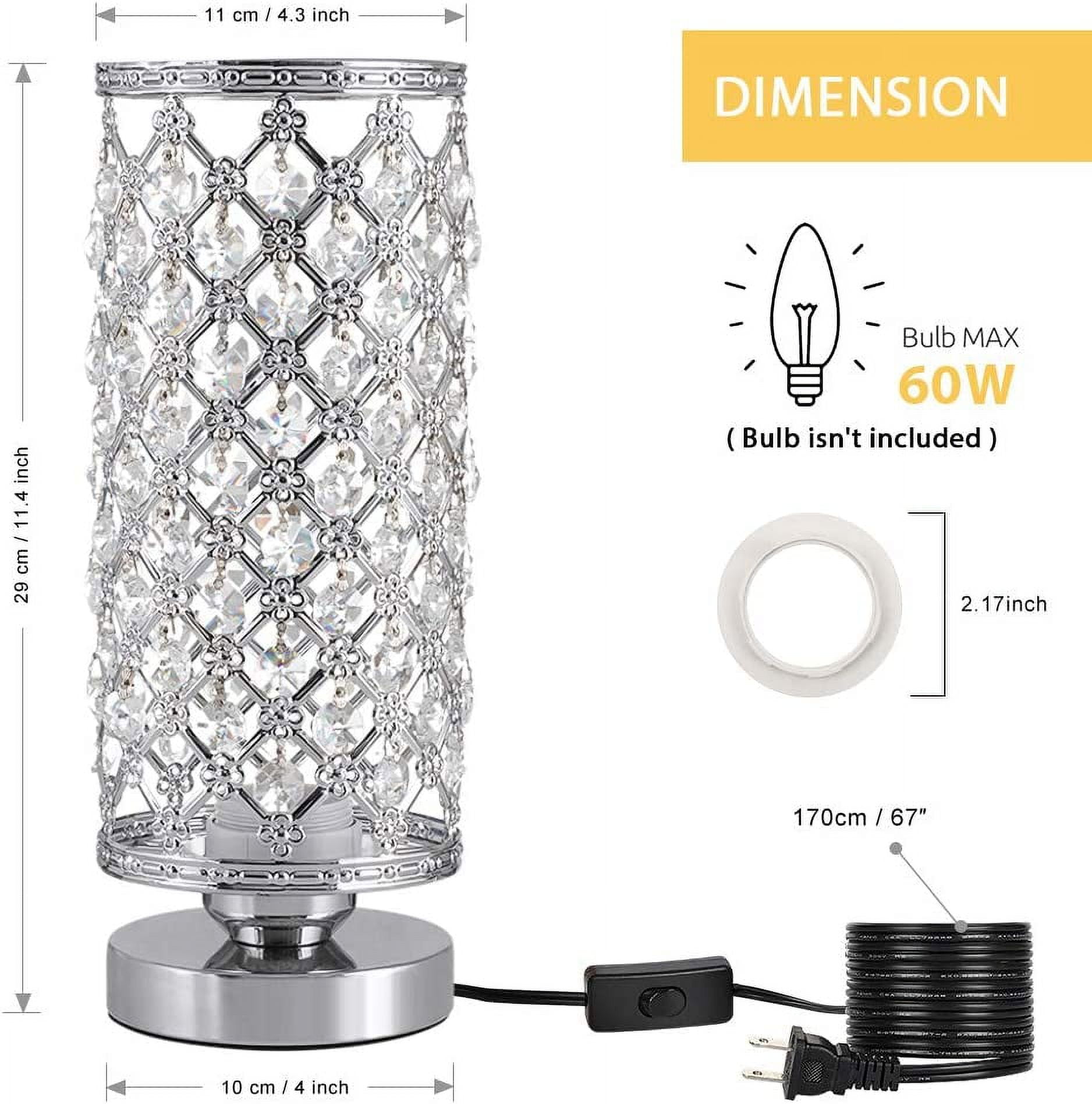 [Ideal Lamp Size] The HAITRAL crystal bedside lamps set are designed to be the best luxurious lamp ever for a luxurious home. [Dimensions] The Lamp’s dimensions are 11.4”(H) x 4.3”(D) x 4”(W) inches diameter, ideal to fit any size table. . The size and the design make this beautiful crystal lamp a splendid accoutrement for a beautiful home. [Beautiful Crystal Cylinder Design] The HAITRAL crystal table lamp is a shiny and beautiful lamp that will fit and elevate the aesthetics of any environment. The beautiful plastic crystals are hung onto the silver lampshade to avoid falling out; it is very stable. It is perfect for dining tables, coffee tables, office, bedrooms, etc. [Luxurious Table Lamp] The luxurious design will bring attention to many visitors and will have them amazed of the beautiful color the small lamp displays and it beautiful clear crystals that will catch visitor’s eyes instantly. This table lamp is easy to clean and maintain. Just wipe it with a dry cloth and this table lamp will look new for years to come. [Safe & Easy to Use] The Cord, Socket and Plug of HAITRAL crystal lamp is listed. By being UL listed, this modern lamp is nationally recognized for its standard of safety. [Bulb] It required an E26 light bulb with a max of 60 Watts. It is compatible with various types of E26 bulbs, such as incandescent, LED, CFL, Halogen and Edison Bulbs.