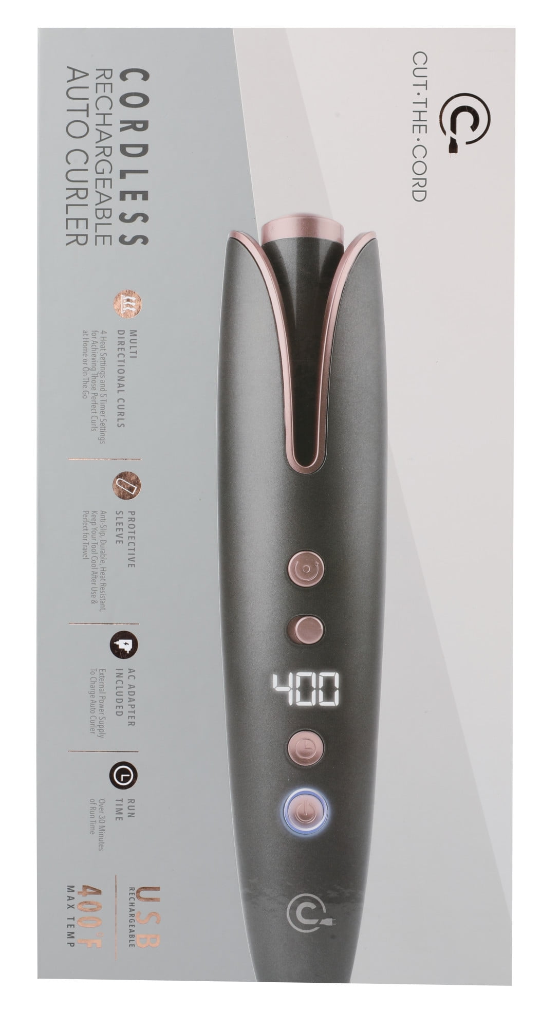 CTC Cordless Auto Curler Goodbye to traditional hair curlers! Say hello to CTC Auto Curler! This auto curler is your new must-have for a quick-touch up or a full day of curls. Get curls you’ll love in a snap while maintaining your healthy hair and works on most hair types. 4 temperature setting up to 400 degree F 5 Timer Settings Multi-directional curl setting for salon-style hair anytime and anywhere 30-45 minutes runtime. Run-time varies depending on the hairstyle and heat setting Matte Finish for Easy Grip, COOL TOUCH AND NO SKIN BURNS Please fully charge before first use Scan QR code on the packaging for video tutorial (how to use this product)