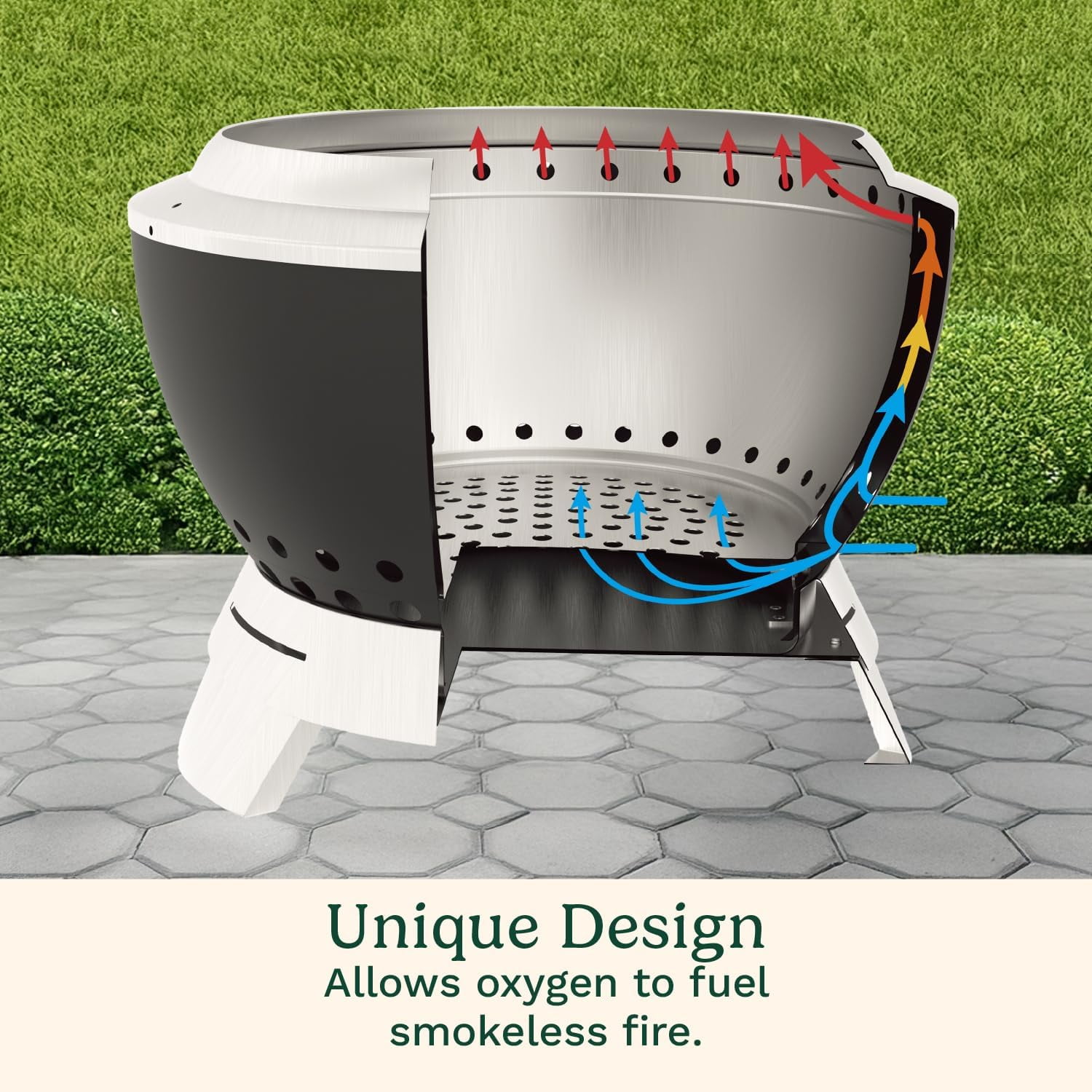 SMOKELESS: Innovative double-wall construction enhances airflow, creating a clean-burning fire with less smoke and high heat output. ENHANCED AIRFLOW: Bottom vents and curved walls improve oxygen flow for fast ignition and efficient burning of wood logs or chunks up to 14″. DURABLE & PORTABLE: Features a carbon steel interior bowl for durability, while the lightweight 20-lb. design makes it easy to transport. EASY CLEANUP: The elevated base and stainless removable base for ash system allows for quick cleanup—just lift the base and empty ashes in seconds. STYLISH & FUNCTIONAL: The sleek, modern design enhances your outdoor space while delivering a clean-burning, cozy fire for patios, backyards, and camping trips.