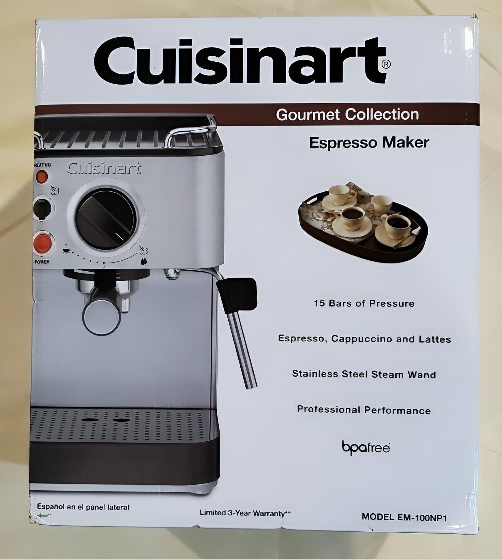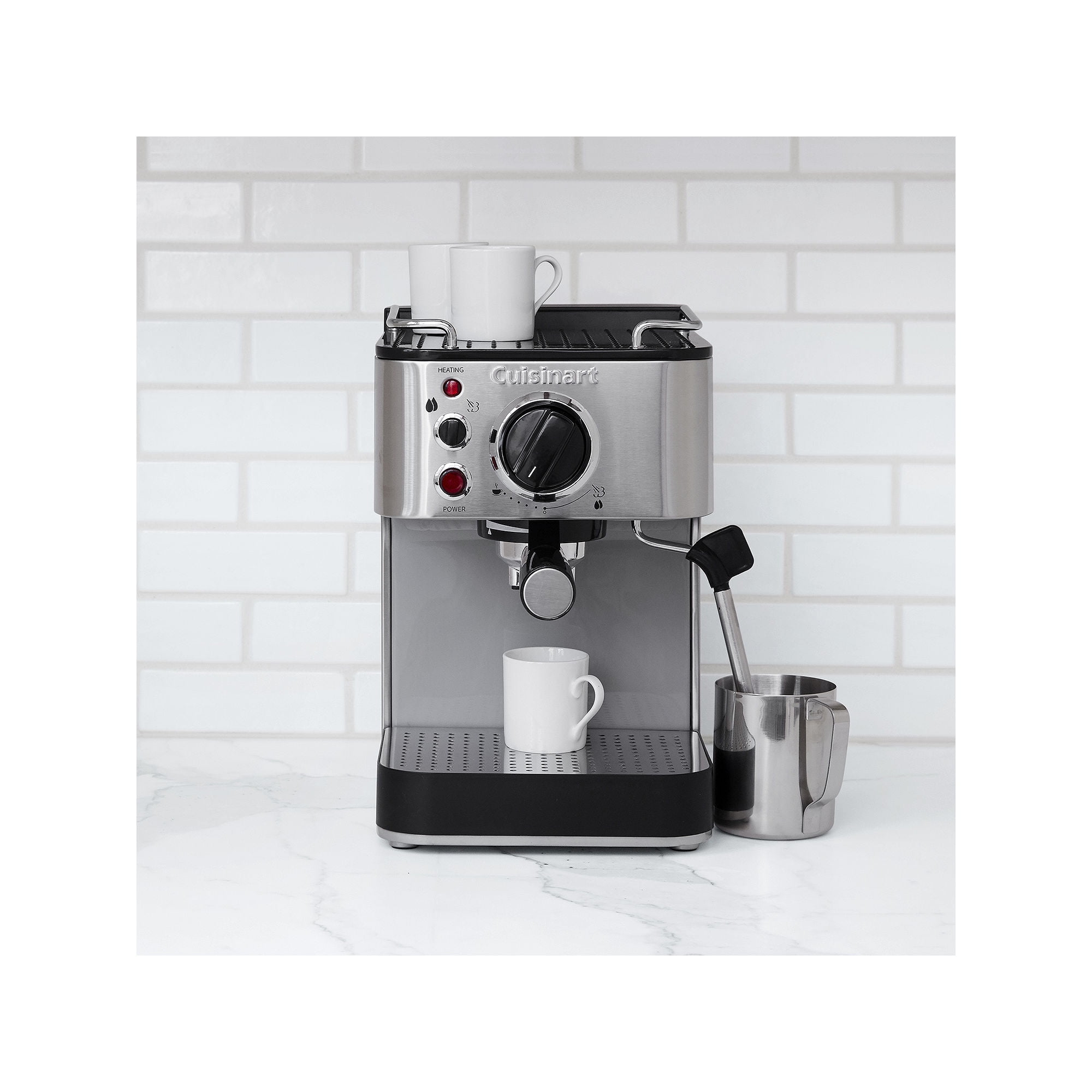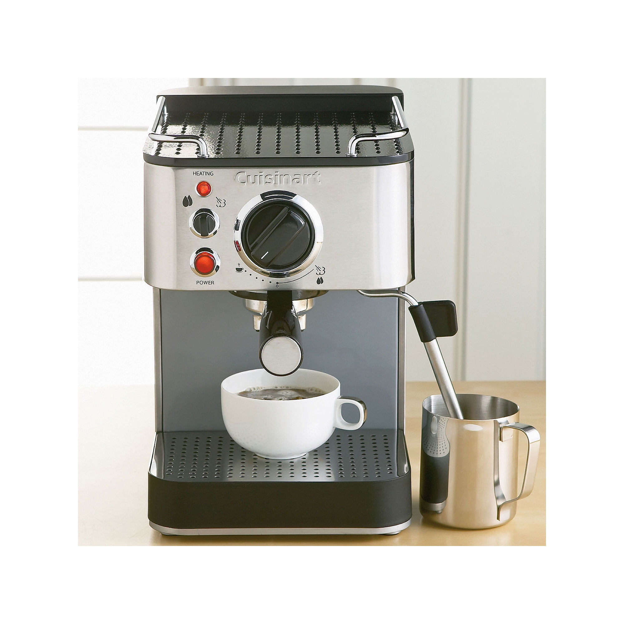 15 bars of pressure 53-ounce removable reservoir Brews one or two cups – ground espresso or pod Professional grade stainless steel housing and embossed Cuisinart® logo Stainless steel steam nozzle for cappuccino and latte Portafilter holder with locking mechanism makes it easy to dispose of wet grounds after use Removable drip tray and cover for easy cleanup Warming tray on top Tamping tool with measuring spoon and stainless frothing cup included BPA Free Limited 3-year warranty