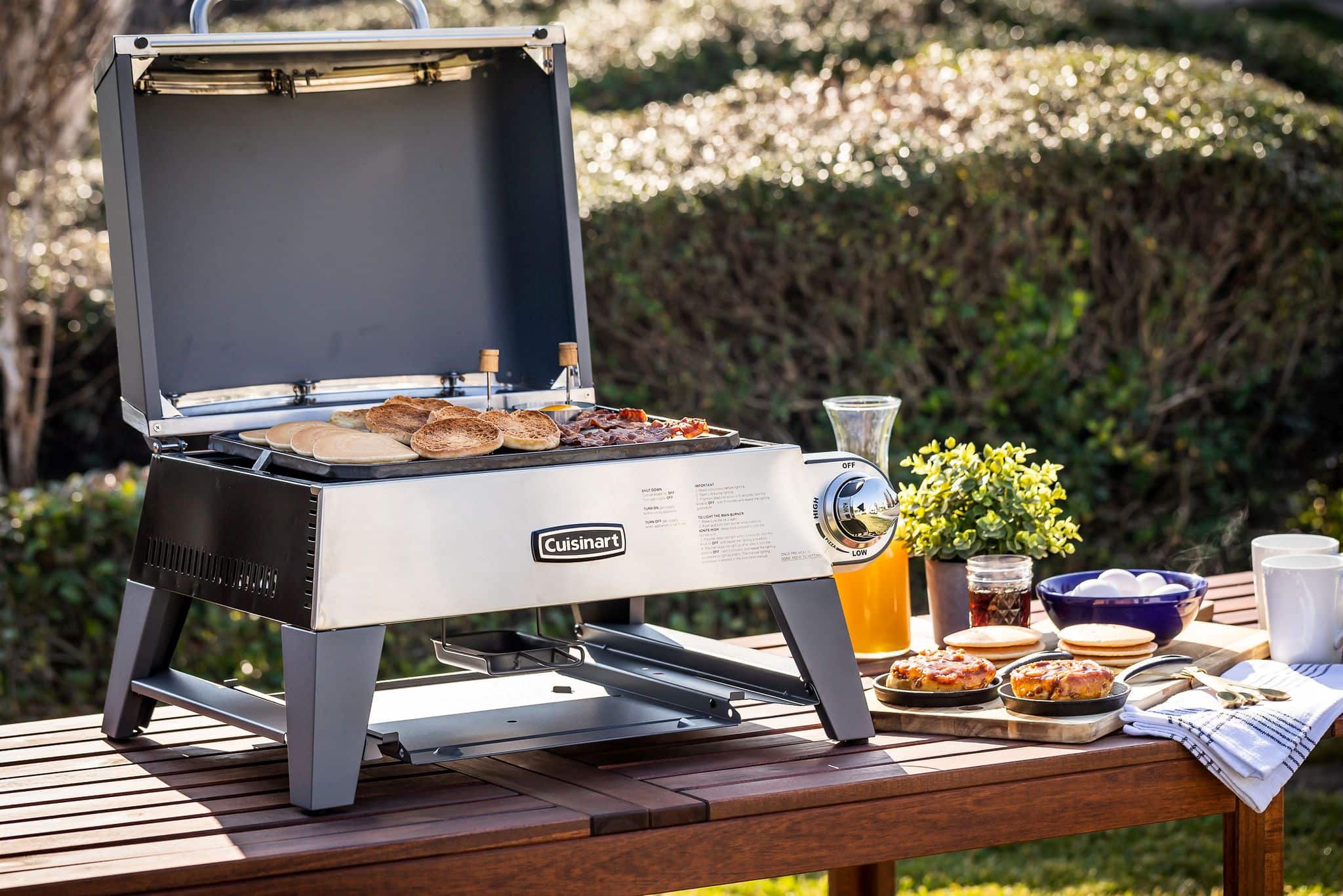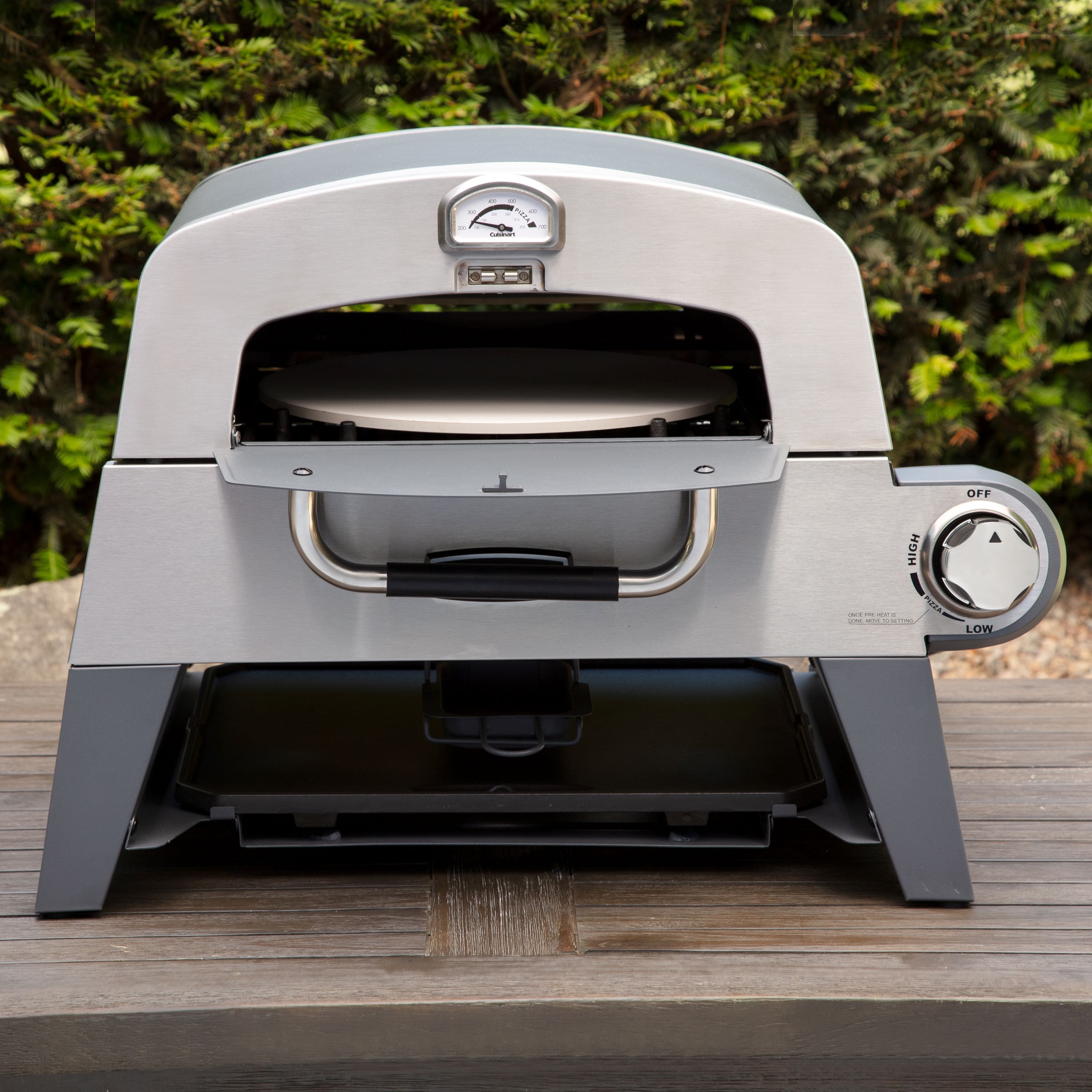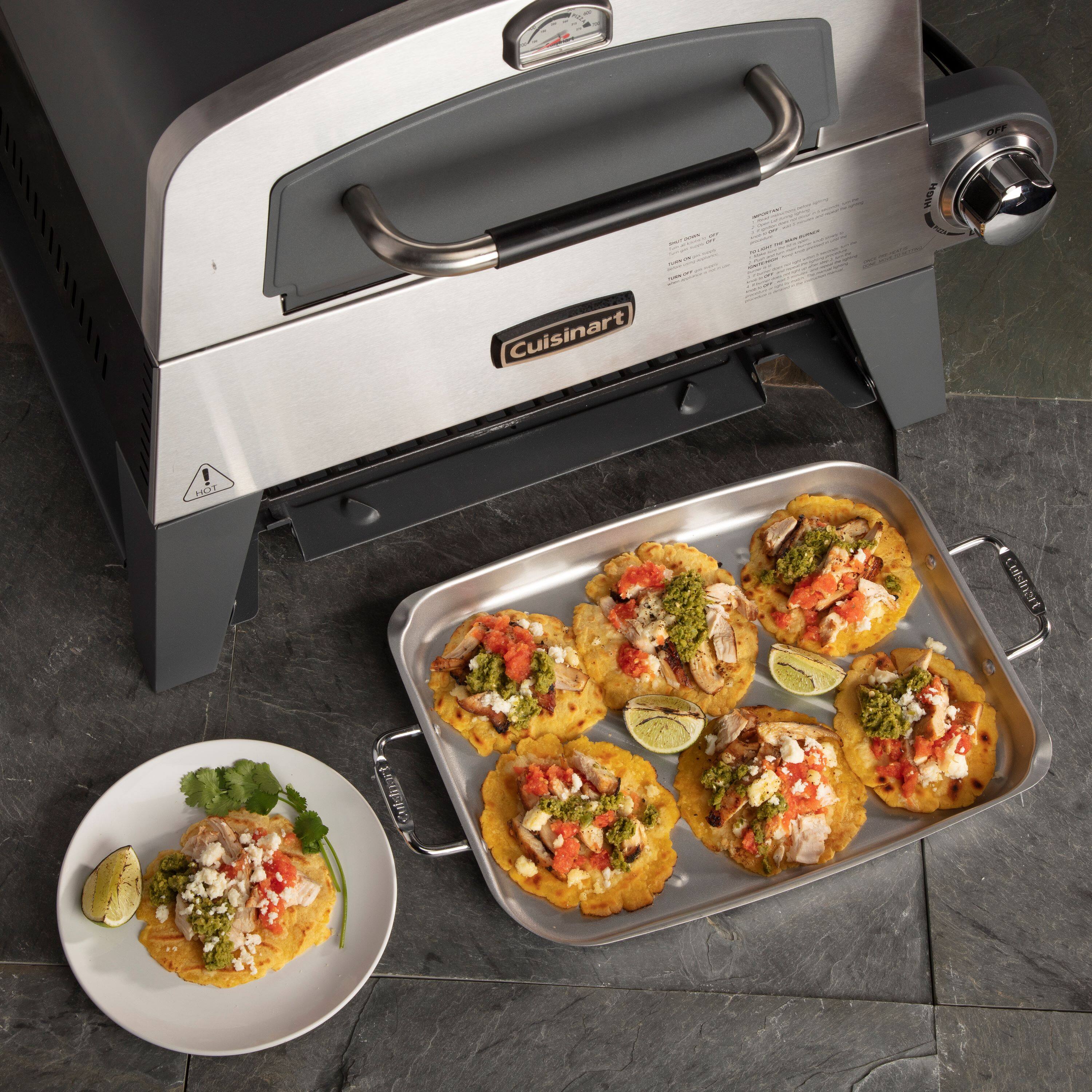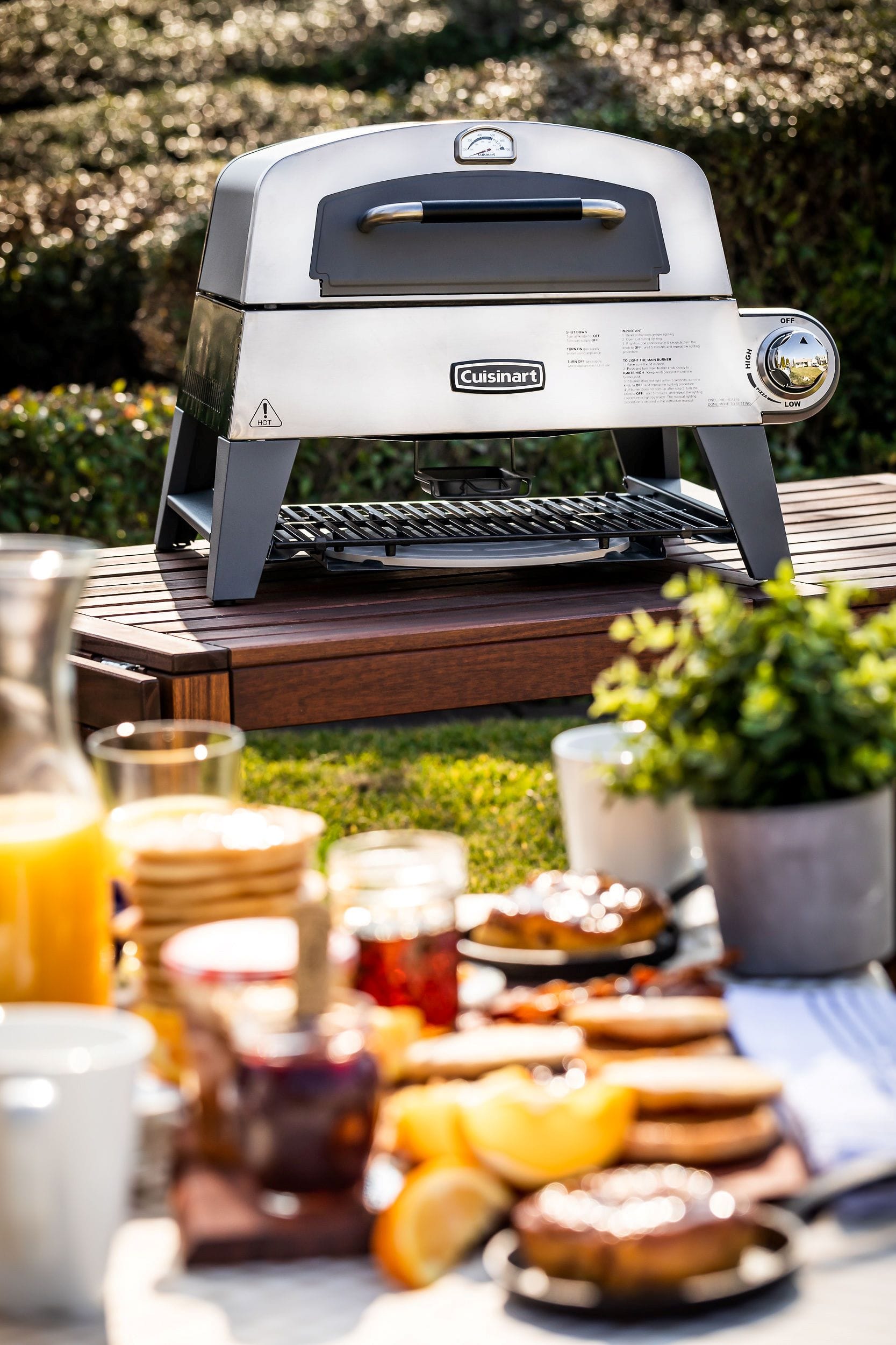 Explore all of the endless possibilities you can create with the Cuisinart 3-in-1 Pizza Oven Plus! This one-of-a-kind unit combines 3 cooking functions in to one appliance; Pizza Oven, Griddle, and Grill. PIZZA OVEN As a pizza oven, the unit features a 13″ cordierite pizza stone which retains and distributes heat evenly across the surface for a perfectly cooked crust every time. The stone is secured by pegs on the bottom of the grill grate that not only keep it centered in the oven, but slightly raise it off the surface to allow for natural convection heat around the pizza. The pre-set pizza temperature setting let’s you cook with confidence knowing you are at the perfect temperature for pizza cooking. The thermometer includes a “Pizza” zone that has a corresponding setting on the dial. Once the thermometer reaches the Pizza zone, simply turn the dial to the pizza setting and you’re ready to cook. GRIDDLE The heavy-duty, cast iron griddle plate offers up to 230 sq. in. of cooking space and gives you the versatility to cook breakfast, lunch, or dinner. The grease drain hole on the griddle plate is located directly above grease cup, so grease is routed directly towards the cup. This significantly cuts down on grease build up and potential flare ups when grilling. GRILL With up to 260 sq. in. of cooking space and a 15,000 BTU burner, this grill can match the performance of any full size unit. The cast iron griddle plate provides maximum heat retention and even heating across the surface. With temperatures reaching over 700° F you’ll be able to get that restaurant-quality sear right at home! DUAL-HINGED LID The dual-hinged lid design features a drop down pizza oven door that allows for easy access in to the oven with minimal heat loss. This allows for a more efficient pizza cooking process. The lid also acts like a standard grill lid, flipping up and down, allowing for greater cooking versatility while griddling and grilling. COOKING SURFACE STORAGE Easily switch to griddle or grill mode by simply swapping out the cooking surface for whatever function you want to use. When not in use, all of the cooking surfaces neatly pack away on the storage shelf below, keeping all components together. The travel-friendly design of the 3-in-1 Pizza Oven Plus allows you to easily pack it in to the trunk of your car and will be the star of your next BBQ, tailgate, or camping trip! With all of this cooking versatility, you’re going to need the fuel to keep up. That’s why the 3-in-1 Pizza Oven Plus comes equipped with a gas hose for a 20 pound propane tank, so you can keep on cooking throughout the day! The Cuisinart 3-in-1 Pizza Oven Plus will make you re-think what is possible when cooking outdoors!