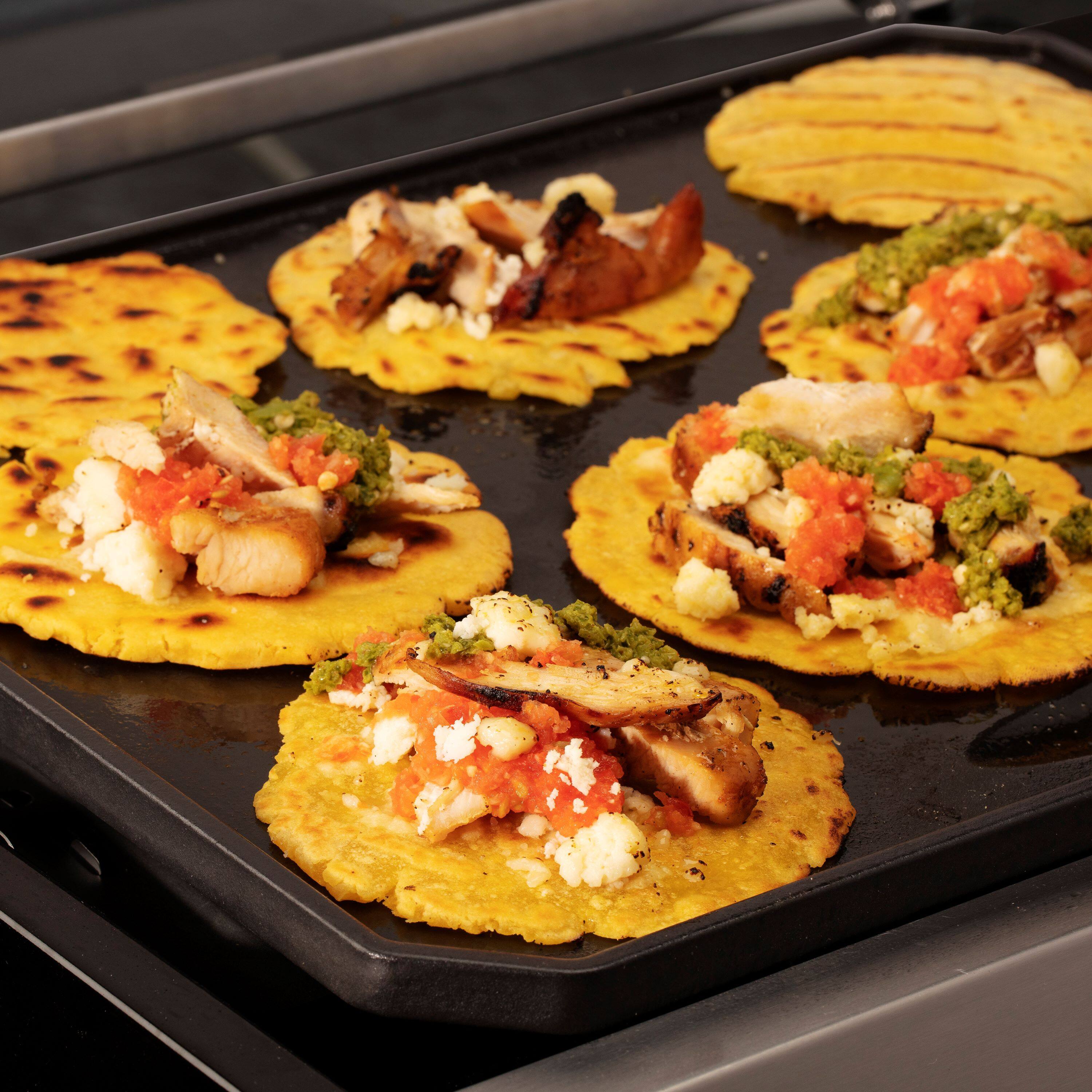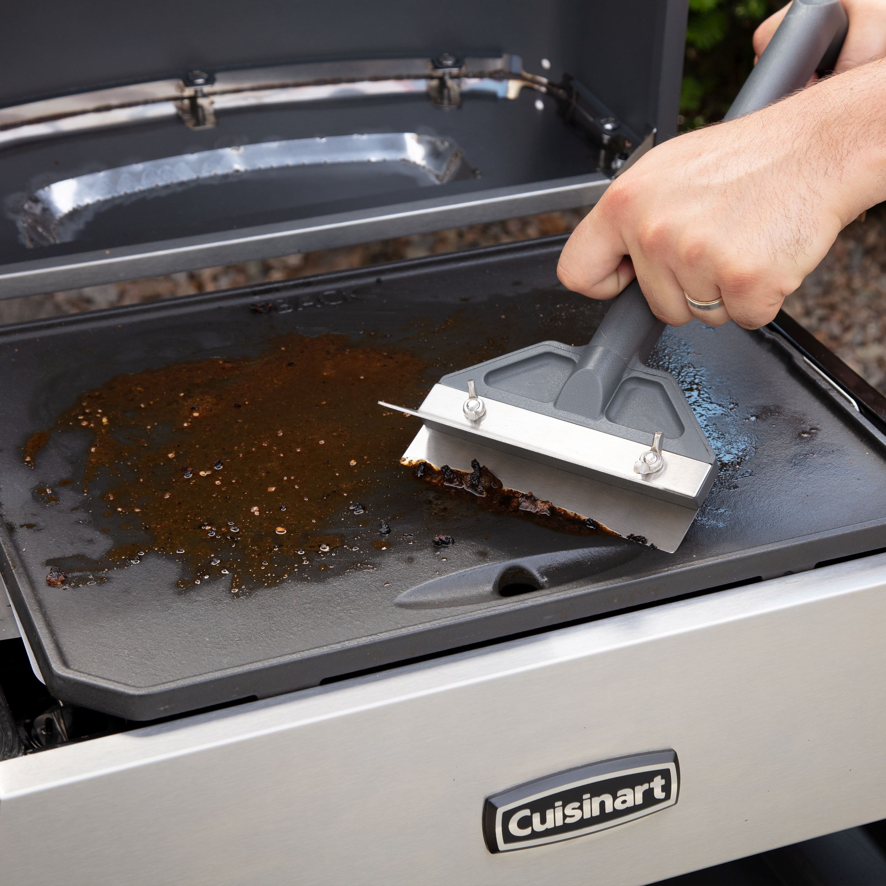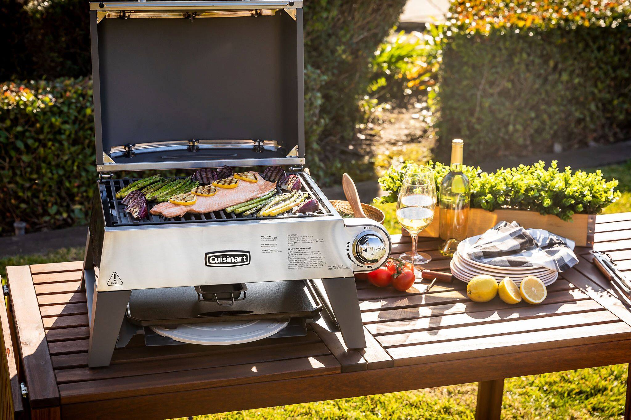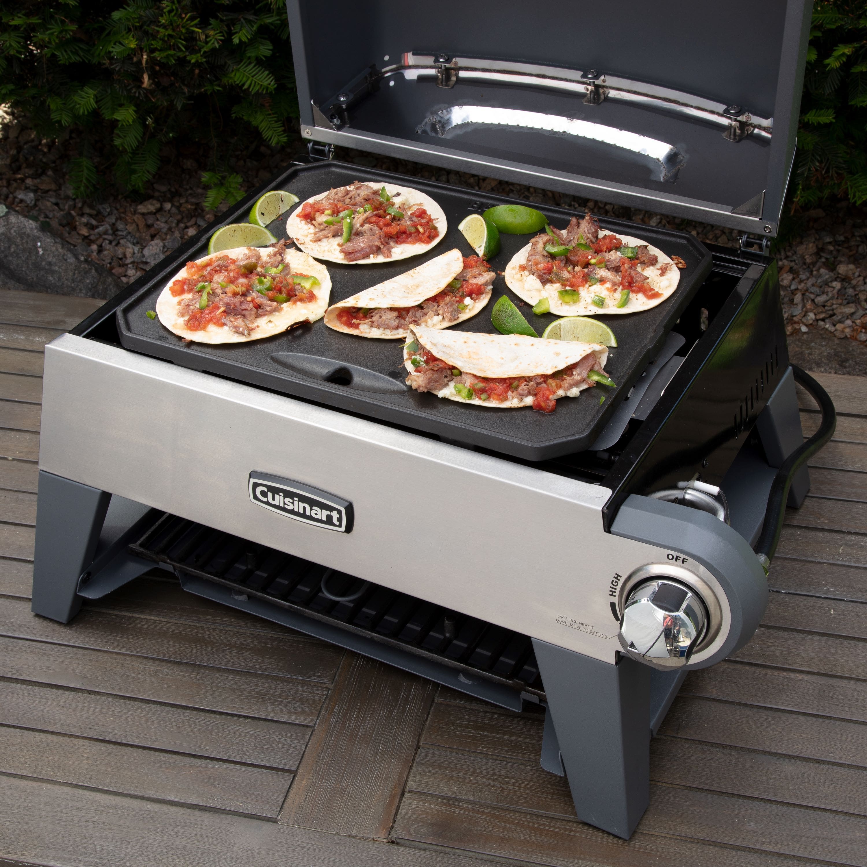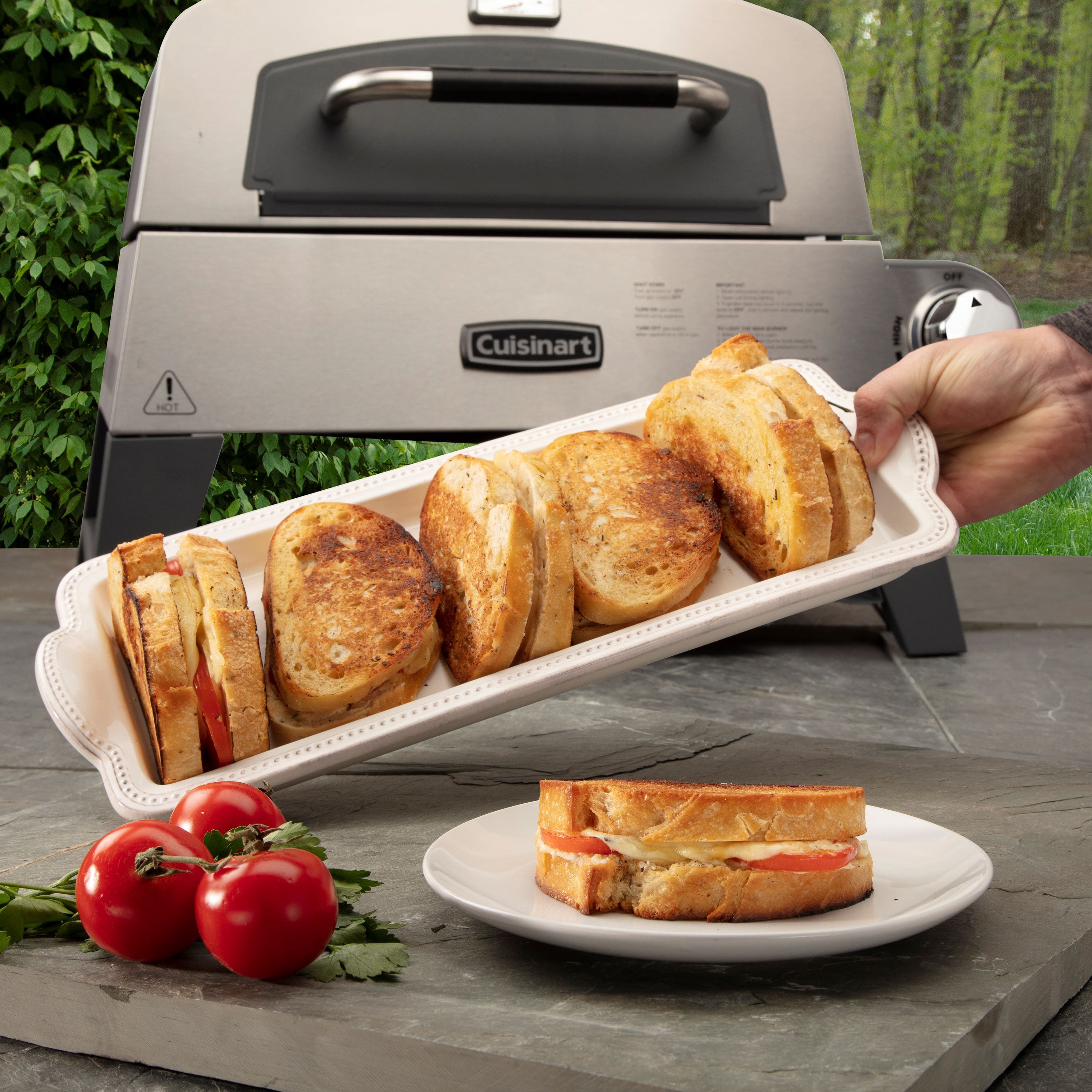 Explore all of the endless possibilities you can create with the Cuisinart 3-in-1 Pizza Oven Plus! This one-of-a-kind unit combines 3 cooking functions in to one appliance; Pizza Oven, Griddle, and Grill. PIZZA OVEN As a pizza oven, the unit features a 13″ cordierite pizza stone which retains and distributes heat evenly across the surface for a perfectly cooked crust every time. The stone is secured by pegs on the bottom of the grill grate that not only keep it centered in the oven, but slightly raise it off the surface to allow for natural convection heat around the pizza. The pre-set pizza temperature setting let’s you cook with confidence knowing you are at the perfect temperature for pizza cooking. The thermometer includes a “Pizza” zone that has a corresponding setting on the dial. Once the thermometer reaches the Pizza zone, simply turn the dial to the pizza setting and you’re ready to cook. GRIDDLE The heavy-duty, cast iron griddle plate offers up to 230 sq. in. of cooking space and gives you the versatility to cook breakfast, lunch, or dinner. The grease drain hole on the griddle plate is located directly above grease cup, so grease is routed directly towards the cup. This significantly cuts down on grease build up and potential flare ups when grilling. GRILL With up to 260 sq. in. of cooking space and a 15,000 BTU burner, this grill can match the performance of any full size unit. The cast iron griddle plate provides maximum heat retention and even heating across the surface. With temperatures reaching over 700° F you’ll be able to get that restaurant-quality sear right at home! DUAL-HINGED LID The dual-hinged lid design features a drop down pizza oven door that allows for easy access in to the oven with minimal heat loss. This allows for a more efficient pizza cooking process. The lid also acts like a standard grill lid, flipping up and down, allowing for greater cooking versatility while griddling and grilling. COOKING SURFACE STORAGE Easily switch to griddle or grill mode by simply swapping out the cooking surface for whatever function you want to use. When not in use, all of the cooking surfaces neatly pack away on the storage shelf below, keeping all components together. The travel-friendly design of the 3-in-1 Pizza Oven Plus allows you to easily pack it in to the trunk of your car and will be the star of your next BBQ, tailgate, or camping trip! With all of this cooking versatility, you’re going to need the fuel to keep up. That’s why the 3-in-1 Pizza Oven Plus comes equipped with a gas hose for a 20 pound propane tank, so you can keep on cooking throughout the day! The Cuisinart 3-in-1 Pizza Oven Plus will make you re-think what is possible when cooking outdoors!