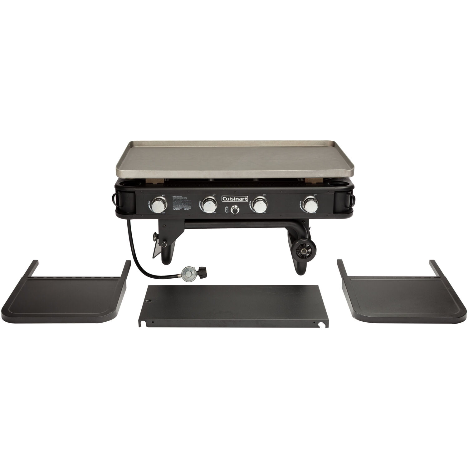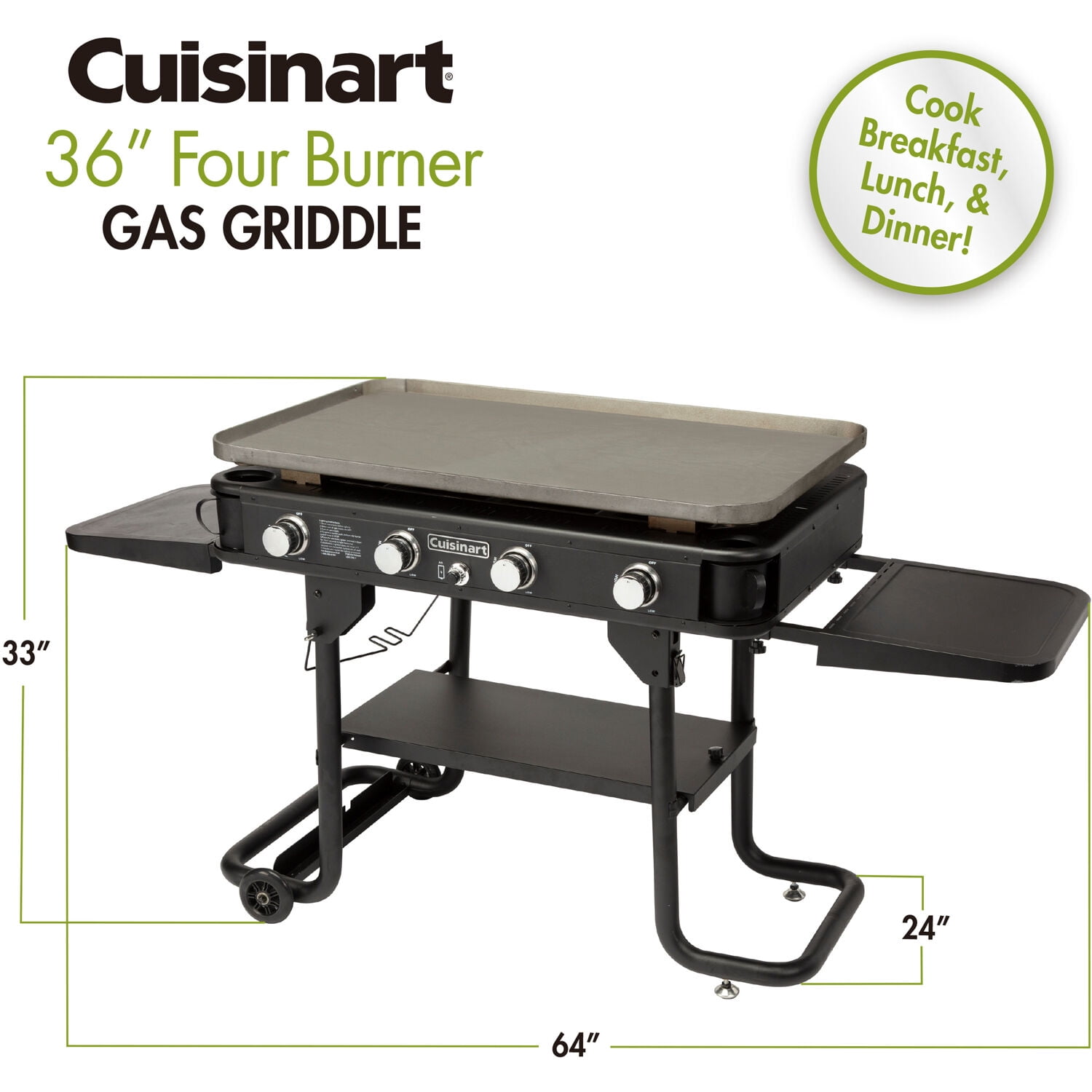 COOKING SPACE: The griddle features a cold-rolled steel cooking surface that provides 760 square inches of cooking space DUAL GREASE MANAGEMENT SYSTEM: The two front grease cups allow you to easy manage and remove grease from the cooking area COOKING POWER: The 4 independently controlled burners provide 15,000 BTUs each, 60,000 total FOLDING DESIGN: The griddle easily folds down compactly for storage and transport 36-in 4-burner gas griddle Features a cold-rolled steel cooking surface that provides 760 square inches of cooking space Two front grease cups allow you to easy manage and remove grease from the cooking area 4 independently controlled burners provide 15,000 BTUs each, 60,000 total Two wheels for easy movement Leveling feet allow for use on uneven surfaces Easily folds down compactly for storage and transport